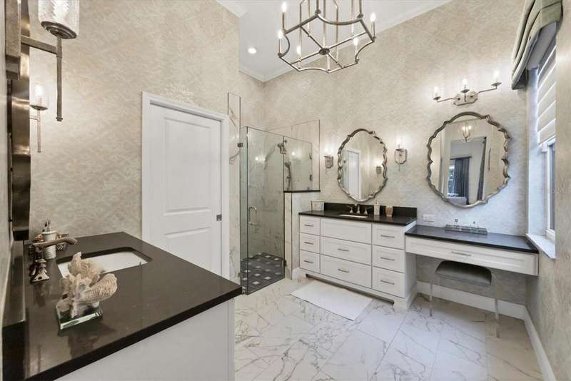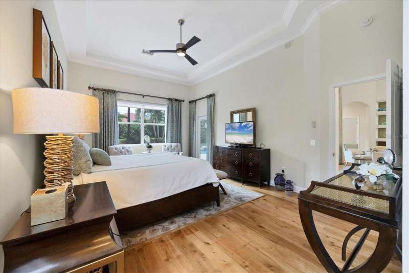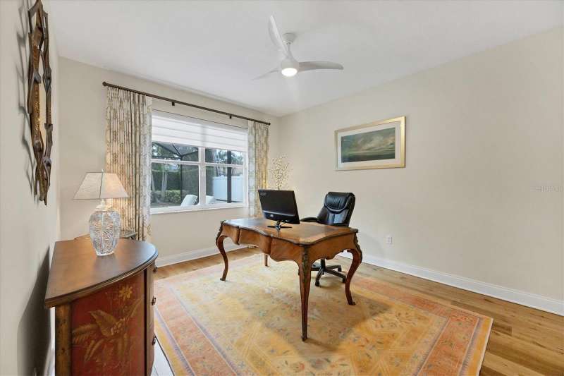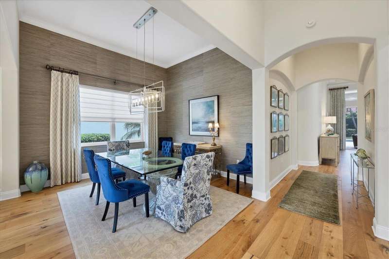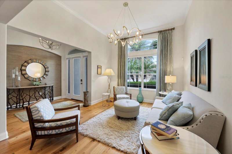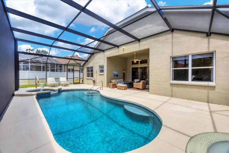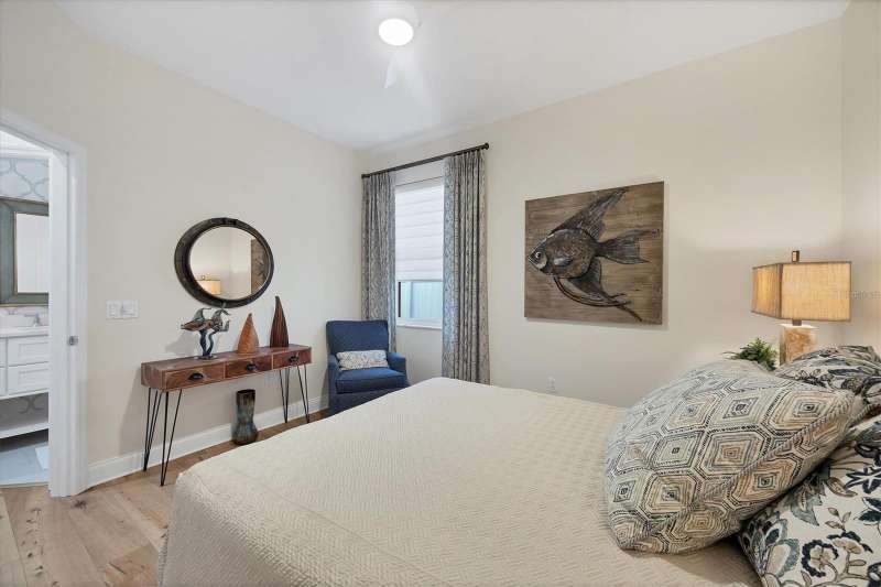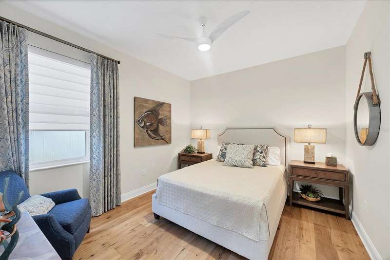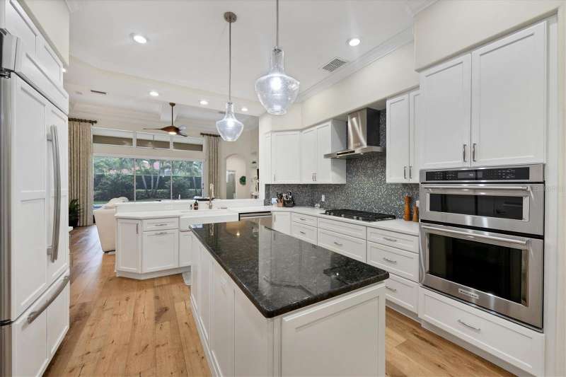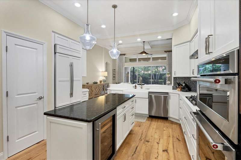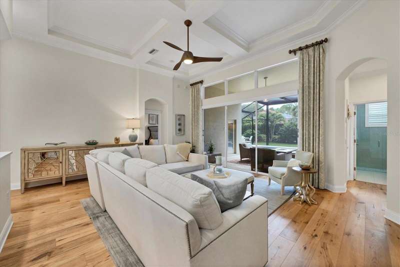 Absolutely Impeccable Designer Home in Edgewater Village! Step into this exquisite four-bedroom, three-bath residence, where every detail exudes sophistication. Featuring European French Oak flooring, custom window treatments, designer finishes and natural light throughout, this home offers both elegance and comfort. The chef’s kitchen offers an all-white cabinetry design, a modern gas cooktop, convenient beverage center, custom panel refrigerator - all with a spacious layout and perfect for cooking and gatherings. Designed for entertaining, this home boasts a large lanai with a sparkling pool, relaxing hot tub, fireplace and a panoramic pool cage for unobstructed views and privacy. The executive primary retreat is a sanctuary with a custom walk-in closet, intricate ceiling details, and a luxuriously appointed primary bath. With an ideal split floor plan, the three additional bedrooms and baths are equally well-appointed and complete with designer wall coverings and window treatments. In addition, you will have complete peace of mind with a Brand-new Generac full house generator! Adding all this to an immaculate three-car garage with built in cabinets and workspace. Located within the gated community of Edgewater Village, residents enjoy a LOW HOA FEE and are just a short walk away from dinner and a movie in downtown Lakewood Ranch! An exceptional property in all categories! Interior furnishings are available for purchase as a package, making this home move in ready!