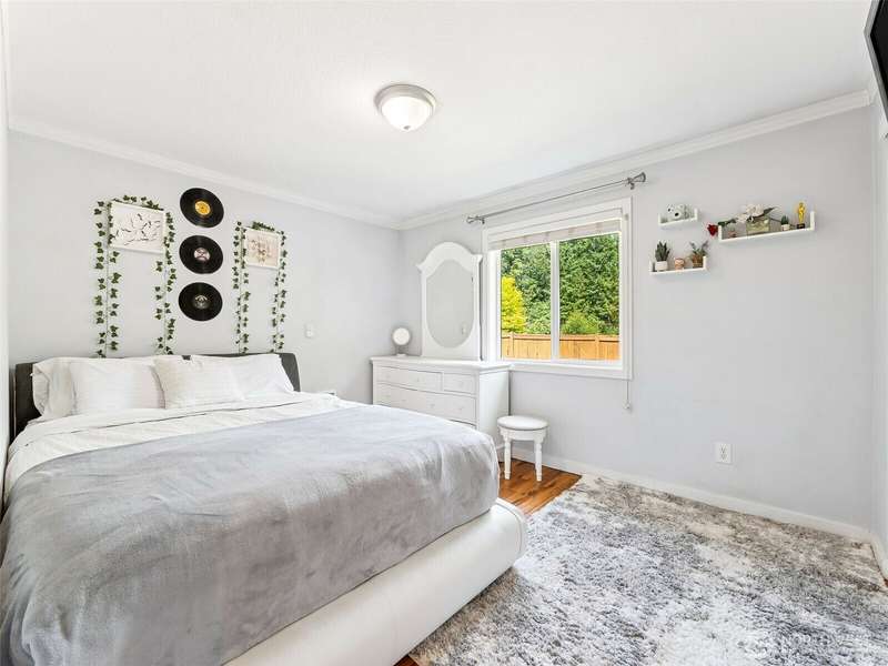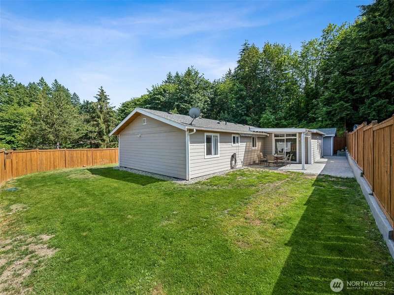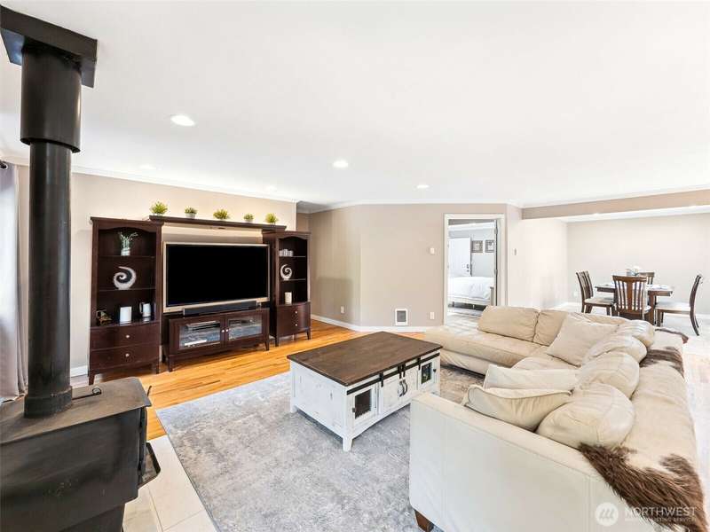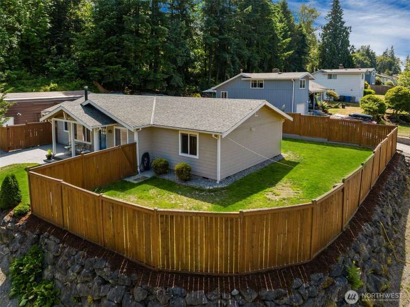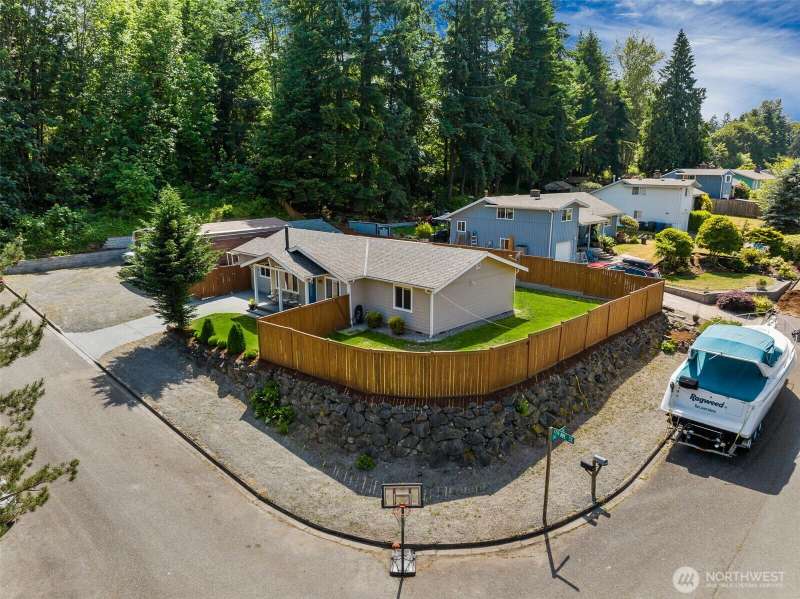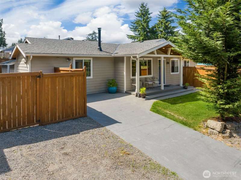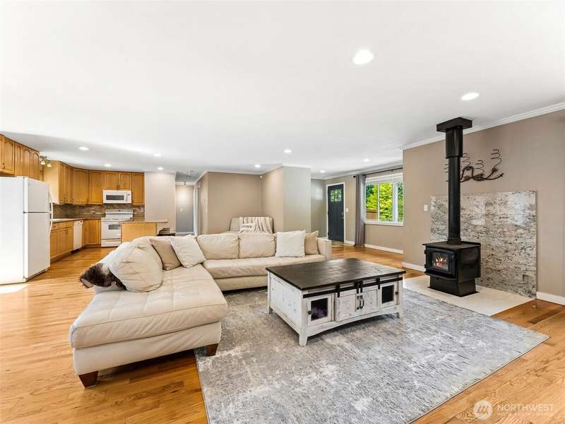 Beautifully updated rambler on a spacious corner lot at the end of a quiet dead-end street in the award-winning Issaquah School District. This home features an open layout with skylights and red oak hardwoods throughout. The living room centers around a wood-burning fireplace insert that heats the entire home. The remodeled kitchen boasts granite counters, center island, and quality cabinetry. Offers 3 bedrooms (2 plus bonus), including a serene primary suite with ¾ ensuite and sauna. Updated baths with new vanities, tile showers, and crown molding. Fully fenced backyard with mountain views, stamped concrete patio, and privacy. Detached garage/shop, RV/boat parking, and generator hookups. Minutes to HWY 169, I-405, and The Landing.