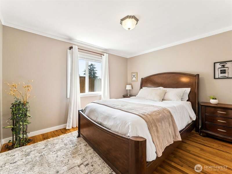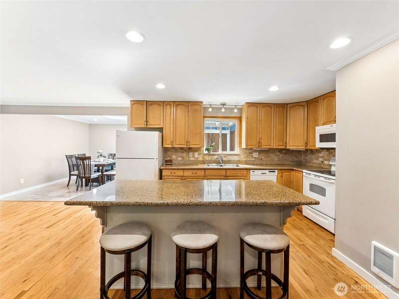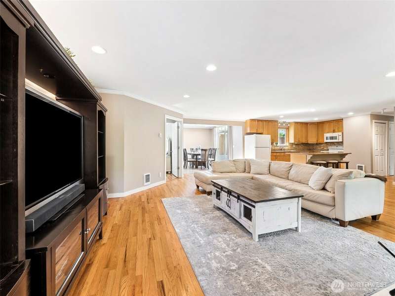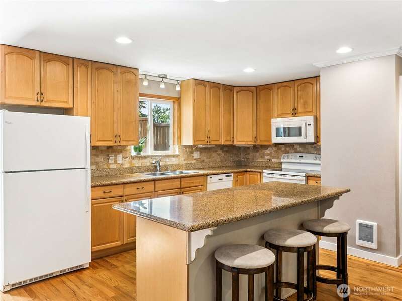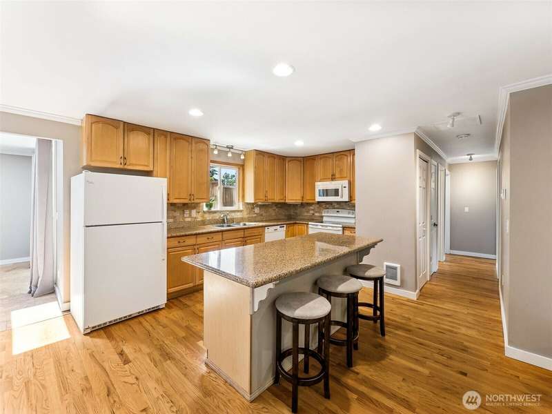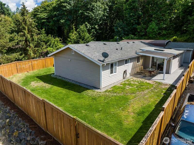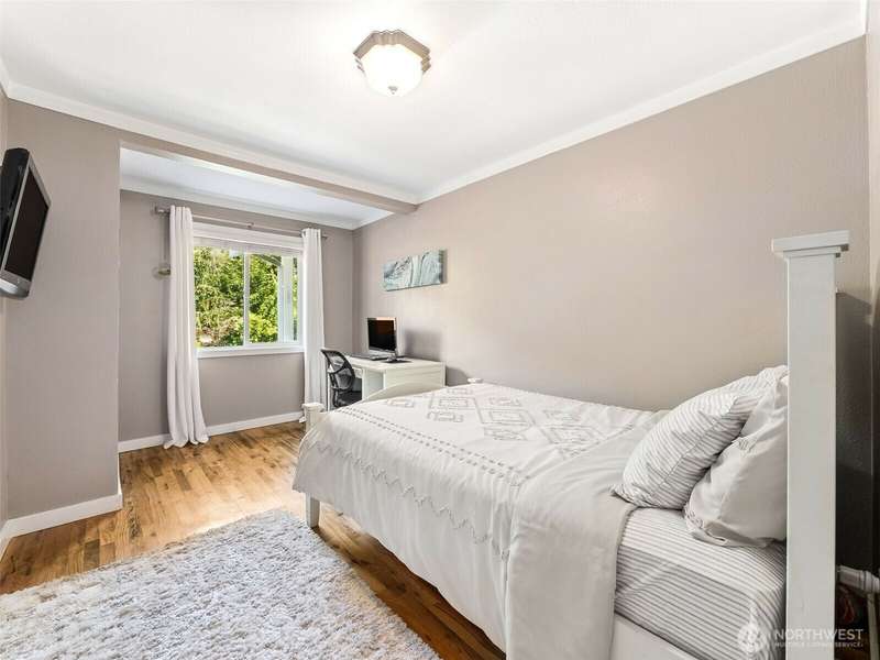 Beautifully updated rambler on a spacious corner lot at the end of a quiet dead-end street in the award-winning Issaquah School District. This home features an open layout with skylights and red oak hardwoods throughout. The living room centers around a wood-burning fireplace insert that heats the entire home. The remodeled kitchen boasts granite counters, center island, and quality cabinetry. Offers 3 bedrooms (2 plus bonus), including a serene primary suite with ¾ ensuite and sauna. Updated baths with new vanities, tile showers, and crown molding. Fully fenced backyard with mountain views, stamped concrete patio, and privacy. Detached garage/shop, RV/boat parking, and generator hookups. Minutes to HWY 169, I-405, and The Landing.