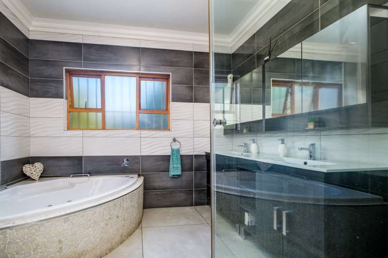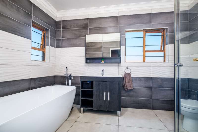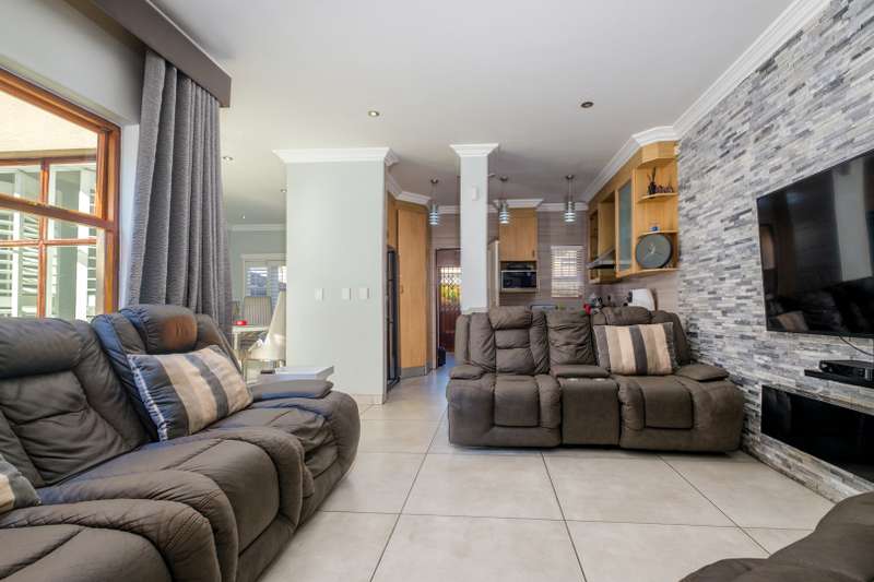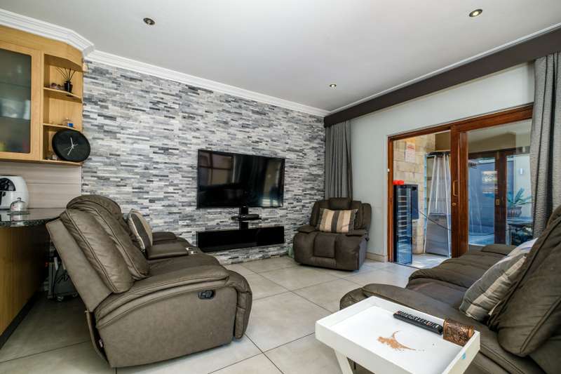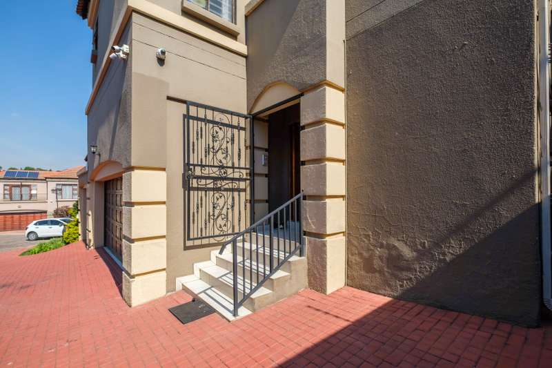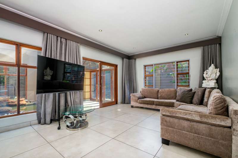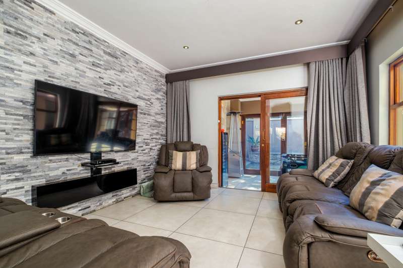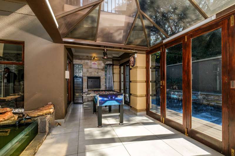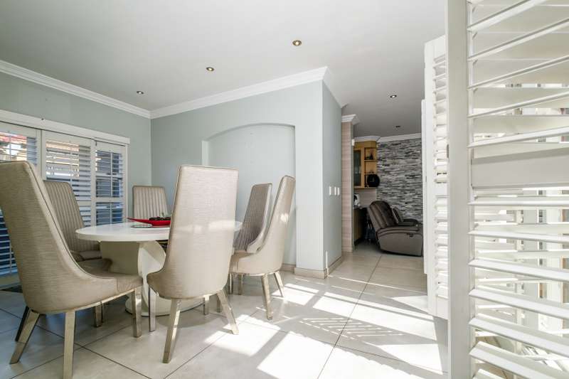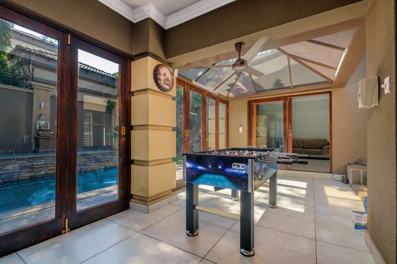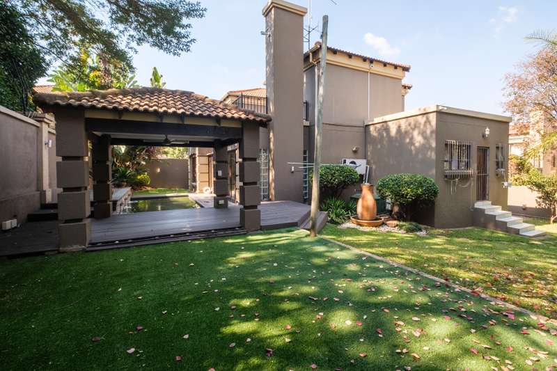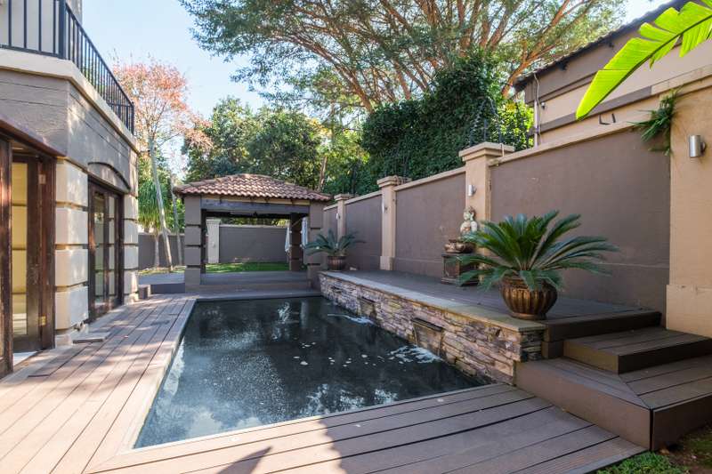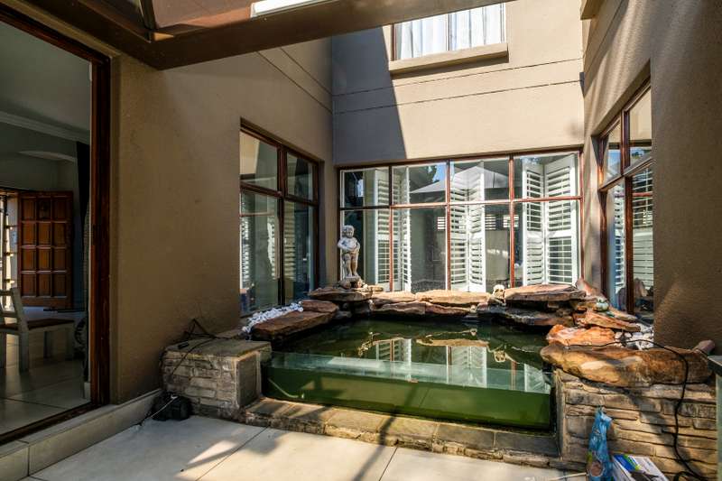 Magnificent Tuscan villa in exclusive security estate situated in Boskruin on cul de sac for extra parking. 4 Spacious bedrooms (2 en suite) - other 2 beds share a full bathroom across the landing- and a balcony. . all with underfloor heating and aircon as well as custom made automated curtains and design cornices. Beautiful finishes with lots of extra features. Upstairs landing houses an open plan fitted study area. Downstairs has 3 Lovely Receptions - Lounge , separate Dining room and family room adjacent to eat in kitchen with separate laundry/scullery and pantry cupboard. Sliders from both lounge and family room onto enclosed patio with built in braai and feature koi pond. Stacking doors open to pretty pool and entertainers cabana overlooking the pool with plenty of garden left for kids and pets. Renovated staff quarters doubles a guest suite. 3 Auto garages