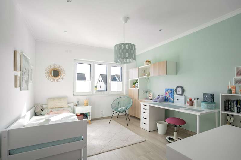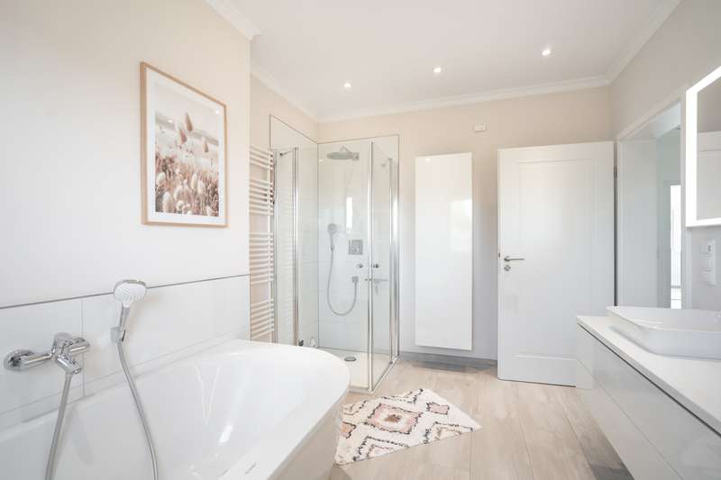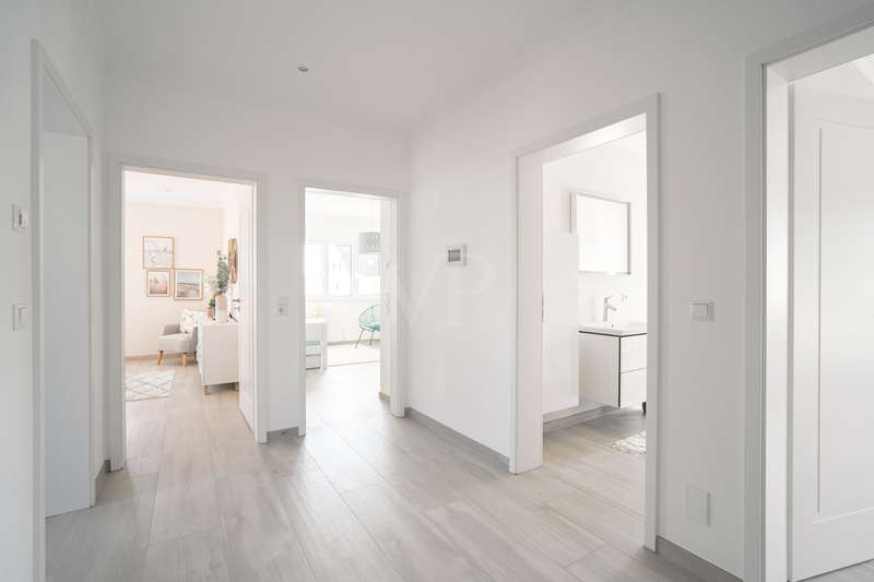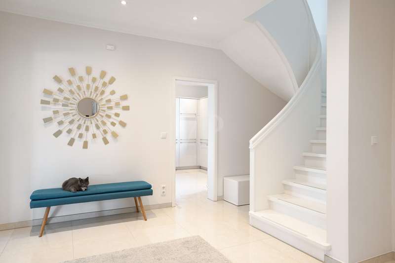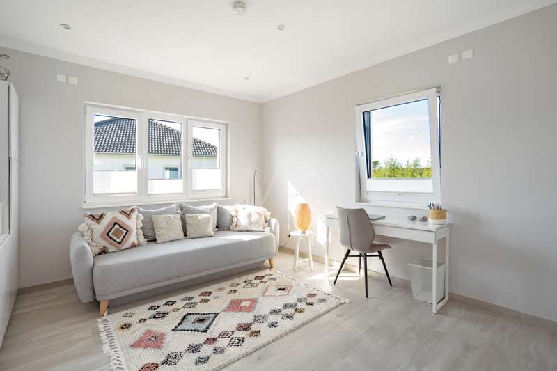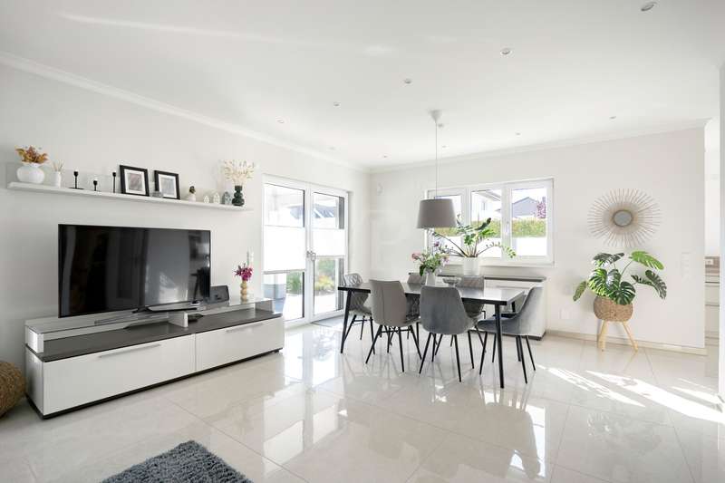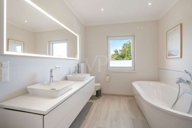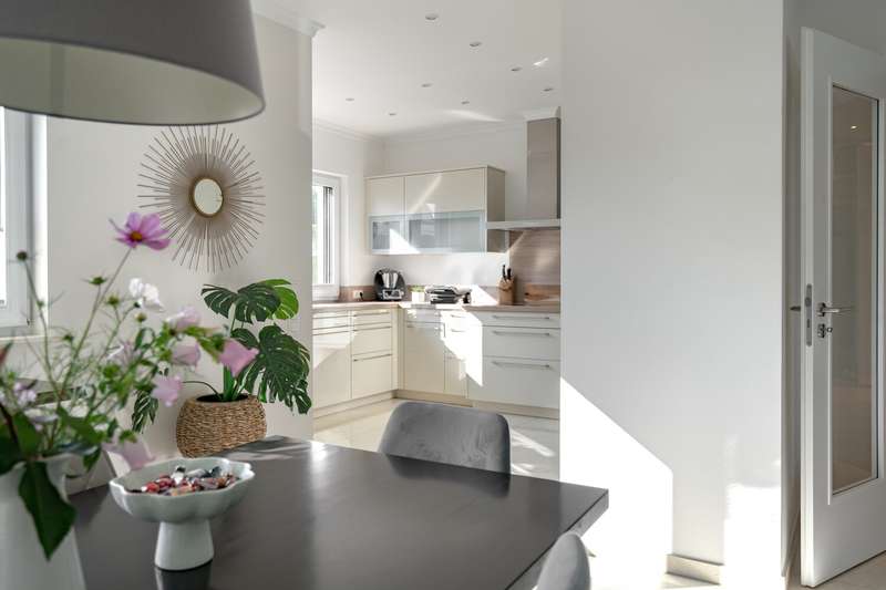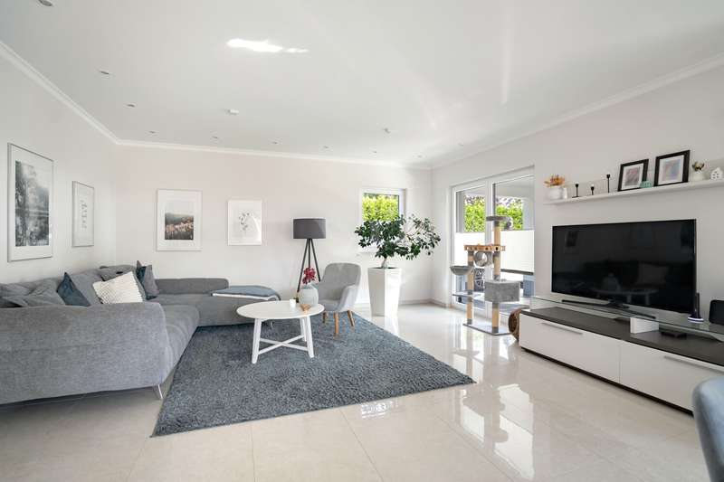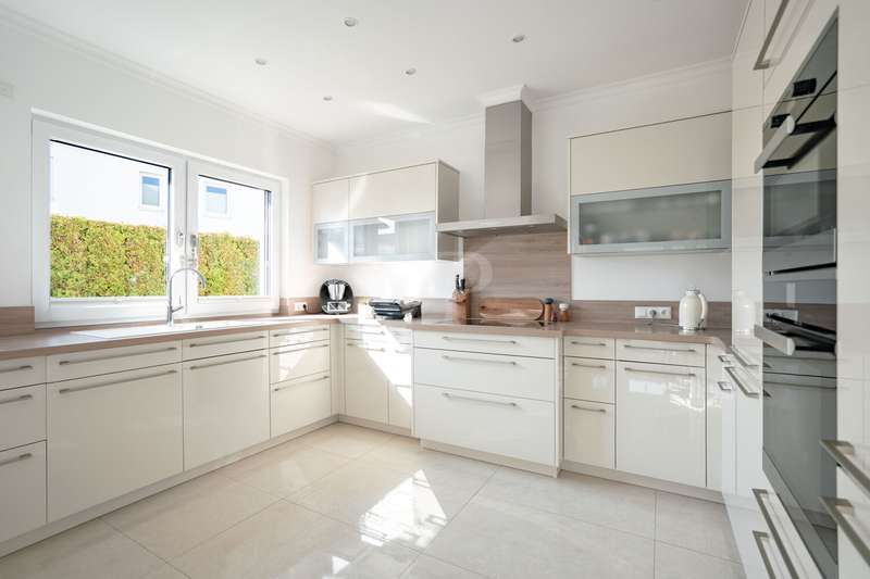 A beautiful piece of land in an excellent, quiet location built with a dream home. A young urban villa in timeless Bauhaus style is for sale, combining elegance, lightness and modern living comfort at the highest level. With two full storeys and prestigious architecture, this young house, built in 2017, is a true statement of stylish living. On approx. 165 m² of living space and a fully enclosed plot of approx. 700 m², a home with plenty of space, light and privacy is being created. The property welcomes you with an exclusive impression as soon as you step onto the plot: a modern electric gate opens onto the inviting driveway that leads to the house. As you enter the house, a spacious entrance area presents itself, creating an impressive first moment with its wide open spaces and cleverly integrated checkroom. The open-plan living and dining area, which can be reached from here and resembles a dance hall, forms the heart of the house. Floor-to-ceiling windows ensure light-flooded rooms and a friendly atmosphere. The well thought-out architecture enables a flowing transition between the living and dining areas. The adjoining kitchen with fitted kitchen not only impresses with its high-quality fittings with numerous built-in cupboards and brand-name appliances, but also with its flexibility: it blends harmoniously into the dining area in a semi-open design, but can be partitioned off if required by inserting a door. Adjacent to the living area is a covered terrace, which acts as a natural extension of the living area. From here, the view extends over the property, which is surrounded by hedges and offers peace and privacy. The utility room impresses with its luxurious fittings including custom-made built-in cupboards, sink and work surface - a well thought-out space that makes everyday life easier in style. A modern guest WC rounds off the first floor. The house has a total of five rooms. Three well-designed bedrooms await you on the upper floor, offering peace and privacy. Two bathrooms meet the highest standards: an elegant master bathroom with bath and shower for relaxing wellness moments and a high-quality guest bathroom with a spacious shower. A dressing room crowns the room concept. The property is also technically well thought out: the modern heating system is housed in a separate room outside the house - a plus in terms of comfort and tidiness. High-quality floor coverings and doors underline the special character of this property. A solidly built carport with adjoining storage room and two additional outdoor parking spaces provide room for family and guests' vehicles. This prestigious property combines modern design, well thought-out functionality and timeless elegance - a home that offers the highest level of living comfort and quality of life in an impressive way. We would be happy to provide you with further information or invite you to an individual viewing on site. See the benefits of this special property for yourself!