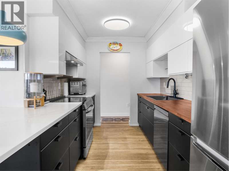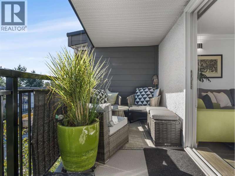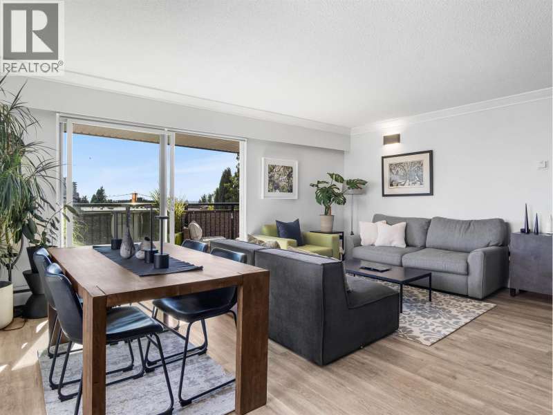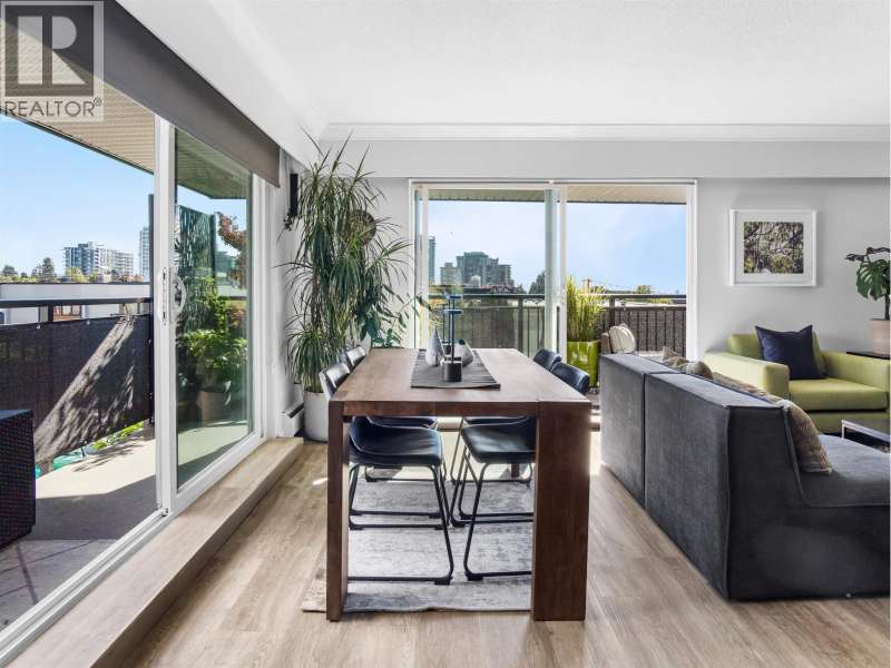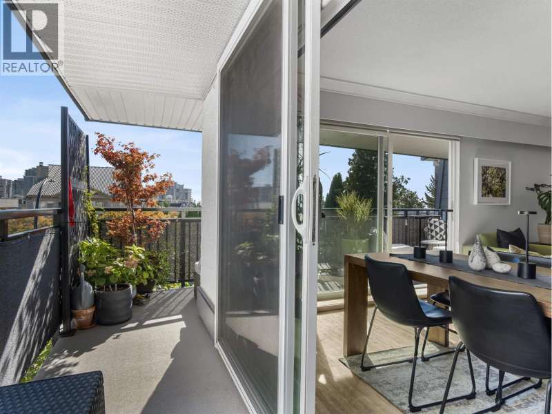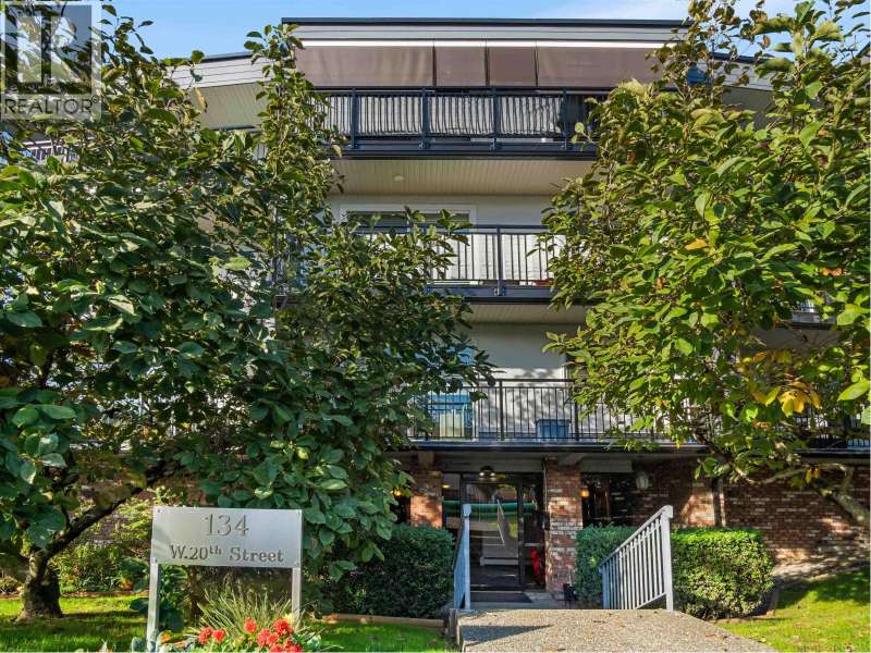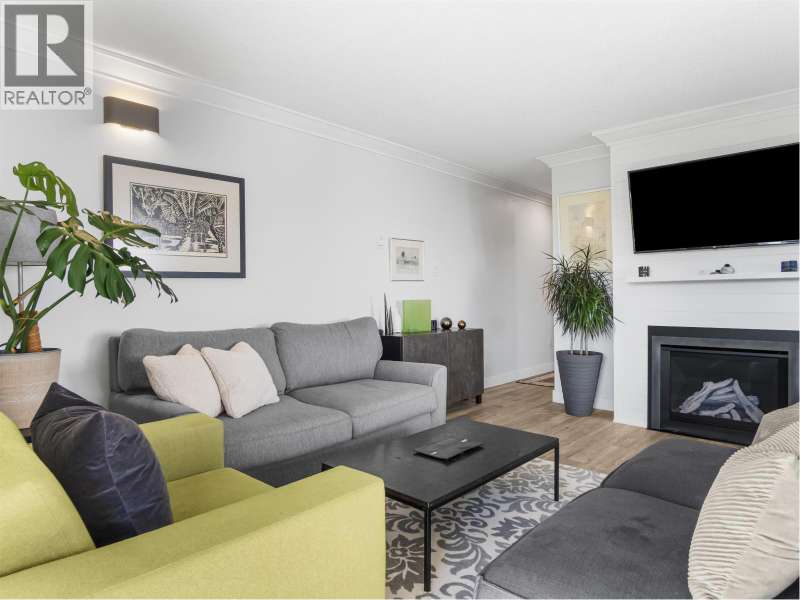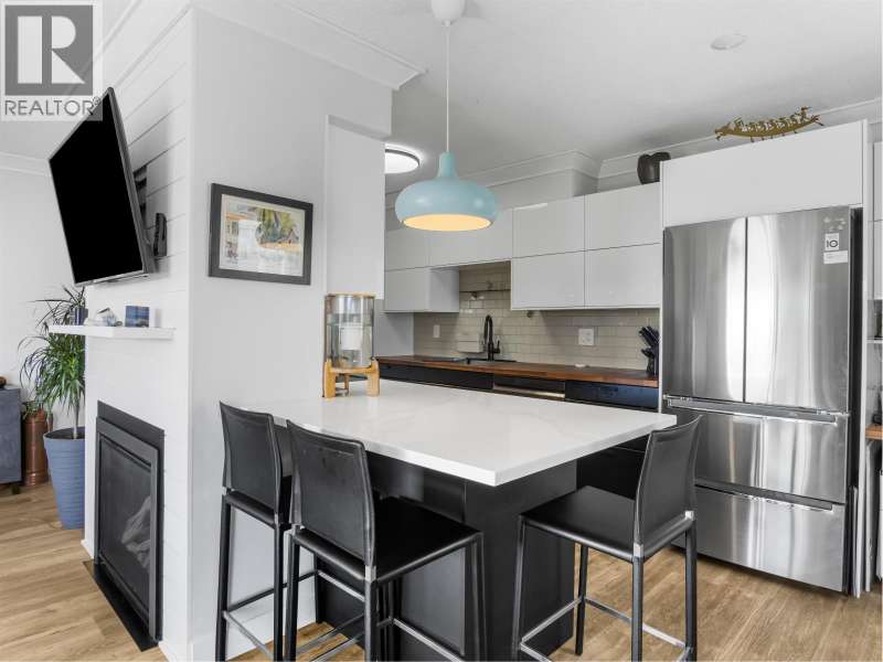 Gorgeously renovated, south facing 2BR/1BA condo in Central Lonsdale! This top floor, corner unit has extensive updates. In the kitchen, recent appliances with induction stove plus all new cabinets, wood and stone countertops extended to an eating area. The large, bright living/dining area features durable wide plank vinyl floors, plus an updated gas fireplace and looks out to a huge and sunny wrap around balcony that overlooks the treed street. Beautifully tiled bathroom has an updated shower with inset nooks for storage. Recent closet doors, light fixtures. The well-run building has many upgrades including balconies, windows, sliding doors, electrical, plumbing. Steps away from all Central Lonsdale shops, medical, new Harry Jerome and minutes to the highway. 1 pkg, 1 stg, dog or cat ok. (id:58403)