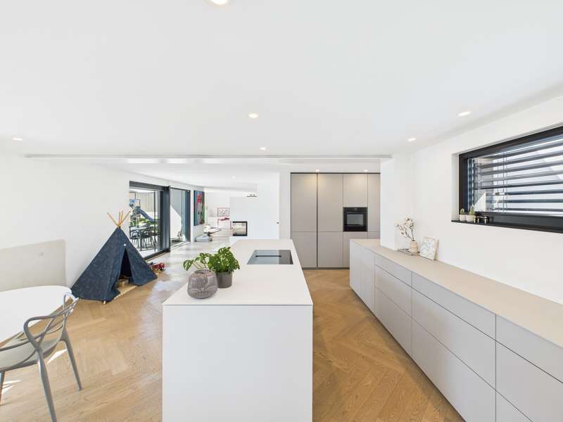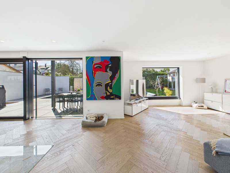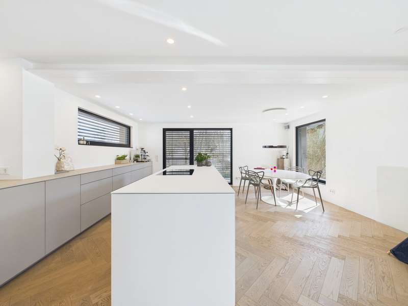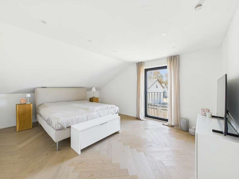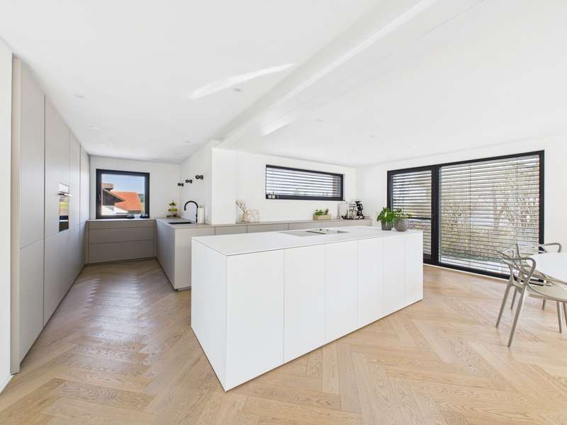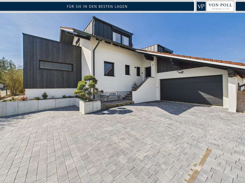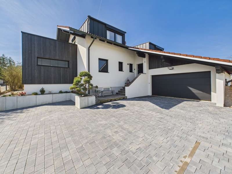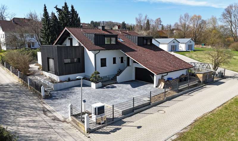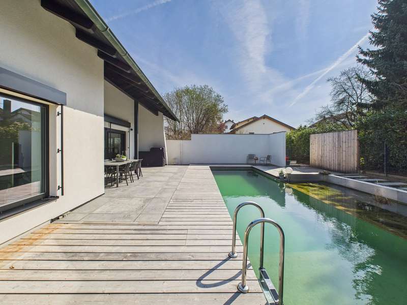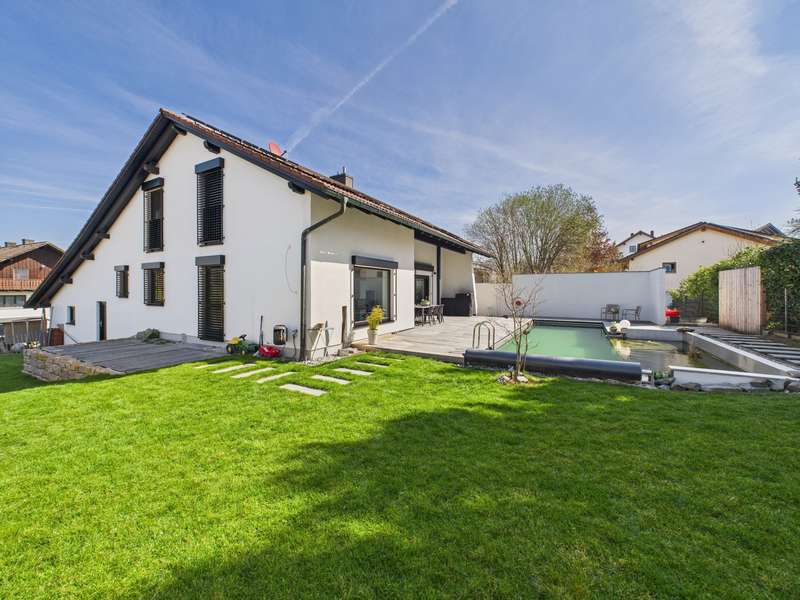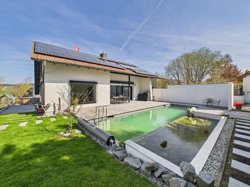 A place that provides a sense of security, radiates clarity and offers space for new stories: This high-quality renovated detached house in Vilsheim / Langenvils combines rural idyll with modern living culture. Nestled in the tranquil natural surroundings of the Vils valley, yet close to the city, this home has a very special aura - harmonious, stylish and authentic. The property was extensively and sensitively renovated in 2021/22. The approx. 209 m² living space comprises six spacious rooms that impress with their open floor plans, natural lighting and clear design language. Fine materials and harmonious color schemes create a warm, inviting atmosphere. The custom-made kitchen by a carpenter with modern appliances and high-quality surfaces is not only a functional focal point, but also a meeting place. Floor-to-ceiling windows seamlessly connect the interior with the exterior - here, life opens up to the garden, to nature, to light. The plot of around 839 m² has been lovingly landscaped: A spacious terrace with fine natural stone, a near-natural swimming pond with wooden deck, outdoor shower and an automatic irrigation system make the outdoor area an oasis of relaxation. The house is also technically impressive with a modern, energy-efficient concept - including photovoltaics, solar support and intelligent control. High-quality windows, smart shading and harmonious fixtures underline the high standards. A well thought-out floor plan, a stylish bathroom with laundry chute, custom-made wardrobes, exposed screed and many other lovely details round off the overall picture. Three outdoor parking spaces and a garage offer ample space for vehicles. The quiet location on the outskirts promises privacy! This house is more than just four walls. It is a way of life. A home that radiates warmth, gives freedom and leaves room for the essentials. You can access the 360-degree digital tour via this link: https://tour.giraffe360.com/214fc764023b40bd8d27d8e593d4390b/