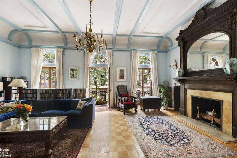 Second and Third floors - owner's duplex with internal staircase. Large and airy parlor level with 11" ceilings and three south facing balconies accessed from the living room through 3 French doors! A spacious dining room is located at the opposite end with beamed ceilings and the aforementioned stained glass windows. Both rooms have large fireplaces.