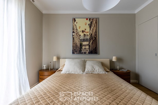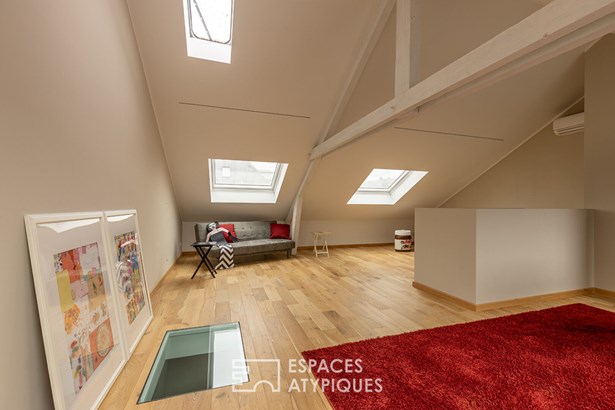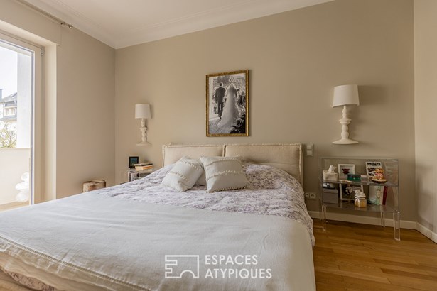 Le premier niveau accueille deux belles chambres soigneusement amenagees et un genereux dressing offrant un rangement fonctionnel et organise. Sur le meme palier, la salle d'eau est elegante et propose des finitions haut de gamme. Le magnifique parquet d'origine en bois massif confere aux differentes pieces une atmosphere chaleureuse et raffinee. Le second niveau, quant a lui, abrite deux vastes chambres, une salle de bains imaginee dans un esprit d'epure contemporaine ainsi qu'une piece supplementaire pouvant etre utilisee selon les envies de ses futurs heureux proprietaires.