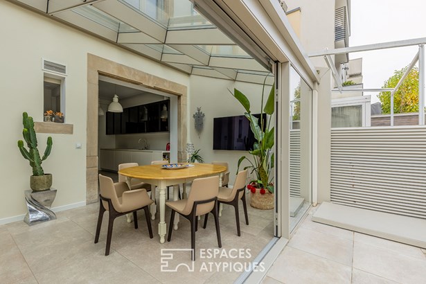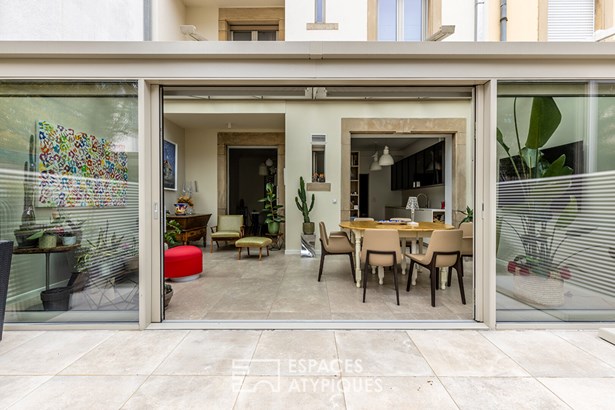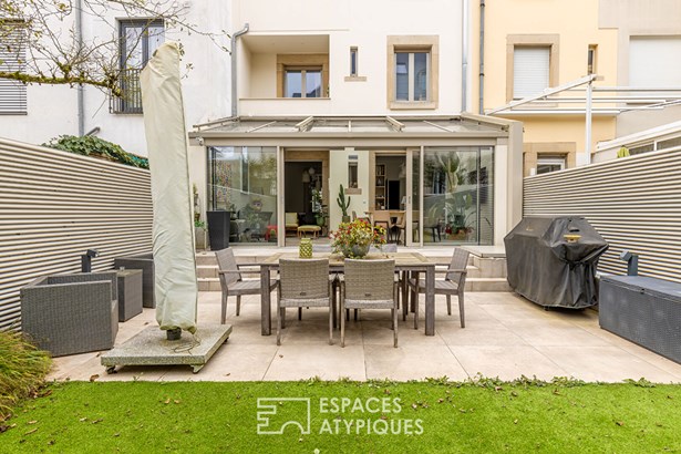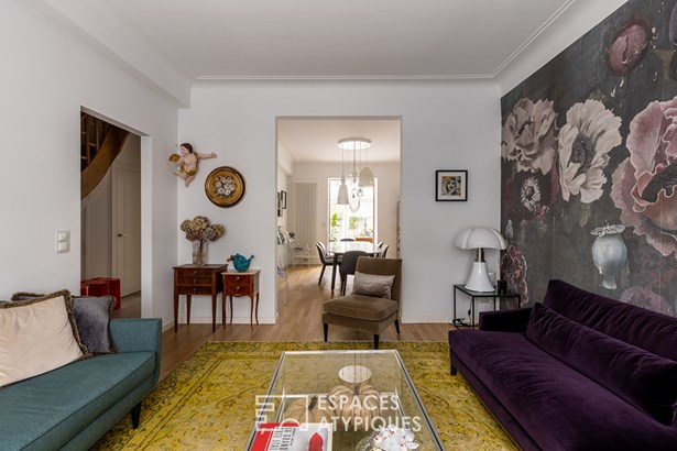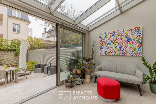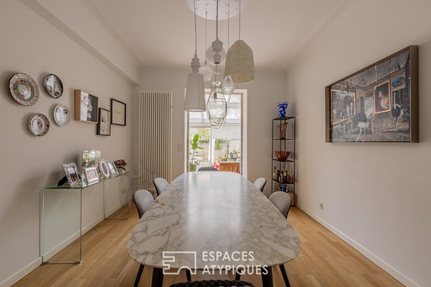 La porte s'ouvre sur un magnifique escalier en bois massif qui donne le ton de la visite. Le rez-de-chaussee propose un espace de vie raffine ou cachet de l'ancien et confort contemporain se conjuguent a merveille. Une fois le salon et la salle a manger en enfilade franchis, une large ouverture agrementee de pierres de taille permet d'acceder a une veranda baignee de lumiere. Veritable prolongement de l'espace de vie, celle-ci s'ouvre d'un cote sur une terrasse et un jardin et de l'autre sur la cuisine epuree presentant des finitions de haute qualite.