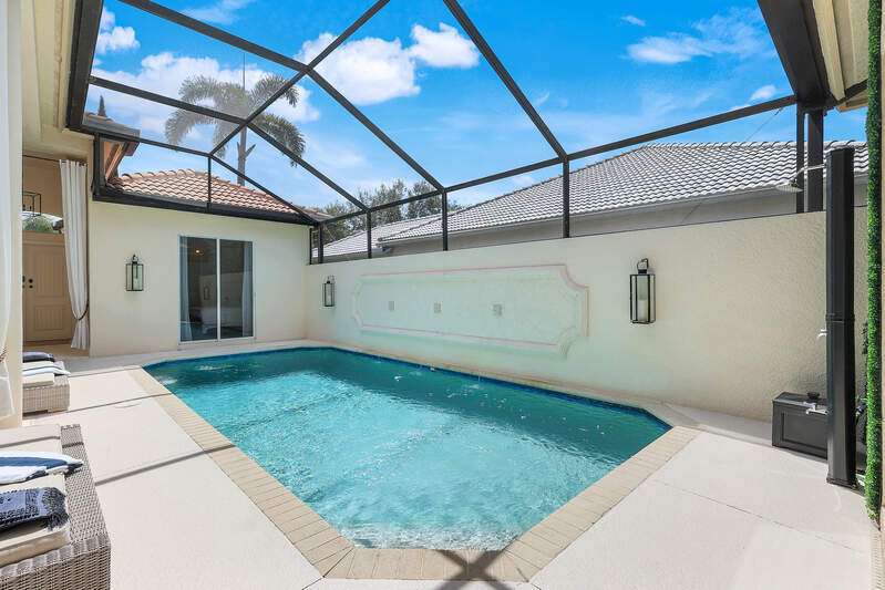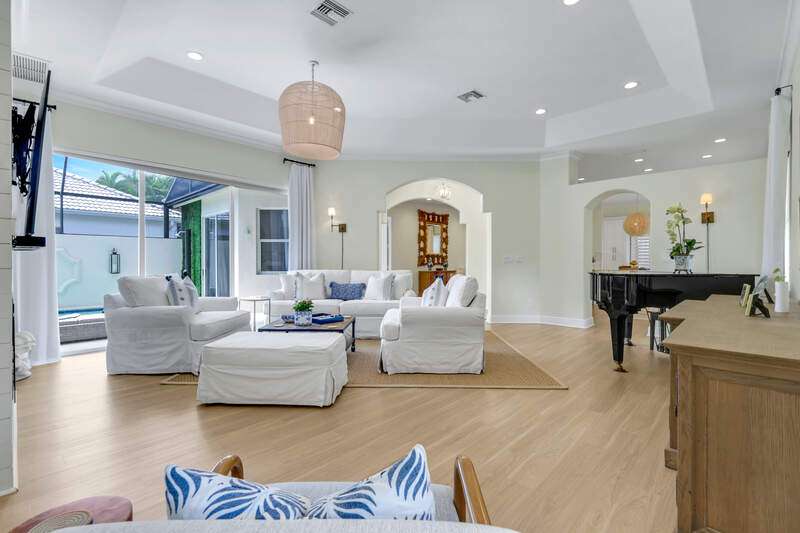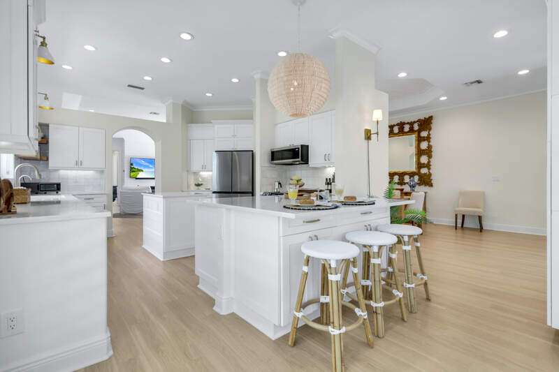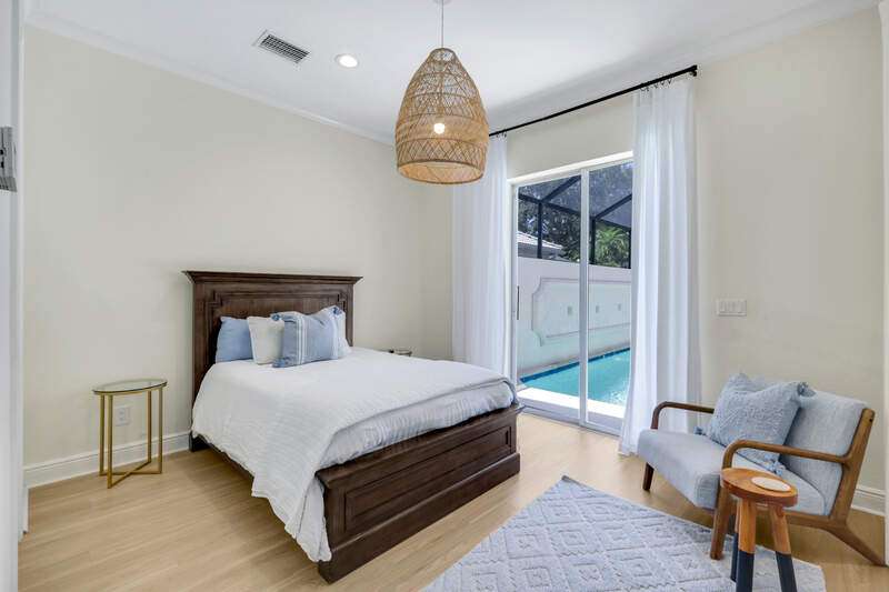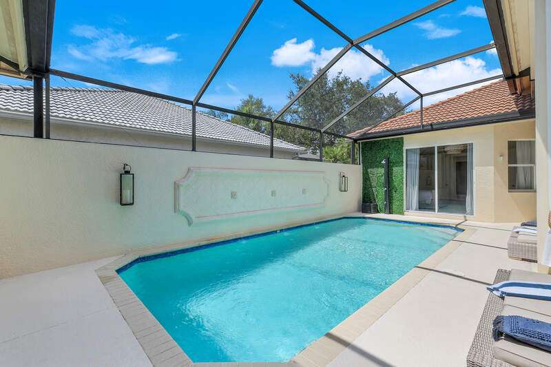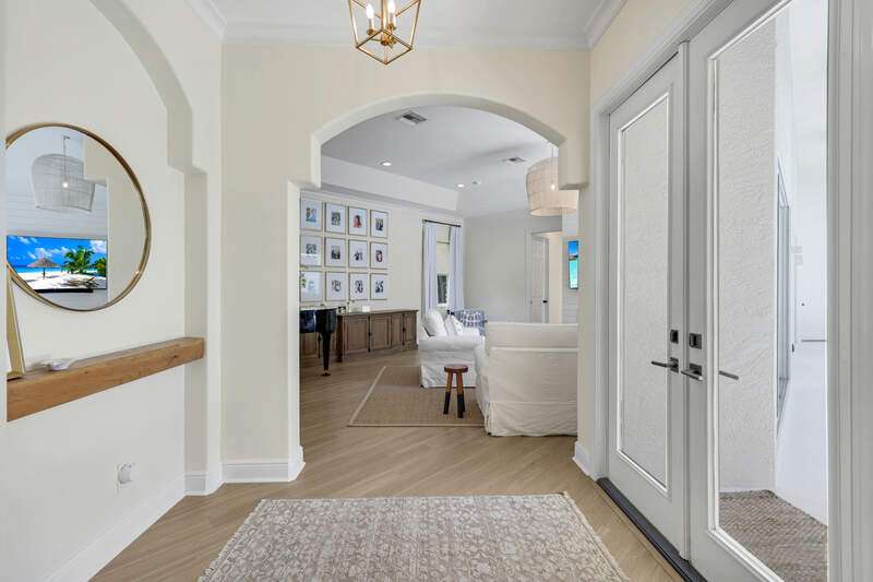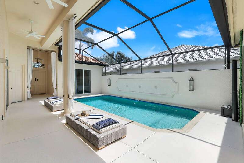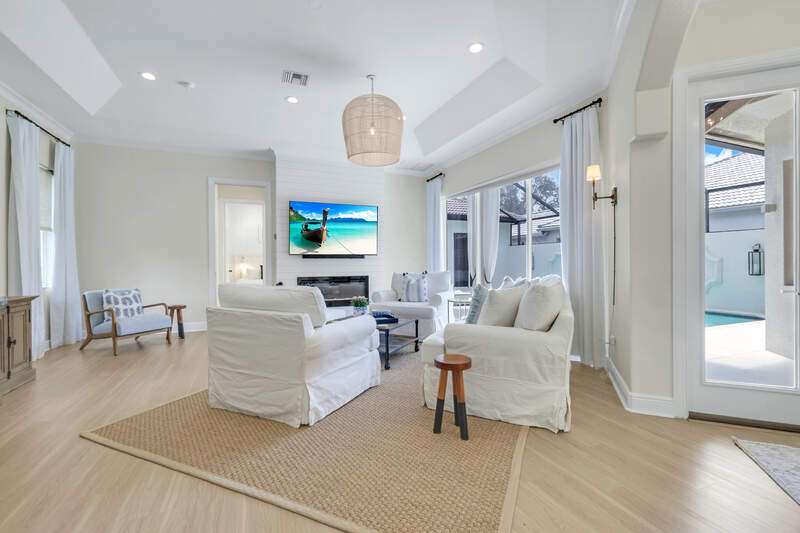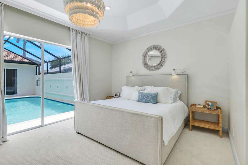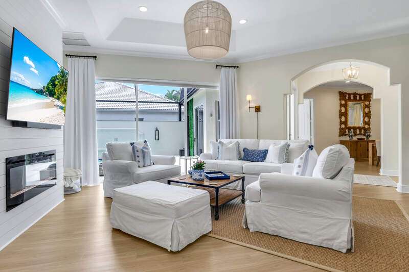 Set on a corner lot, this impressively recently renovated residence in Augusta Falls at The Vineyards captures the essence of coastal elegance with thoughtfully curated finishes including Serena and Lily and Restoration Hardware light fixtures. Inside, floors reminiscent of sandy Gulf beaches set the tone for a stylish, inviting interior, while soft white curtains flow throughout, lending an airy, relaxed feel to every space. The sprawling gourmet kitchen, with quartz countertops, and nearly new high end appliances is a showpiece, featuring an island, separate breakfast bar, chic light fixtures, and eye-catching tile backsplash. Plantation shutters further enhance the home's coastal character. The great room centers around a striking fireplace with shiplap wall detail, while the primary suite feels like a five-star resort, with private lanai access and a spa-like ensuite bath, with a solid surface soaker tub, wet room shower that looks straight out of an interior design magazine. This well maintained home offers two screened lanais, each designed to maximize indoor-outdoor living. One lanai creates a breezy retreat for lounging or dining with a lake view, while the other frames the shimmering pool with its soothing waterfall feature. White curtains add a touch of coastal romance, transforming the outdoors into a stylish, dreamlike oasis. Just beyond, a private 1-bedroom, 1-bath cabana provides the ideal space for guests, extended family, or a dedicated home office. Augusta Falls itself is a picturesque, tranquil community, greeted by cascading waterfalls at its entrance. Residents enjoy a clubhouse with a heated pool, two scenic lakes with fountains, and numerous opportunities for social gatherings. A prime central Naples location in a gated community near Vanderbilt Beach Road provides easy access to Naples beaches, restaurants, Mercato, Crossroads Marketplace and more. The stunning renovations with quality finishes, and timeless coastal style all converge in this remarkable property.