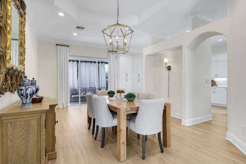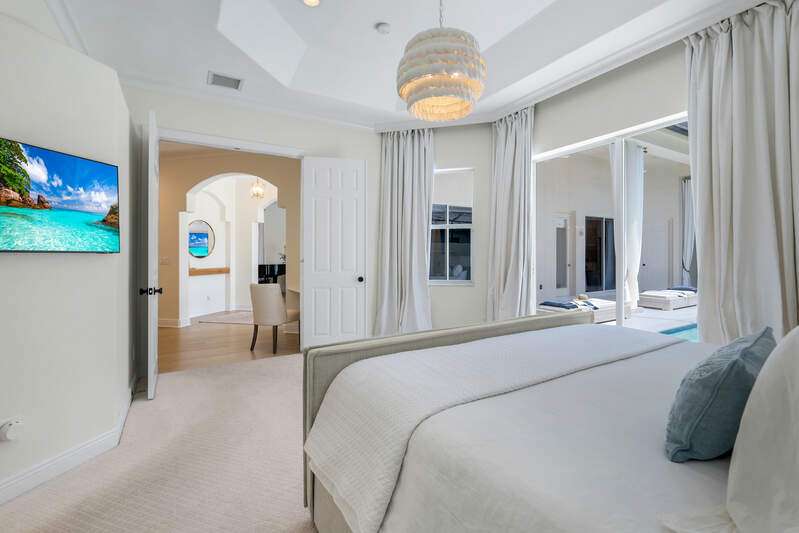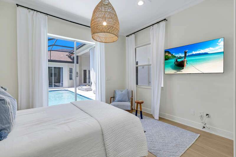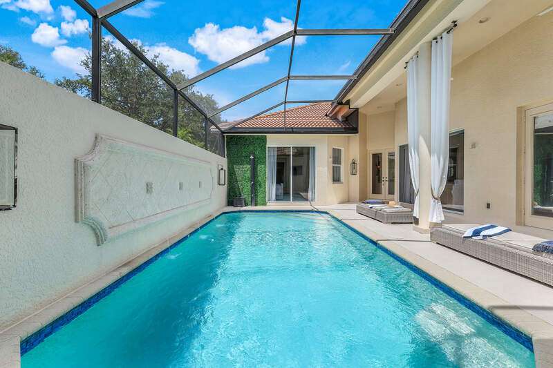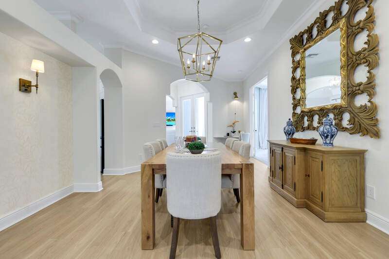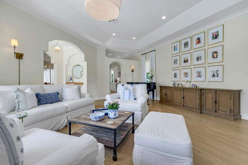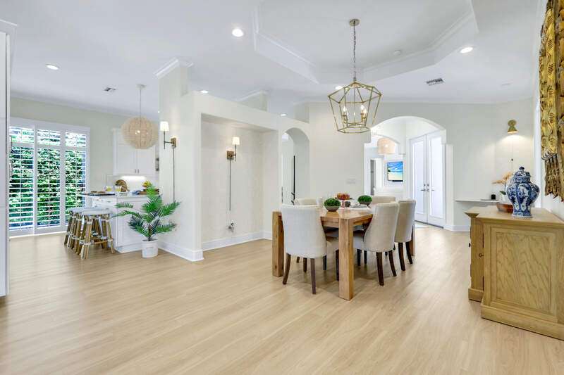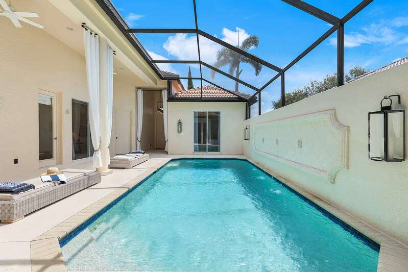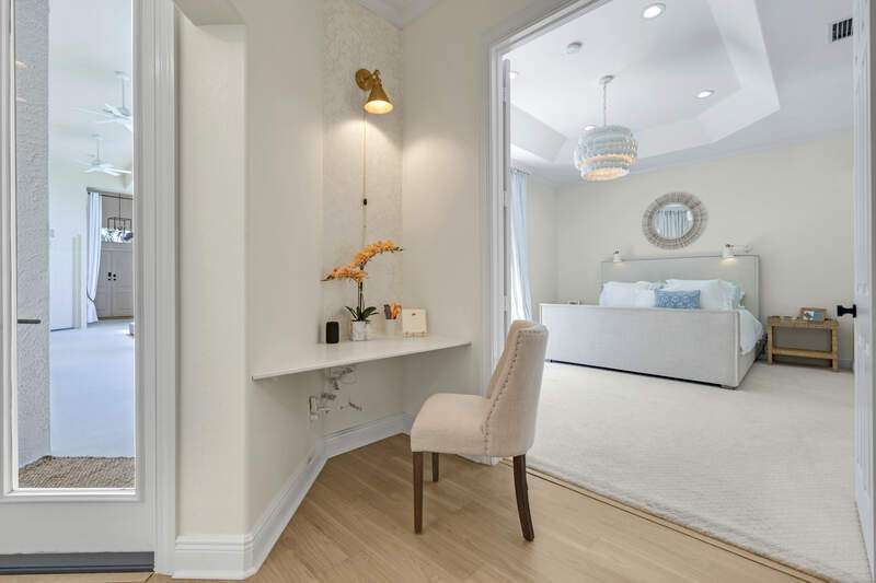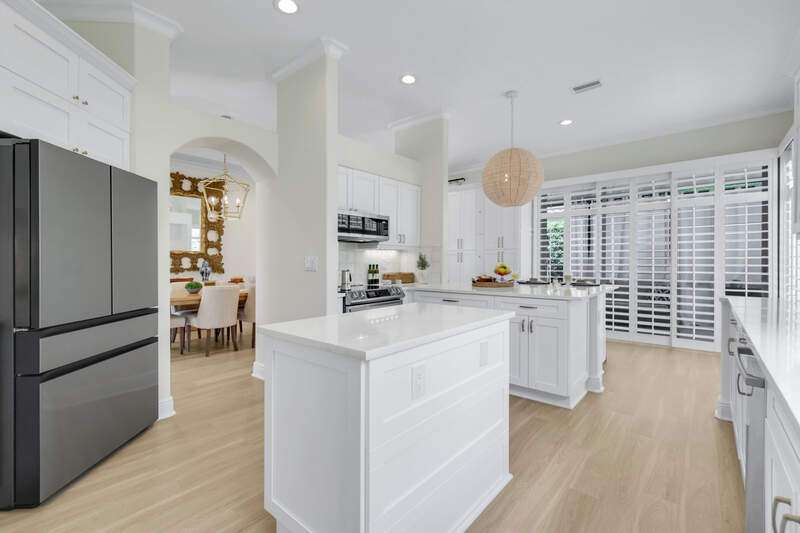 Set on a corner lot, this impressively recently renovated residence in Augusta Falls at The Vineyards captures the essence of coastal elegance with thoughtfully curated finishes including Serena and Lily and Restoration Hardware light fixtures. Inside, floors reminiscent of sandy Gulf beaches set the tone for a stylish, inviting interior, while soft white curtains flow throughout, lending an airy, relaxed feel to every space. The sprawling gourmet kitchen, with quartz countertops, and nearly new high end appliances is a showpiece, featuring an island, separate breakfast bar, chic light fixtures, and eye-catching tile backsplash. Plantation shutters further enhance the home's coastal character. The great room centers around a striking fireplace with shiplap wall detail, while the primary suite feels like a five-star resort, with private lanai access and a spa-like ensuite bath, with a solid surface soaker tub, wet room shower that looks straight out of an interior design magazine. This well maintained home offers two screened lanais, each designed to maximize indoor-outdoor living. One lanai creates a breezy retreat for lounging or dining with a lake view, while the other frames the shimmering pool with its soothing waterfall feature. White curtains add a touch of coastal romance, transforming the outdoors into a stylish, dreamlike oasis. Just beyond, a private 1-bedroom, 1-bath cabana provides the ideal space for guests, extended family, or a dedicated home office. Augusta Falls itself is a picturesque, tranquil community, greeted by cascading waterfalls at its entrance. Residents enjoy a clubhouse with a heated pool, two scenic lakes with fountains, and numerous opportunities for social gatherings. A prime central Naples location in a gated community near Vanderbilt Beach Road provides easy access to Naples beaches, restaurants, Mercato, Crossroads Marketplace and more. The stunning renovations with quality finishes, and timeless coastal style all converge in this remarkable property.