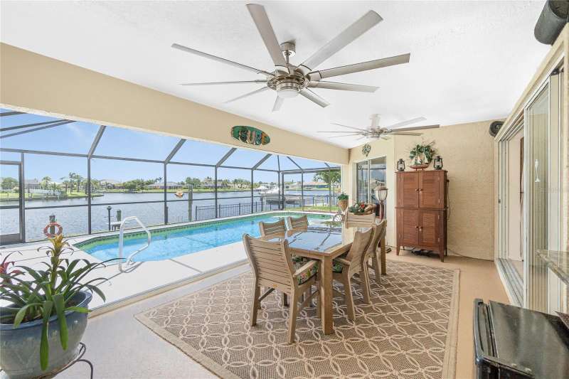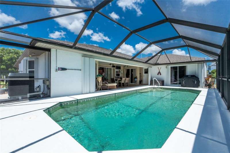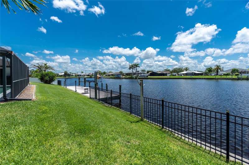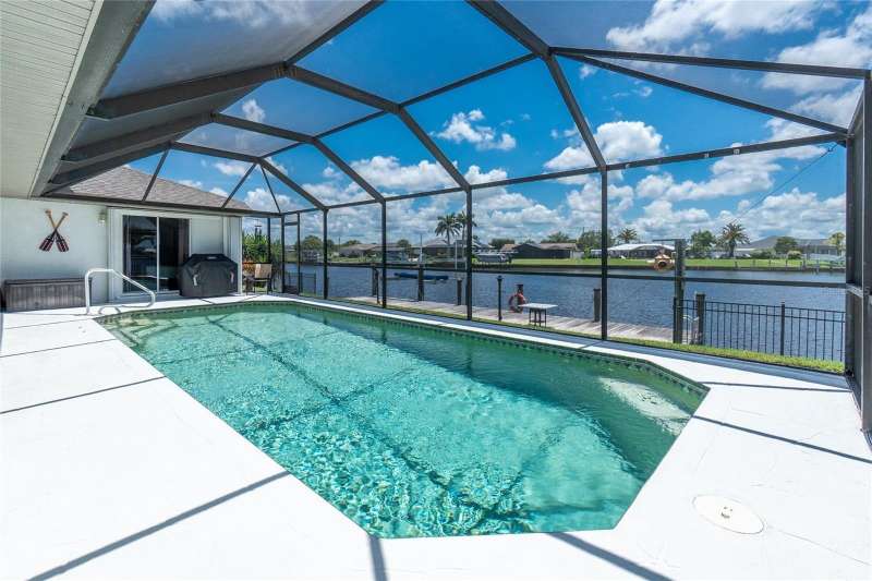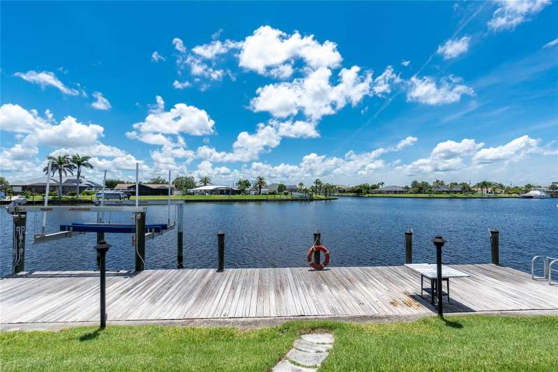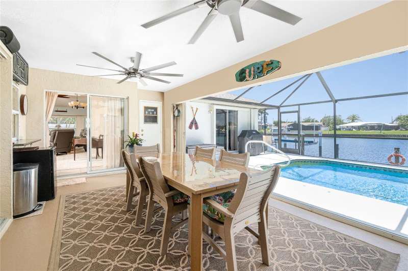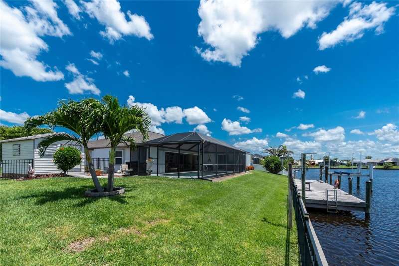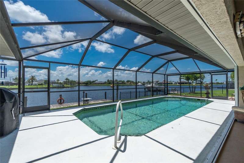 Welcome to 4142 Reif Ct, a boater's paradise nestled in charming Port Charlotte, Florida. This waterfront gem provides an unobstructed, dazzling view of four intersecting canals. The property's exterior features a well-maintained 105-foot seawall and a 51-foot dock equipped with both water and electric, a 10,000-pound boat lift, accommodating all your nautical needs with no bridges to navigate to open water. Imagine starting your mornings with breakfast served at the kitchen bar, surrounded by gorgeous granite countertops and sleek stainless-steel appliances. This spectacular 2,345 sq.ft single-family home boasts a split floor plan with 4 spacious bedrooms, 2.5 bathrooms, and a large primary suite. The luxurious primary bath is appointed with dual vanities, a roomy walk-in shower, and a soothing jetted tub, creating the perfect retreat. Enjoy the Florida sun in your private heated pool or retreat to the spacious, fenced-in backyard that stretches all the way to the seawall. The home, crowned with a new roof installed in 2021, also offers full hurricane protection with practical accordion shutters. The updated lighting fixtures and ceiling fans add a modern touch to this inviting home. A large, detached storage shed is included for all your storage needs. Rest easy knowing the flood insurance is transferable and you're just 25 minutes away from Gulf beaches. Experience an impeccable blend of luxury and convenience at 4142 Reif Ct, a finely kept home perfect for creating lasting family memories. Don't miss the chance to call this waterfront oasis your own. Schedule a showing today or reach out for more information. All dimensions and specifications are deemed to be accurate and should be verified to the buyer and/or buyer's broker satisfaction
