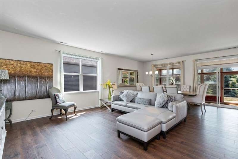 This inviting corner ranch offers the ease of single-story living in the desirable Wentworth neighborhood of Gurnee. With 2 bedrooms plus a versatile den/flex room, the home provides options for a private office, nursery, or hobby space. The open floor plan creates a seamless flow between the living, dining, and kitchen areas, filled with natural light from large windows and sliding doors. The kitchen is a true centerpiece, featuring a generous island and walk-in pantry, while the adjacent laundry room adds everyday convenience. The spacious primary suite is a retreat of its own, boasting a luxurious bath with double vanity, soaking tub, separate shower, and an enviable 10x12 walk-in closet, plus an additional smaller walk-in closet for even more storage. A three-season room opens to a block-paver patio and tree-dotted yard, perfect for both quiet mornings and relaxed entertaining.Additional highlights include a 2-car garage and the low-maintenance lifestyle provided by the HOA, covering landscaping and snow removal. Ideally located just 2 miles from shopping, dining, Gurnee Mills, and highways 94 and 120, this move-in ready home combines comfort, privacy, and convenience in a welcoming community.