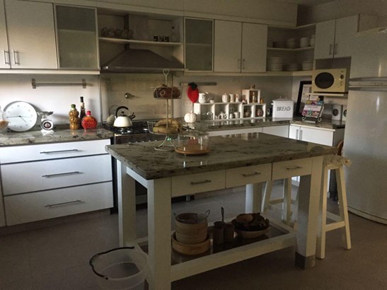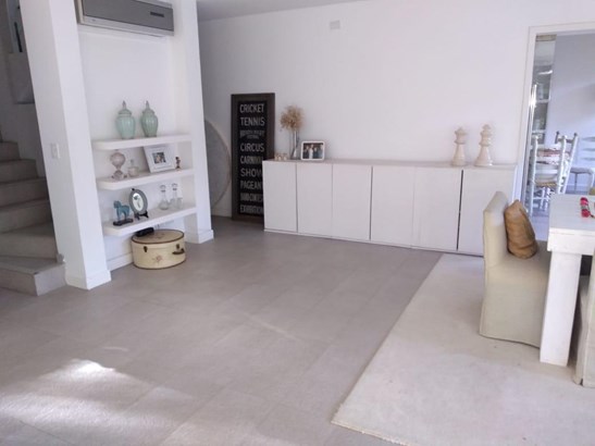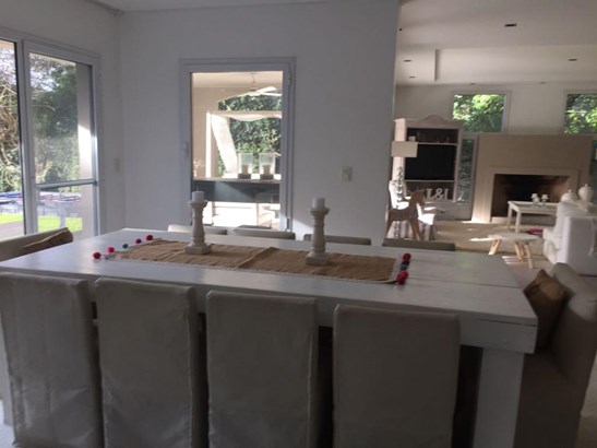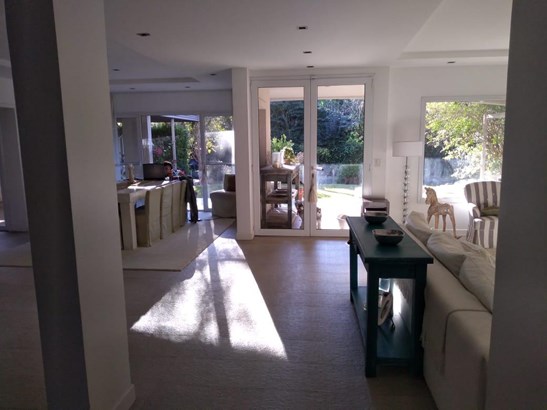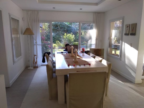 Amplio hall. Living con chimenea con salida a galería y jardín, comedor adjunto. Toilette. Impecable cocina con isla, mesadas de mármol y comedor diario amplio con salida al jardín.