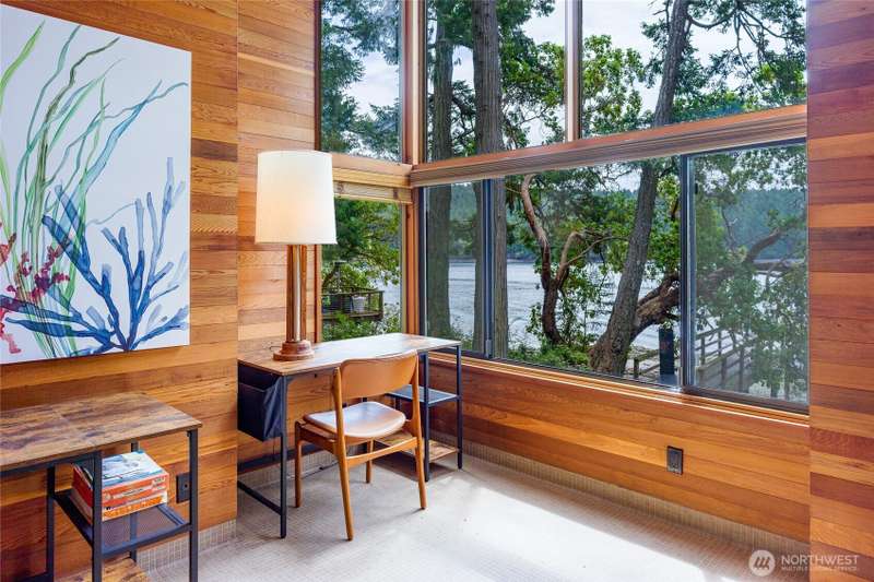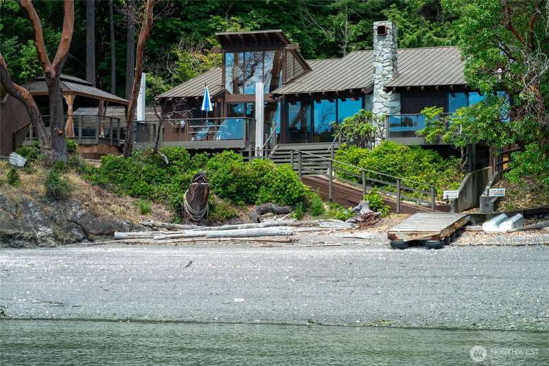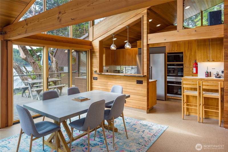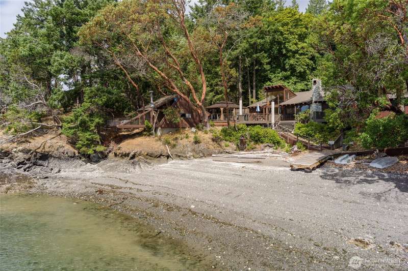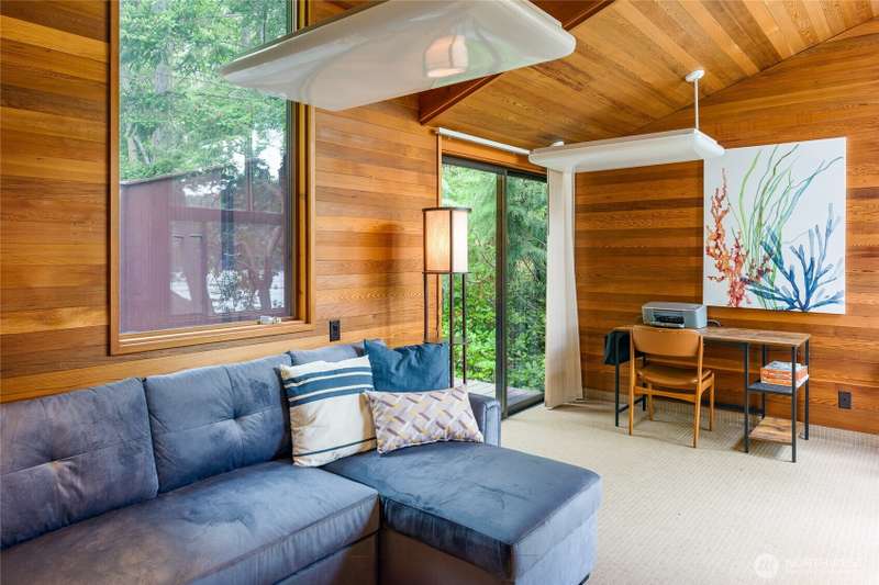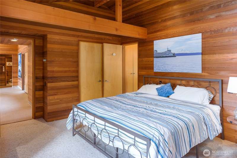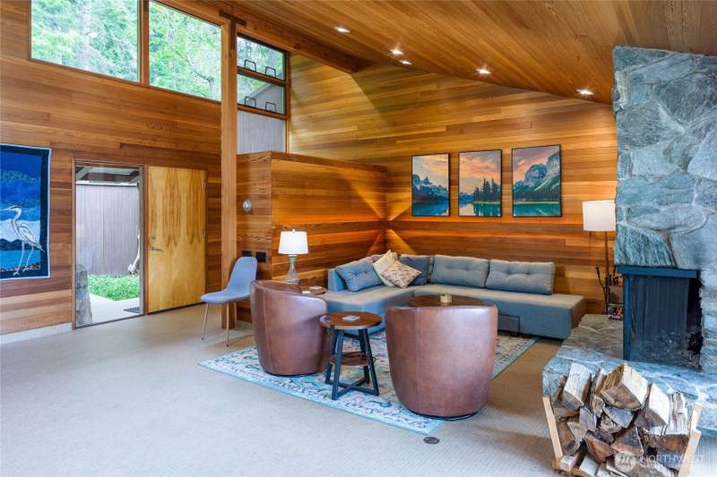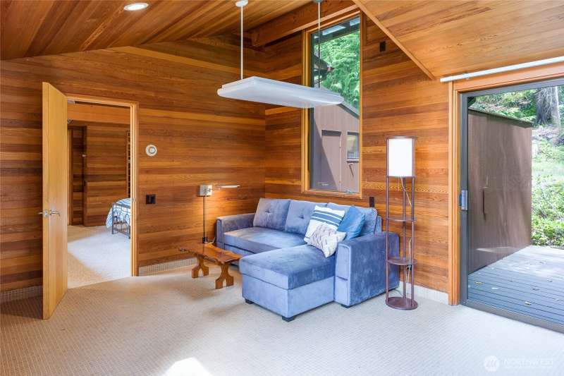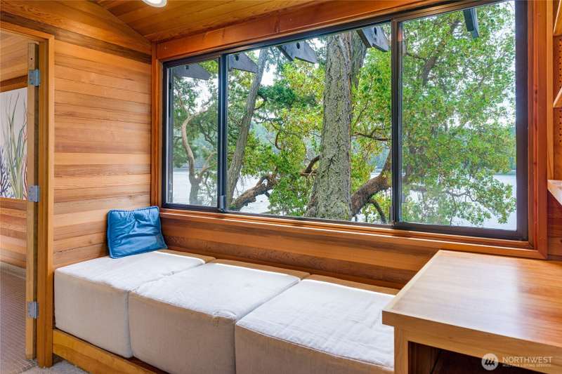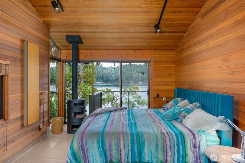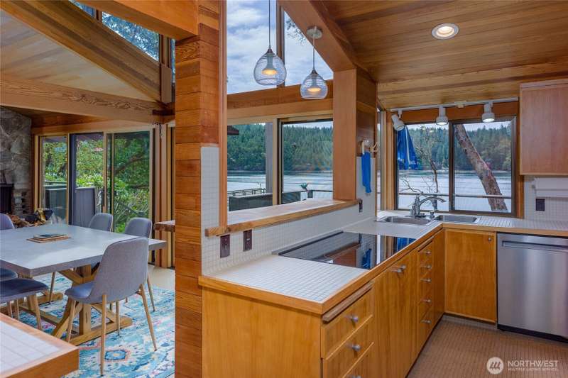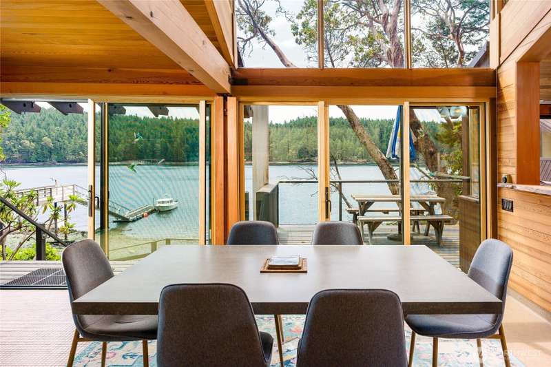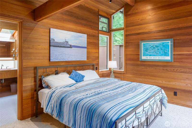 Crane Island Waterfront Gem. Many recent upgrades & updates to this property have added even more to this unique property. Dock your boat at the shared dock adjoining the property, wander up past the cove beach to the south-facing classic mid-century modern retreat. Designed by acclaimed architect Paul Hoag, the main house blends nature outdoors & tranquility within. New appliances throughout, updated lighting and plumbing fixtures, and a freshly tiled primary bath floor with radiant heat add to the ambiance of the old-growth cedar-lined walls and stone fireplace. Guesthouse, designed by acclaimed architect Wendell Lovett, is genuinely one of a kind. The outdoor areas are designed for entertaining & making the most of island life.
