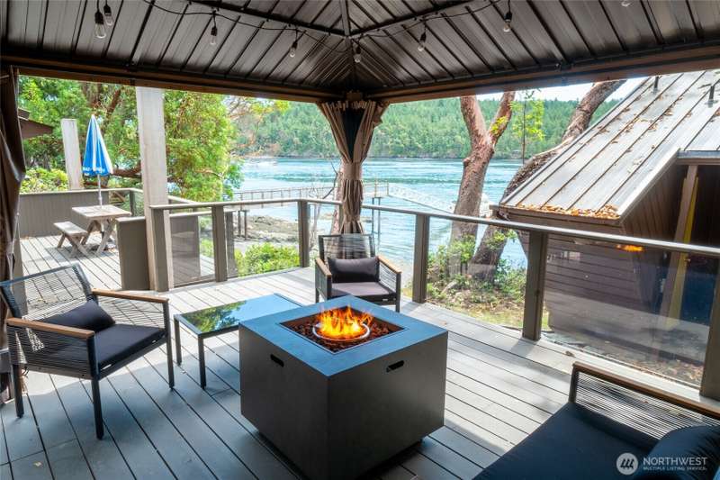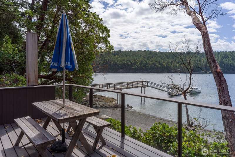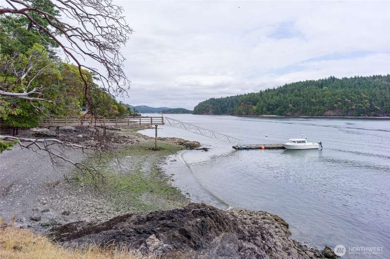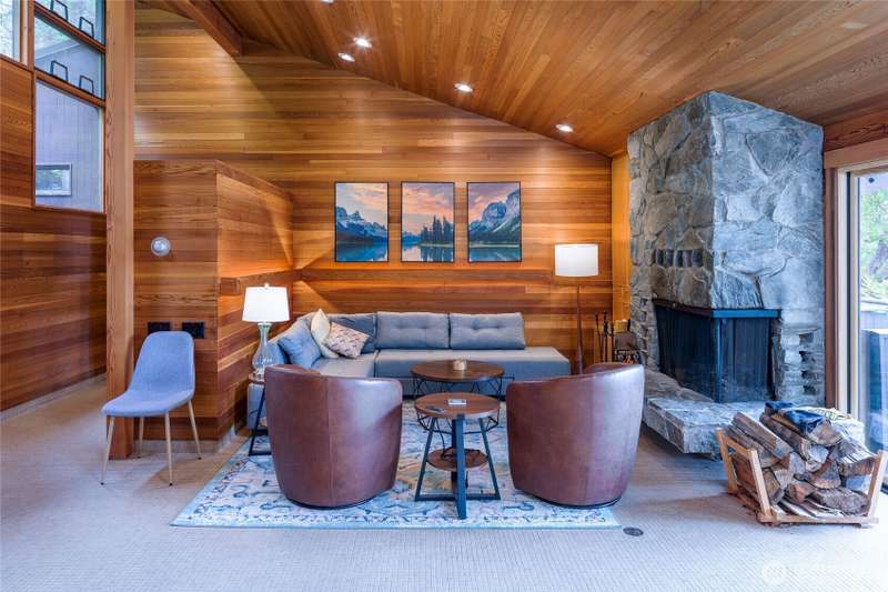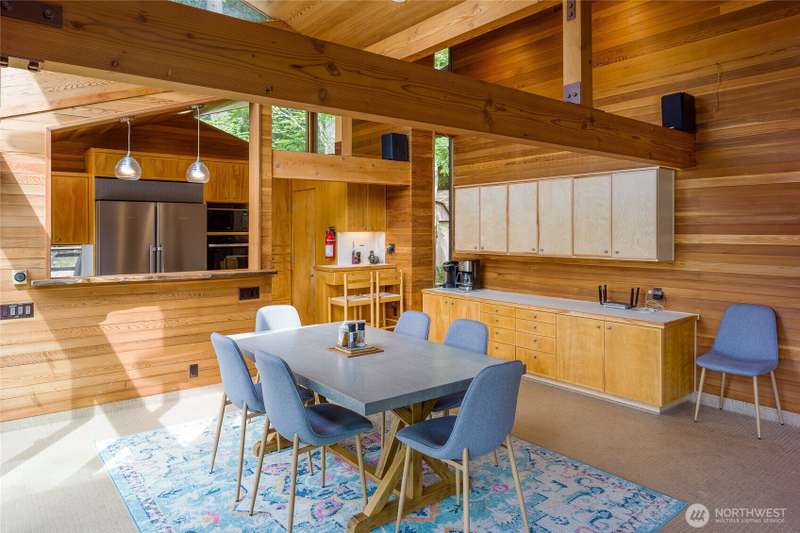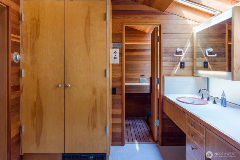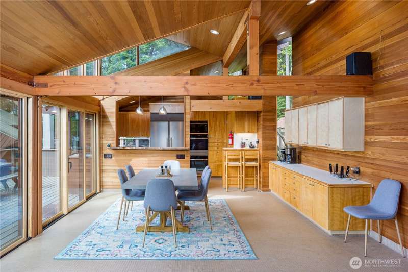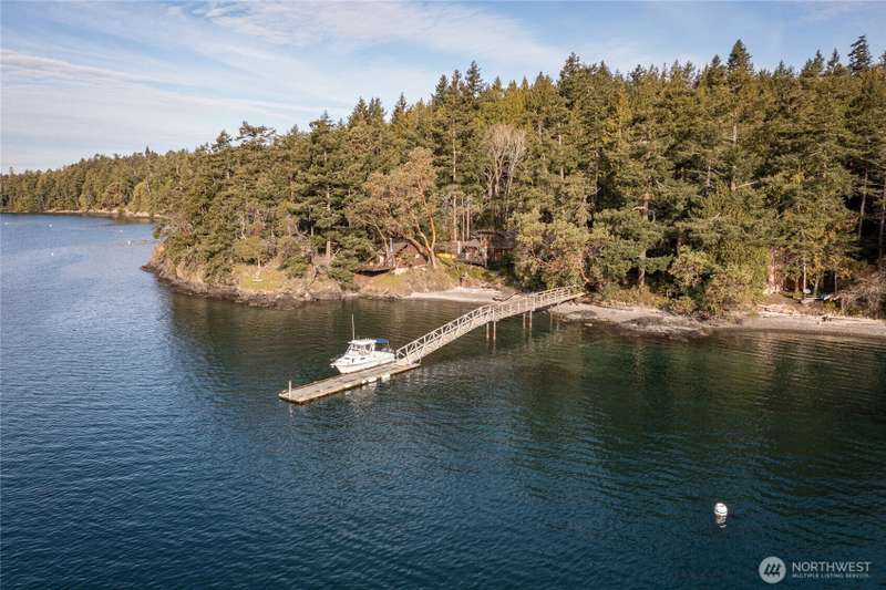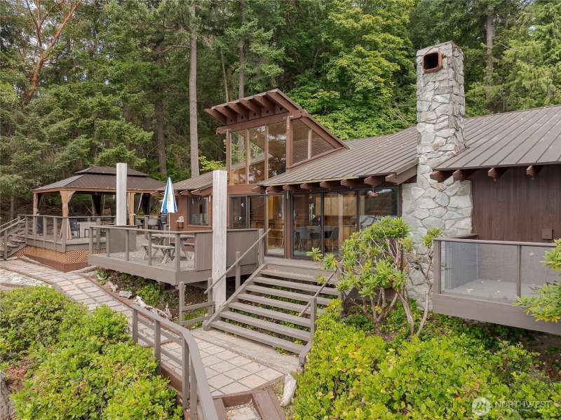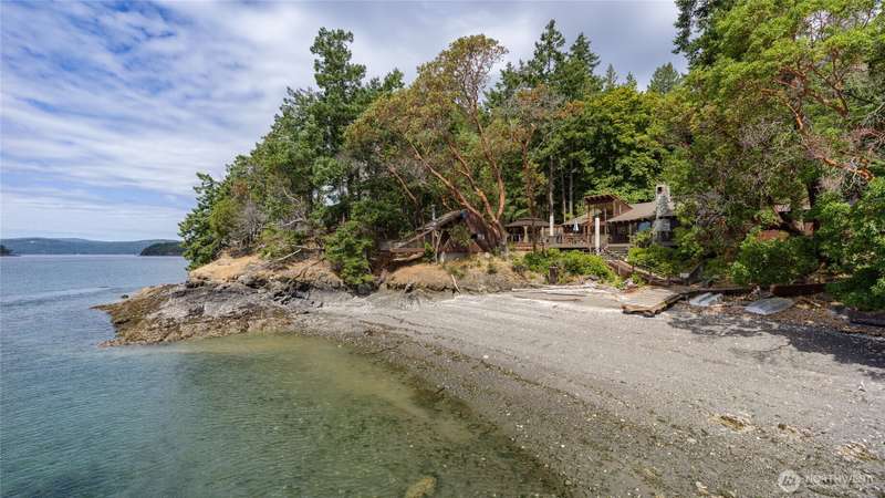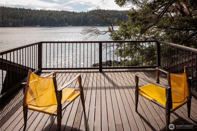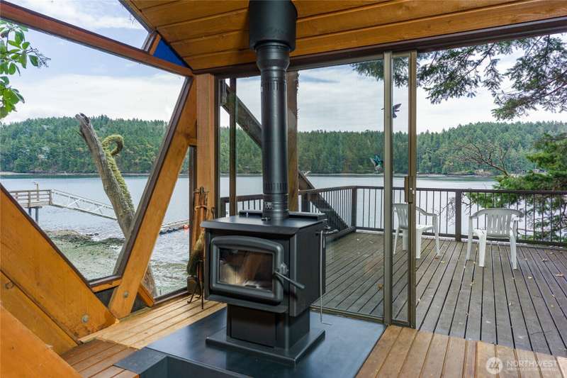 Crane Island Waterfront Gem. Many recent upgrades & updates to this property have added even more to this unique property. Dock your boat at the shared dock adjoining the property, wander up past the cove beach to the south-facing classic mid-century modern retreat. Designed by acclaimed architect Paul Hoag, the main house blends nature outdoors & tranquility within. New appliances throughout, updated lighting and plumbing fixtures, and a freshly tiled primary bath floor with radiant heat add to the ambiance of the old-growth cedar-lined walls and stone fireplace. Guesthouse, designed by acclaimed architect Wendell Lovett, is genuinely one of a kind. The outdoor areas are designed for entertaining & making the most of island life.