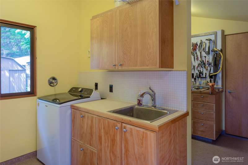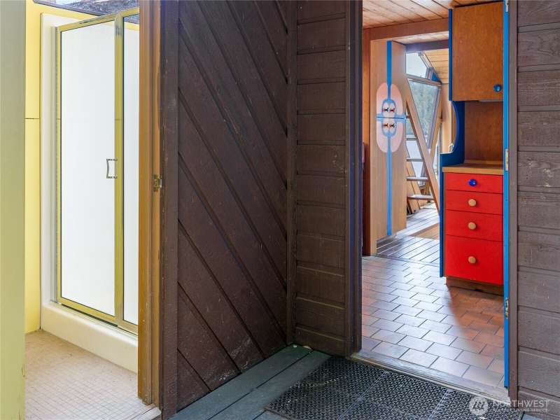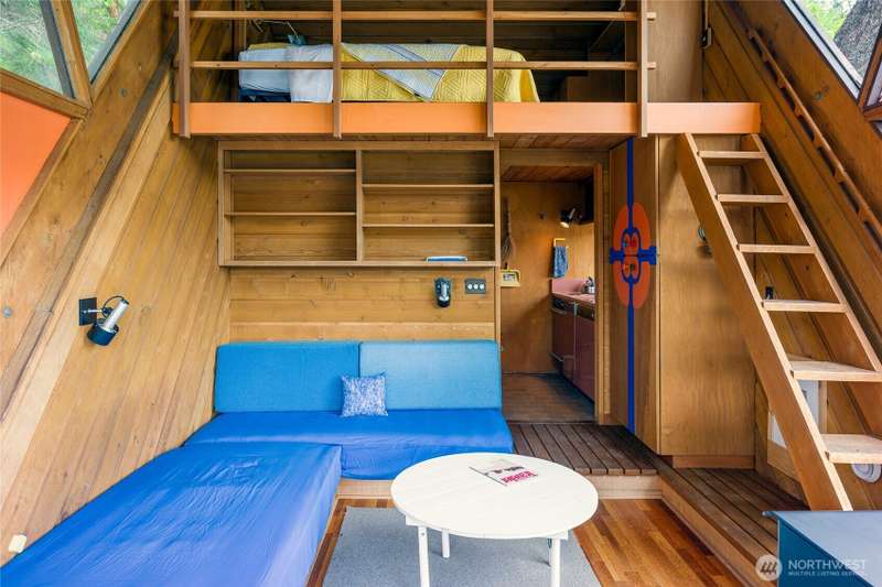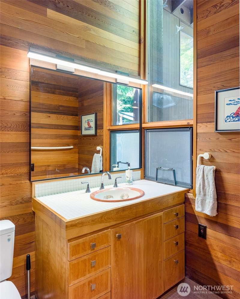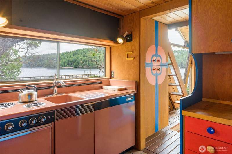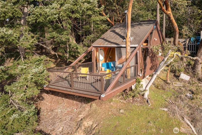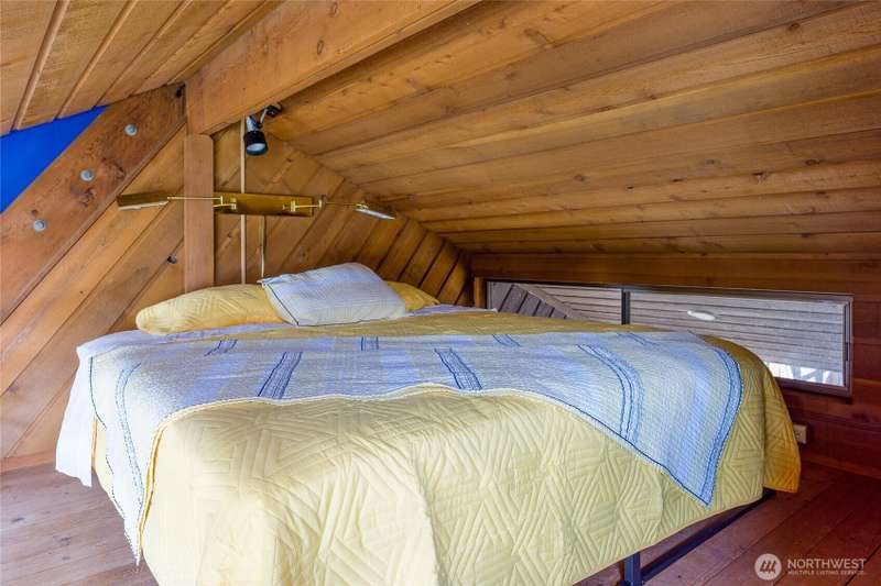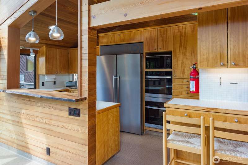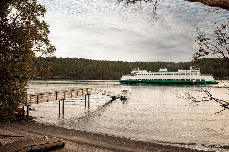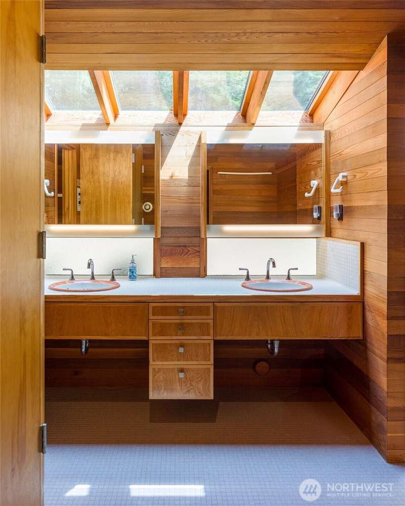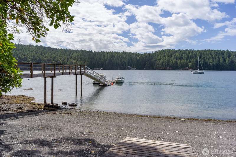 Crane Island Waterfront Gem. Many recent upgrades & updates to this property have added even more to this unique property. Dock your boat at the shared dock adjoining the property, wander up past the cove beach to the south-facing classic mid-century modern retreat. Designed by acclaimed architect Paul Hoag, the main house blends nature outdoors & tranquility within. New appliances throughout, updated lighting and plumbing fixtures, and a freshly tiled primary bath floor with radiant heat add to the ambiance of the old-growth cedar-lined walls and stone fireplace. Guesthouse, designed by acclaimed architect Wendell Lovett, is genuinely one of a kind. The outdoor areas are designed for entertaining & making the most of island life.