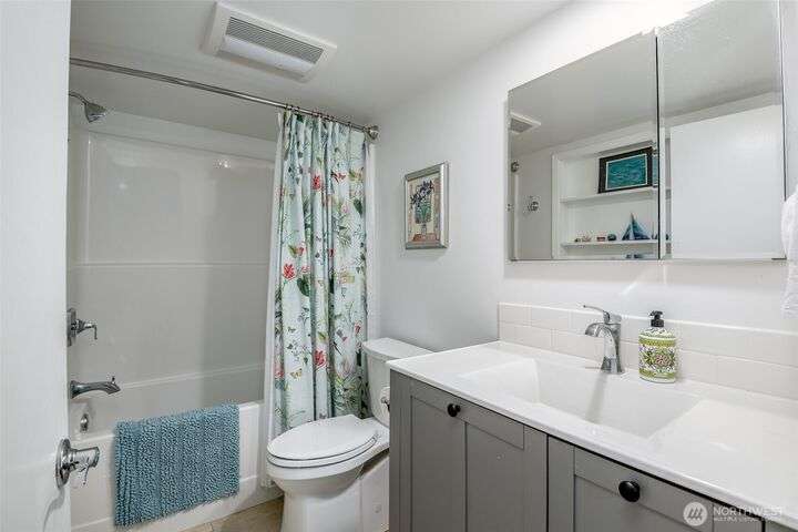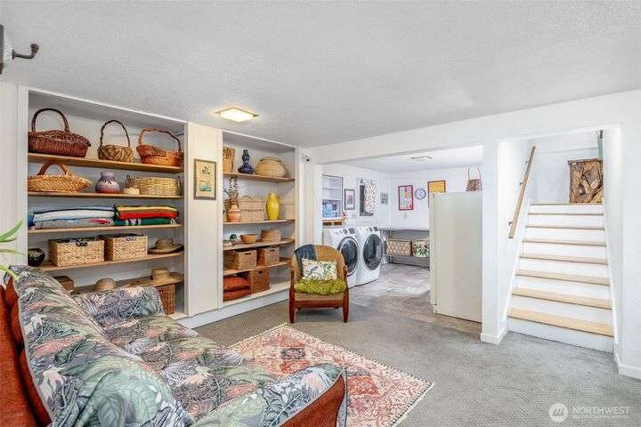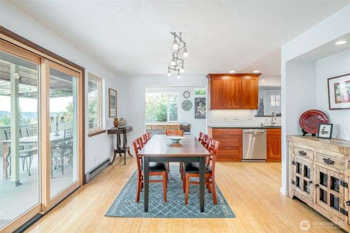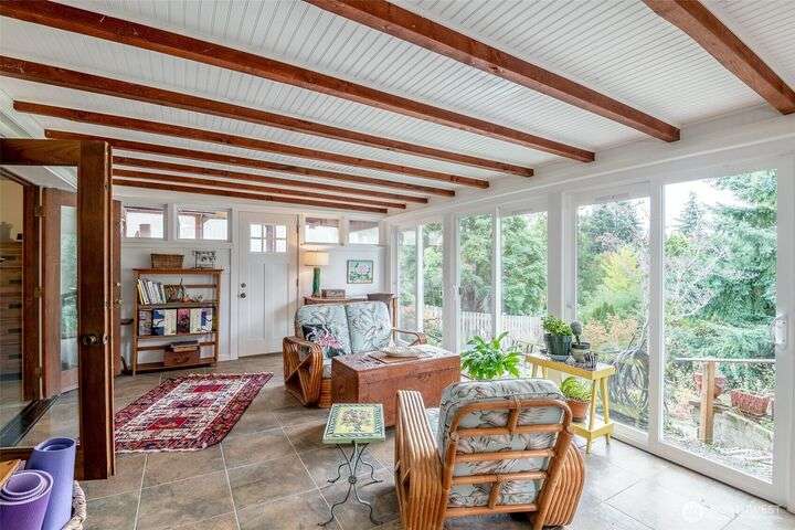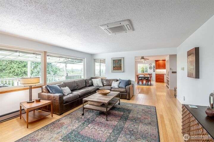 Built in 1963, this special home, still in the original owner's family, is filled with natural light and warmth. The main floor features a spacious living room, dining area, one bedroom, and bath, as well as a chef’s kitchen equipped with a six-burner gas range, double oven, and ample storage. Downstairs, the primary bedroom opens to a sunroom overlooking the lush yard. A family room, bedroom with an ensuite, full bath, and bonus spaces provide room for gathering, creating, or working from home. The spacious deck offers a gorgeous territorial view with the Sound and bridge in the distance. The terraced backyard is full of beauty with fruit trees and garden boxes. Don’t miss the greenhouse, art spaces, and RV parking with sewer hookup.
