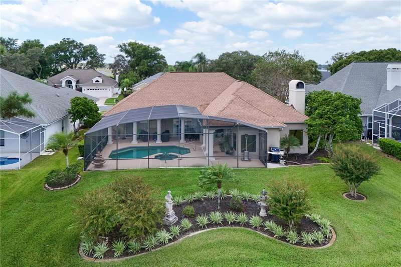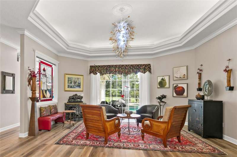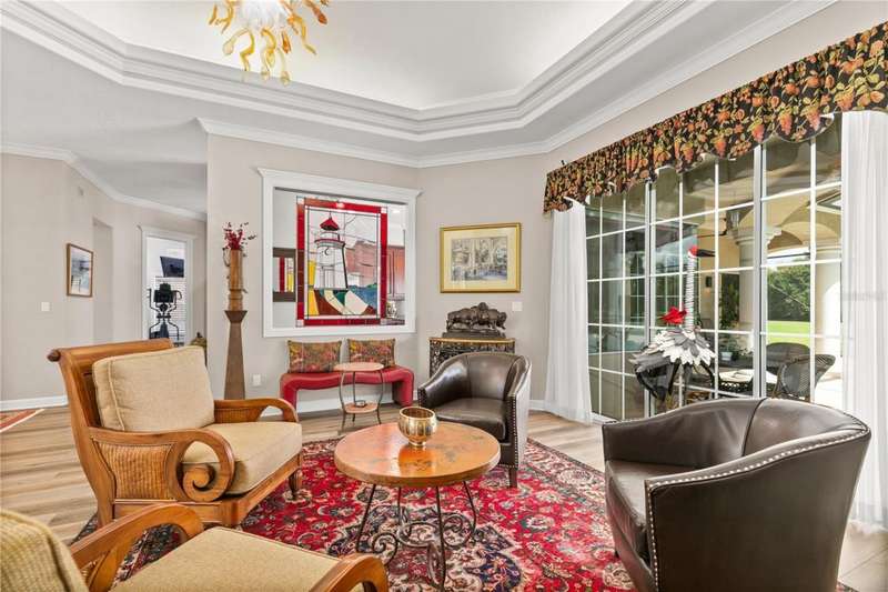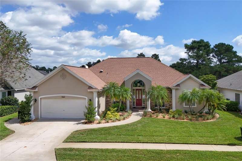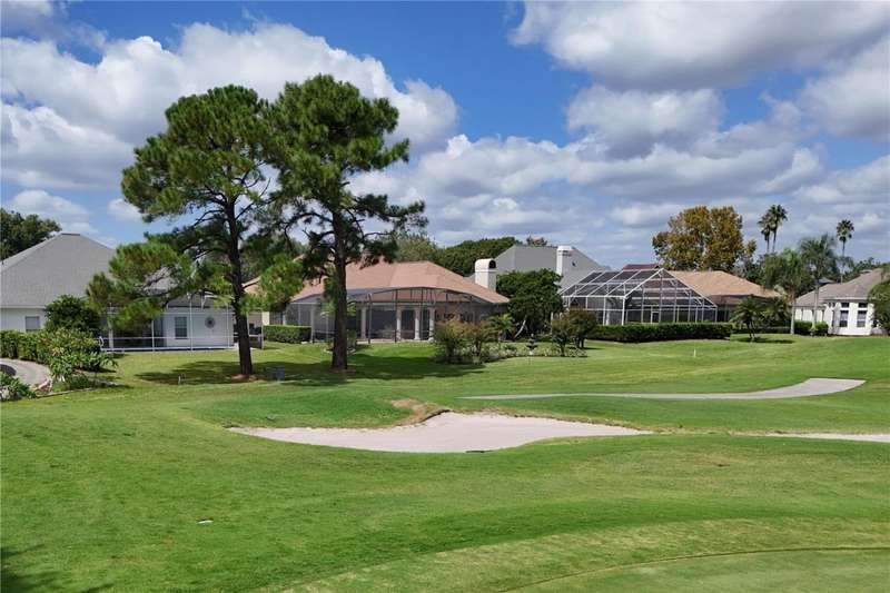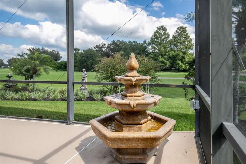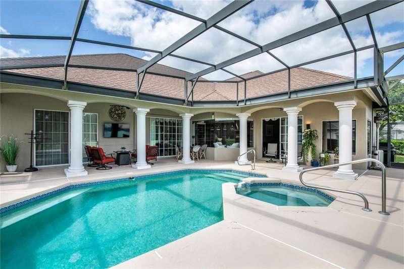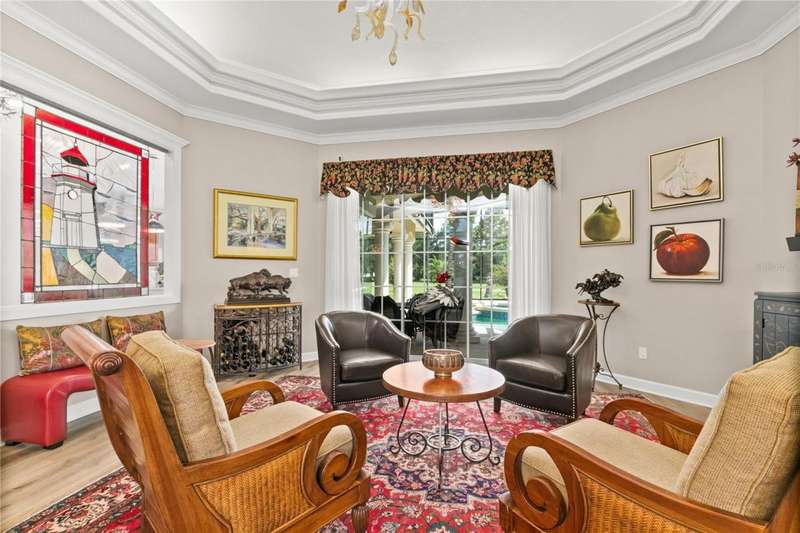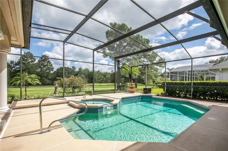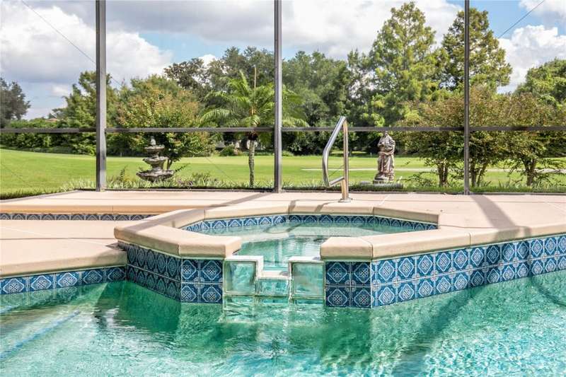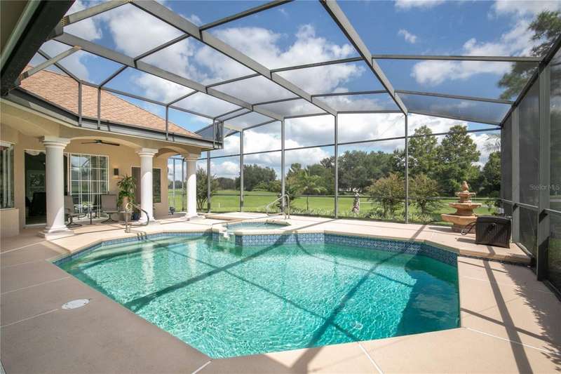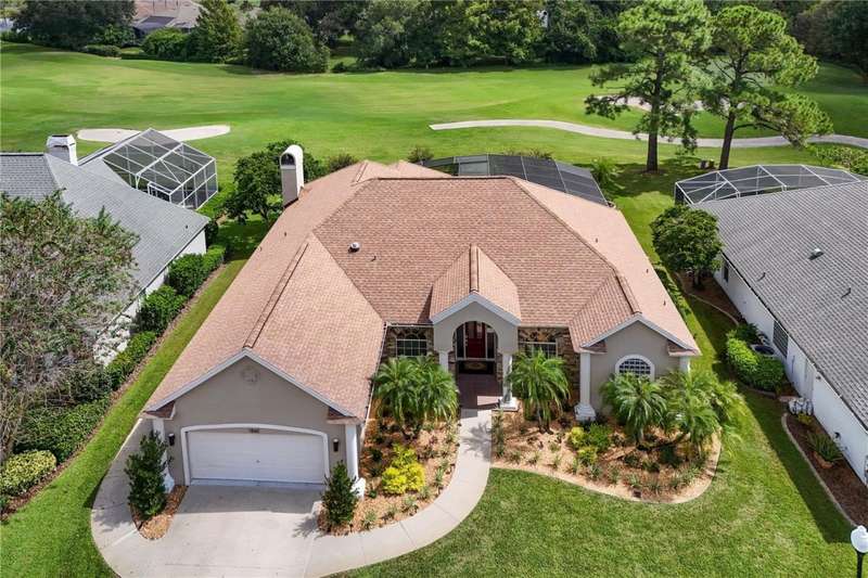 Welcome to an exceptional home in the Country Club of Mount Dora, set directly on the scenic second green with breathtaking golf course views. Designed with both comfort and sophistication in mind, this three-bedroom, two-and-a-half-bath residence has been thoughtfully updated and meticulously maintained, offering over 2,500 square feet of inviting living space.The primary suite is a true sanctuary, featuring a tray ceiling, sliding doors to the pool, a luxurious bath with a jetted soaking tub, an oversized walk-in shower, and a custom-designed closet with built-ins. The gourmet kitchen is a standout, complete with Sub-Zero refrigerator and freezer, KitchenAid ice maker, new Bosch dishwasher, granite counters, upgraded backsplash, and a built-in wine cooler. Just steps away, the family room with its fireplace and expansive windows creates a warm, light-filled gathering space.This home blends timeless elegance with modern enhancements, including luxury vinyl flooring, tall interior doors, crown molding, and striking new lighting-such as a dramatic Chihuly chandelier in the living room and a sparkling crystal fixture in the dining area. A custom office with floor-to-ceiling cabinetry and a built-in desk provides an ideal workspace, while the addition of a Murphy bed wall unit offers versatility for guests.Outdoor living is at its finest here. The heated saltwater pool and spa is enclosed within a refreshed screened lanai, accented by a new fountain and an epoxy-coated deck. The surrounding landscape has been completely redesigned, creating a lush and private retreat for relaxation and entertaining.Practical updates bring peace of mind, including a scheduled installation of a new architectural shingle roof in October 2025, leveled driveway and sidewalks, new plantation shutters and window coverings, and updated light fixtures. A two-car garage with a new opener, separate golf cart bay, and workshop provide convenience, while the tankless hot water system and 2019 HVAC ensure everyday efficiency.From the stunning golf course backdrop to the thoughtful upgrades inside and out, this home offers a perfect blend of style, functionality, and luxury living in one of Mount Dora's most desirable communities.