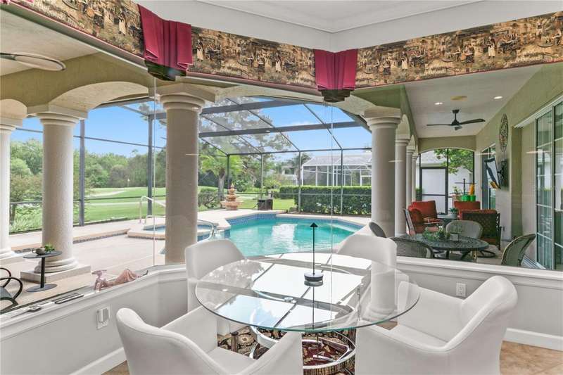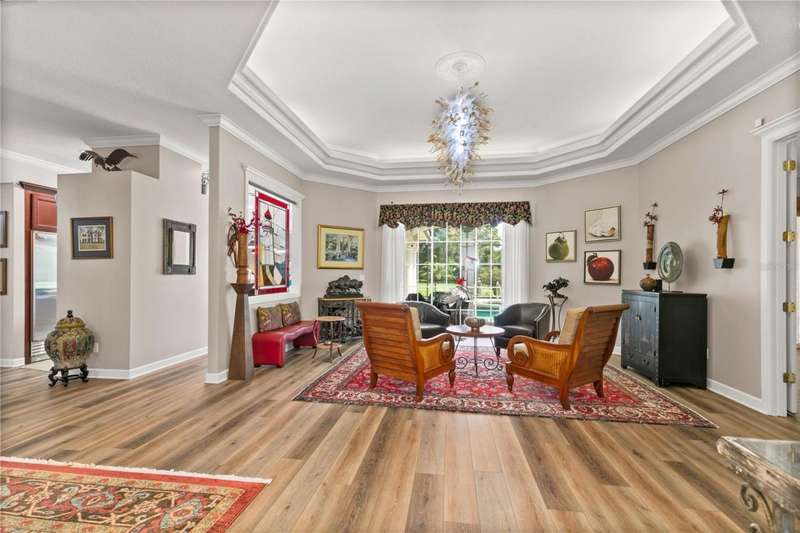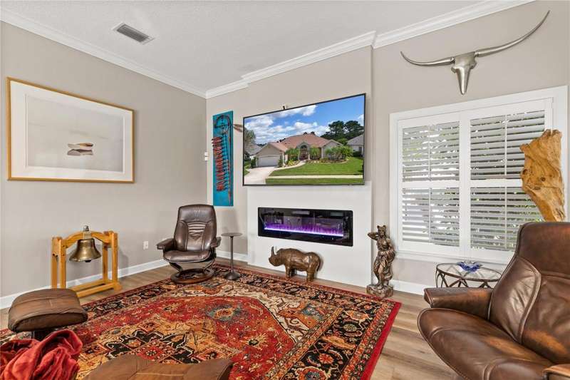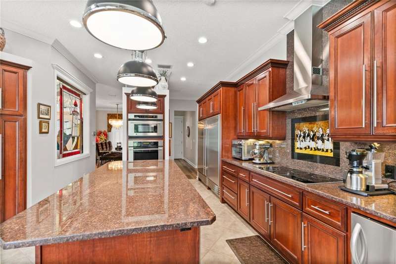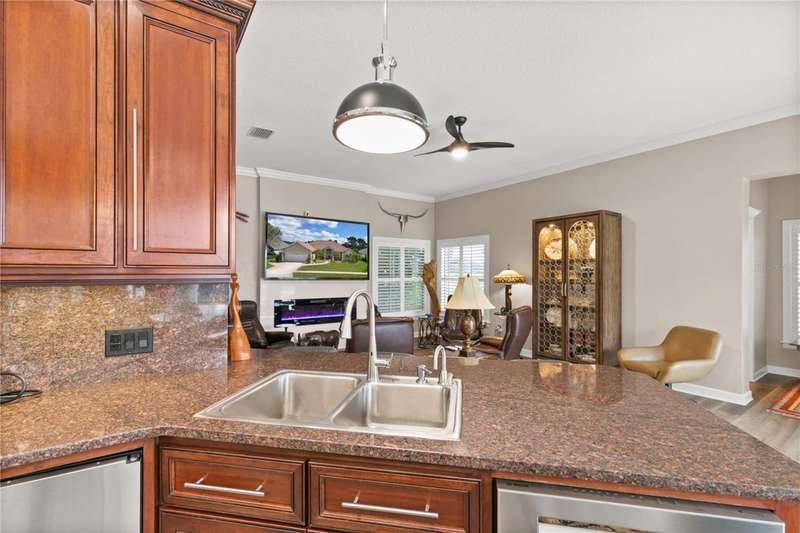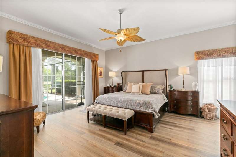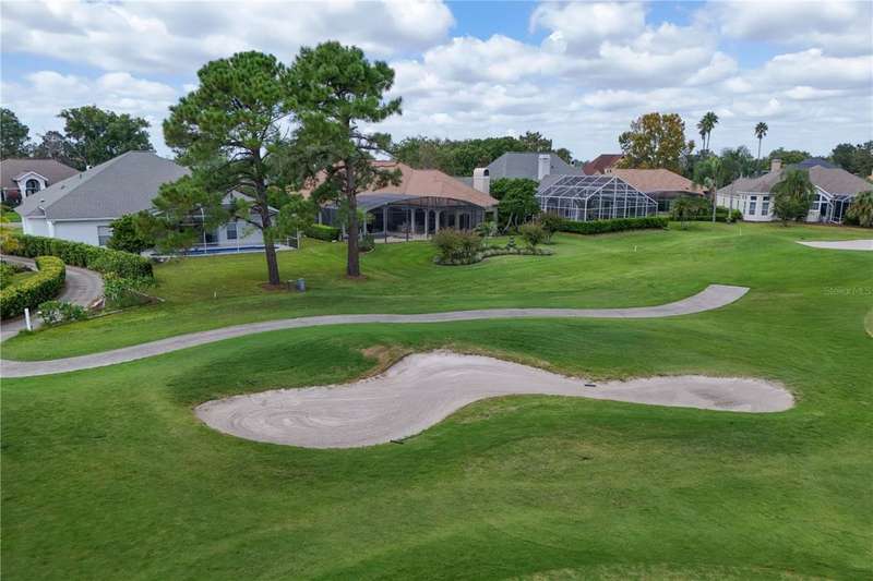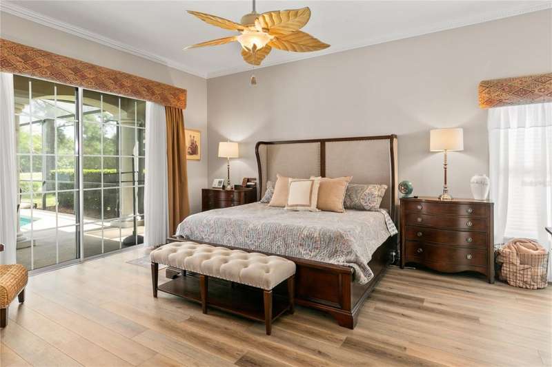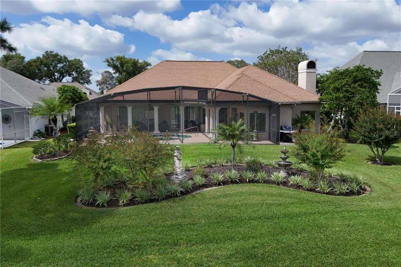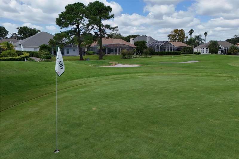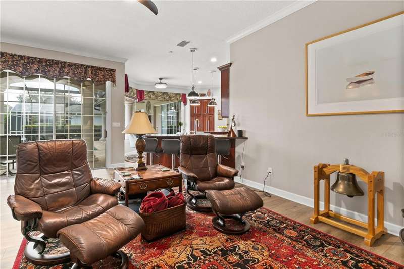 Welcome to an exceptional home in the Country Club of Mount Dora, set directly on the scenic second green with breathtaking golf course views. Designed with both comfort and sophistication in mind, this three-bedroom, two-and-a-half-bath residence has been thoughtfully updated and meticulously maintained, offering over 2,500 square feet of inviting living space.The primary suite is a true sanctuary, featuring a tray ceiling, sliding doors to the pool, a luxurious bath with a jetted soaking tub, an oversized walk-in shower, and a custom-designed closet with built-ins. The gourmet kitchen is a standout, complete with Sub-Zero refrigerator and freezer, KitchenAid ice maker, new Bosch dishwasher, granite counters, upgraded backsplash, and a built-in wine cooler. Just steps away, the family room with its fireplace and expansive windows creates a warm, light-filled gathering space.This home blends timeless elegance with modern enhancements, including luxury vinyl flooring, tall interior doors, crown molding, and striking new lighting-such as a dramatic Chihuly chandelier in the living room and a sparkling crystal fixture in the dining area. A custom office with floor-to-ceiling cabinetry and a built-in desk provides an ideal workspace, while the addition of a Murphy bed wall unit offers versatility for guests.Outdoor living is at its finest here. The heated saltwater pool and spa is enclosed within a refreshed screened lanai, accented by a new fountain and an epoxy-coated deck. The surrounding landscape has been completely redesigned, creating a lush and private retreat for relaxation and entertaining.Practical updates bring peace of mind, including a scheduled installation of a new architectural shingle roof in October 2025, leveled driveway and sidewalks, new plantation shutters and window coverings, and updated light fixtures. A two-car garage with a new opener, separate golf cart bay, and workshop provide convenience, while the tankless hot water system and 2019 HVAC ensure everyday efficiency.From the stunning golf course backdrop to the thoughtful upgrades inside and out, this home offers a perfect blend of style, functionality, and luxury living in one of Mount Dora's most desirable communities.