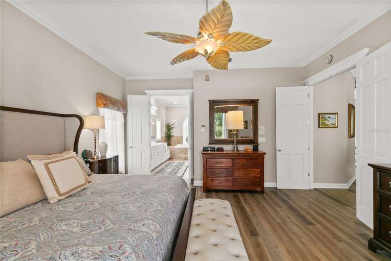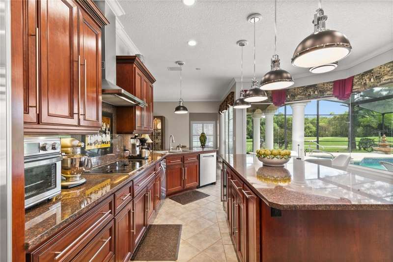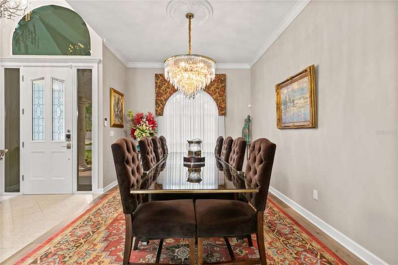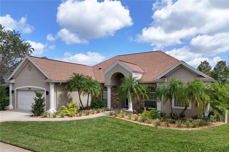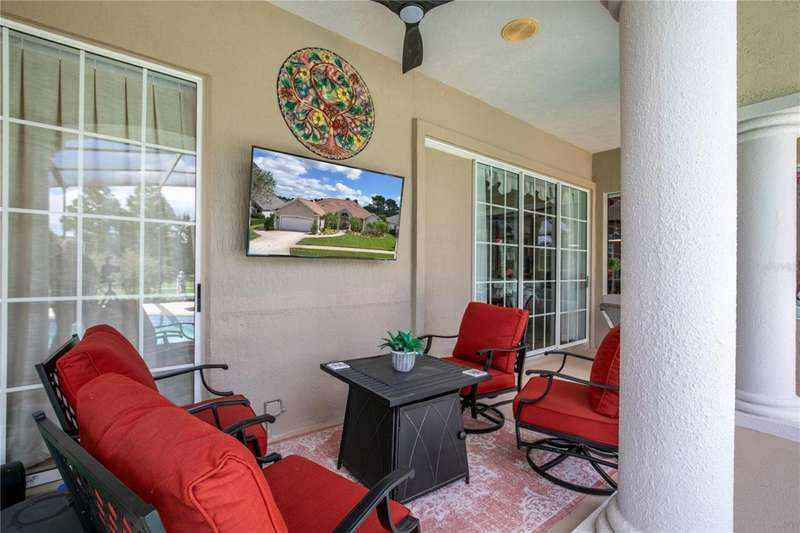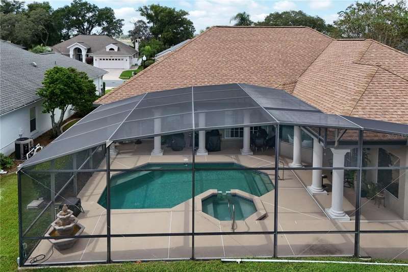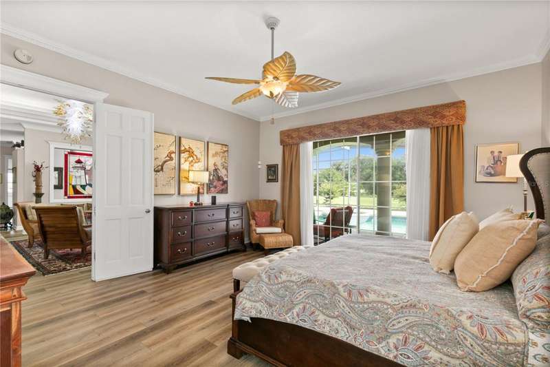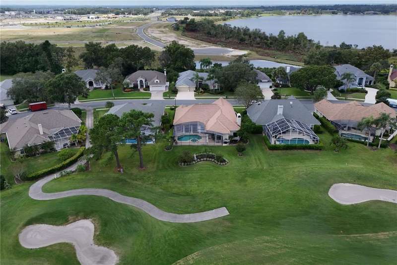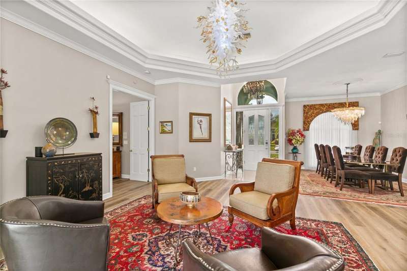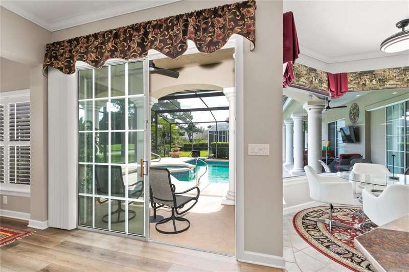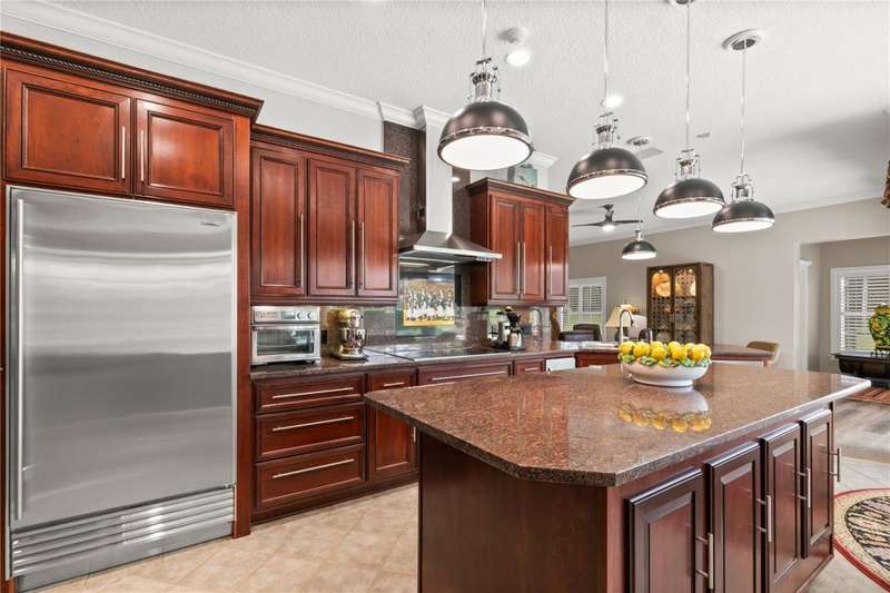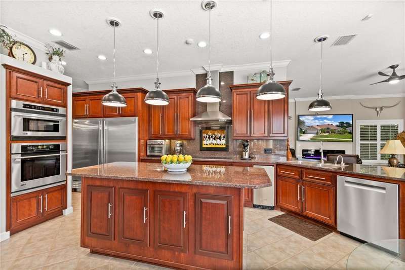 Welcome to an exceptional home in the Country Club of Mount Dora, set directly on the scenic second green with breathtaking golf course views. Designed with both comfort and sophistication in mind, this three-bedroom, two-and-a-half-bath residence has been thoughtfully updated and meticulously maintained, offering over 2,500 square feet of inviting living space.The primary suite is a true sanctuary, featuring a tray ceiling, sliding doors to the pool, a luxurious bath with a jetted soaking tub, an oversized walk-in shower, and a custom-designed closet with built-ins. The gourmet kitchen is a standout, complete with Sub-Zero refrigerator and freezer, KitchenAid ice maker, new Bosch dishwasher, granite counters, upgraded backsplash, and a built-in wine cooler. Just steps away, the family room with its fireplace and expansive windows creates a warm, light-filled gathering space.This home blends timeless elegance with modern enhancements, including luxury vinyl flooring, tall interior doors, crown molding, and striking new lighting-such as a dramatic Chihuly chandelier in the living room and a sparkling crystal fixture in the dining area. A custom office with floor-to-ceiling cabinetry and a built-in desk provides an ideal workspace, while the addition of a Murphy bed wall unit offers versatility for guests.Outdoor living is at its finest here. The heated saltwater pool and spa is enclosed within a refreshed screened lanai, accented by a new fountain and an epoxy-coated deck. The surrounding landscape has been completely redesigned, creating a lush and private retreat for relaxation and entertaining.Practical updates bring peace of mind, including a scheduled installation of a new architectural shingle roof in October 2025, leveled driveway and sidewalks, new plantation shutters and window coverings, and updated light fixtures. A two-car garage with a new opener, separate golf cart bay, and workshop provide convenience, while the tankless hot water system and 2019 HVAC ensure everyday efficiency.From the stunning golf course backdrop to the thoughtful upgrades inside and out, this home offers a perfect blend of style, functionality, and luxury living in one of Mount Dora's most desirable communities.