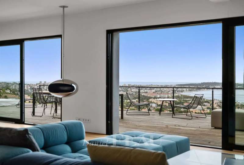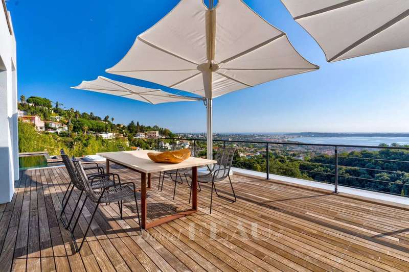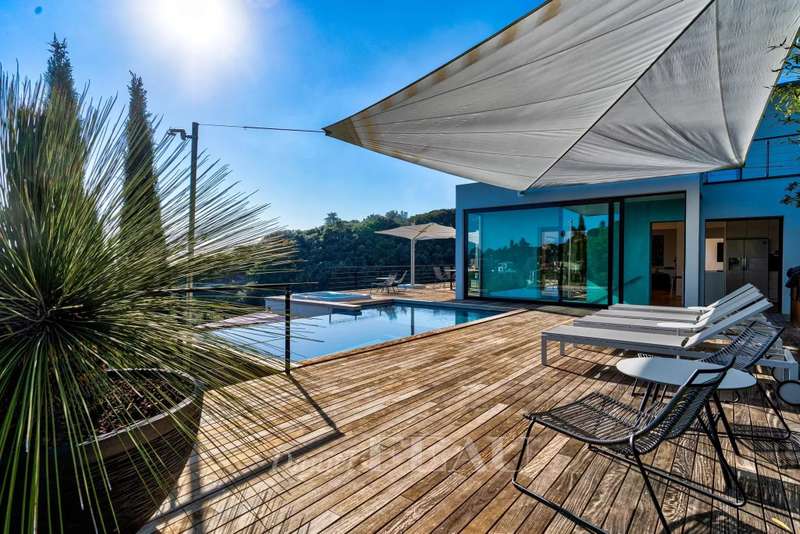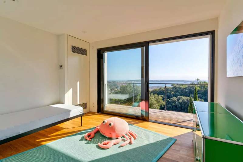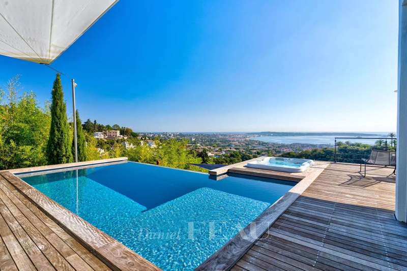 This architect-designed property set in 1537 sqm of grounds facing the sea is on the heights of Golfe-Juan, 5 minutes from the beaches, the shops and the schools, and 10 minutes from Cannes and Antibes. Commanding open views, it includes spacious living/reception rooms, and six bedrooms including a master suite benefiting from terraces. Air conditioning, parquet flooring. With a swimming pool and a jacuzzi hidden from view and enjoying a sea view, as well as a carport benefiting from a lift accessing the main house.
