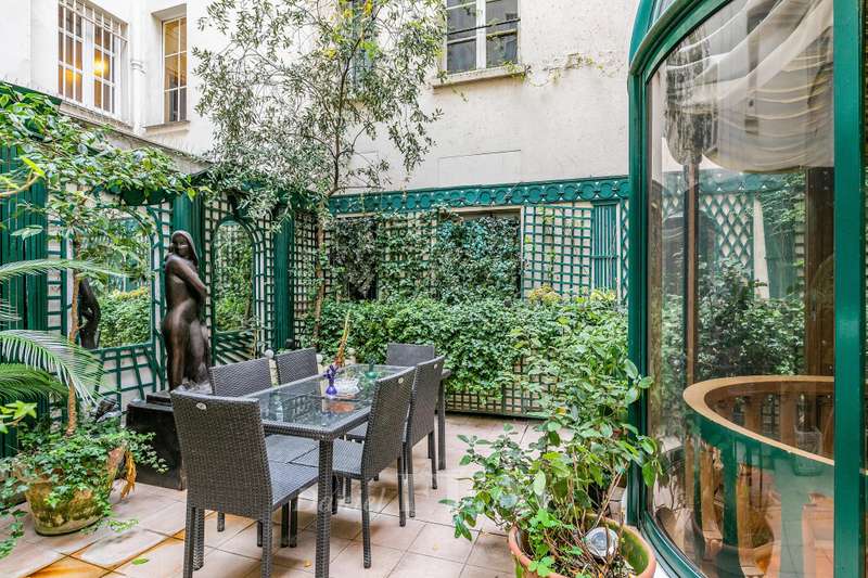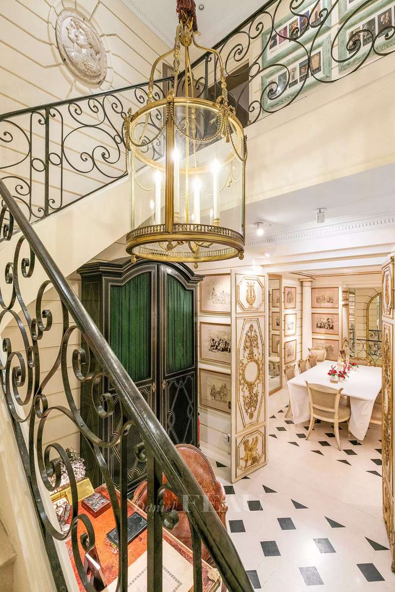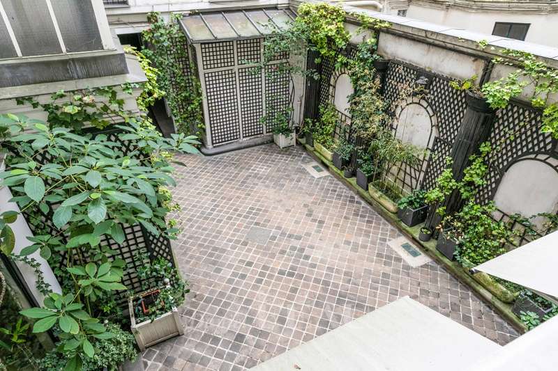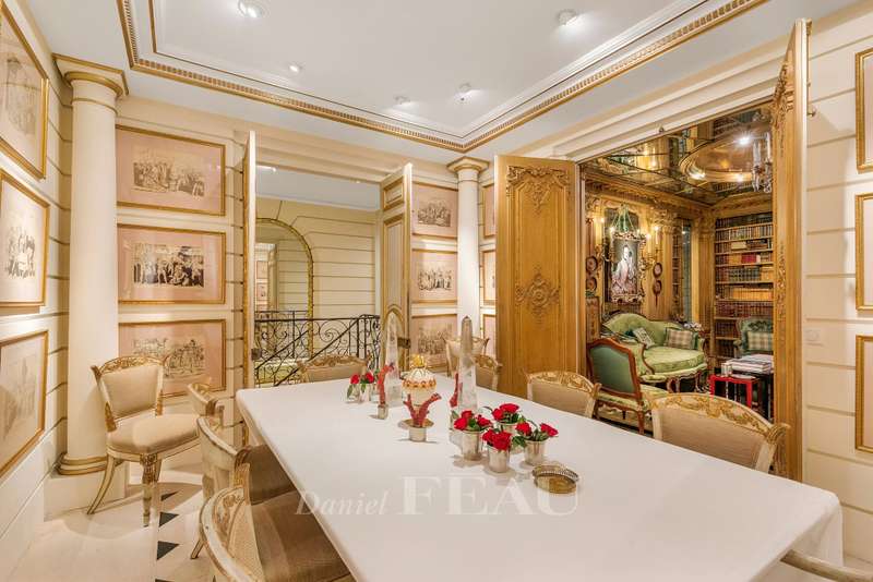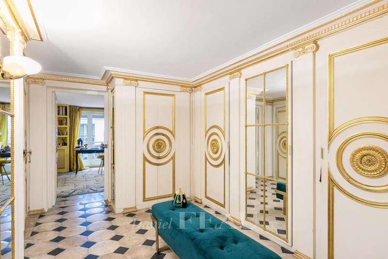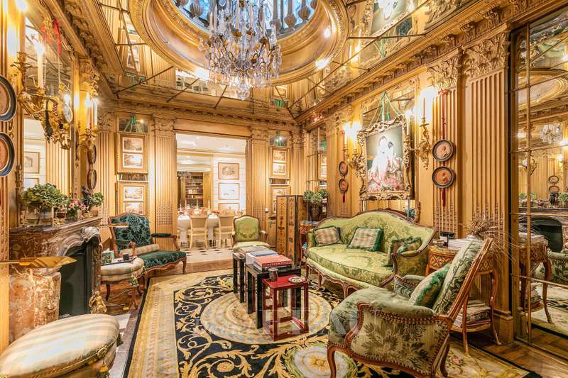 Rue de Rivoli, a stone’s throw from Place Vendôme. Hidden from view to the rear of an elegant building, this remarkable apartment on three floors benefiting from lift access overlooks a beautiful leafy paved courtyard. With the feel of a private house, it offers 300 sqm of living space which has been entirely remodelled in the ornate style of the 18th century. Superb features including panelling, mirrors, plasterwork, marble, wrought iron and Versailles-style parquet flooring ally with the latest in contemporary comfort. The garden level includes an entrance hall with a vestibule, a panelled living/reception room, a study, a dining room, and a library area. On the entresol, a 28 sqm terrace hidden from view is set between two complete master suites each with a bathroom and a dressing room. Accessed both by an interior staircase and the buildings common areas, a renovated 30 sqm apartment on the 1st floor comprises a living room with a kitchen, a bedroom and a shower room. The basement comprises a spacious kitchen/dining room, a utility room and a staff bedroom. An exceptional apartment in a prime location.