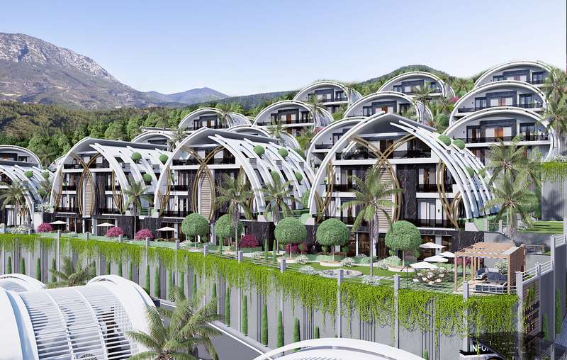 The health center is 3.5 km, the sea is 4 km, the Mahmutlar center is 8 km, and Gazipasa-Alanya Airport is 20 km to flats in Alanya for sale.
