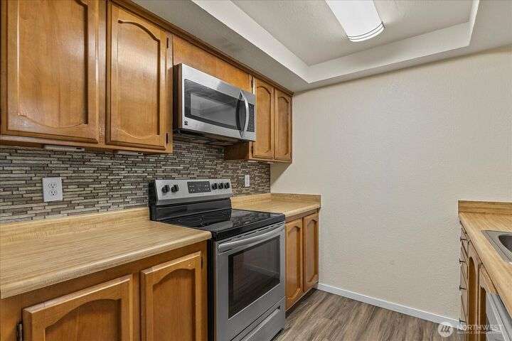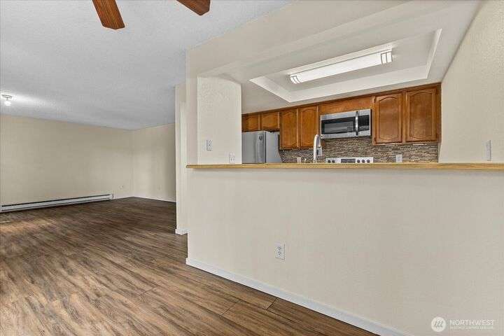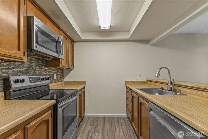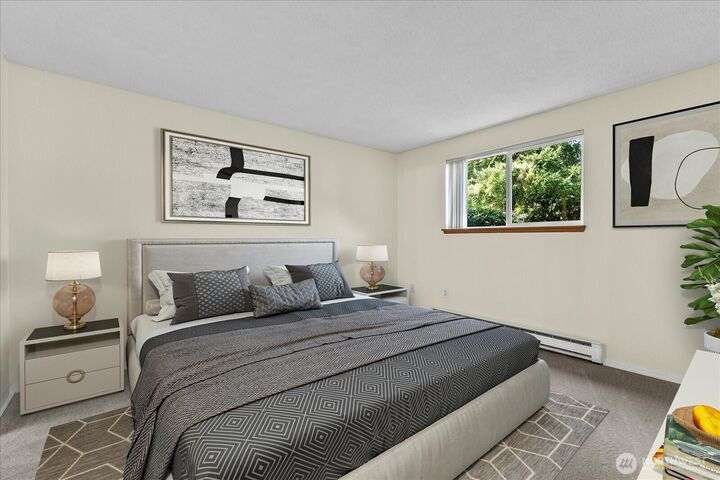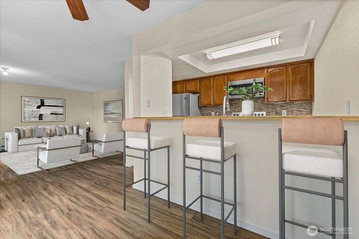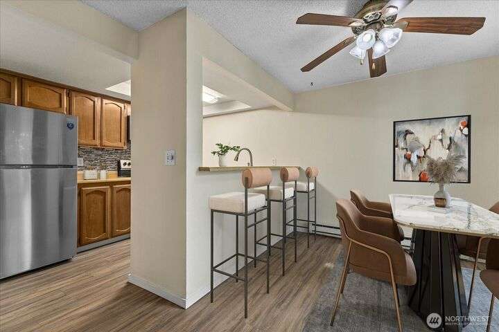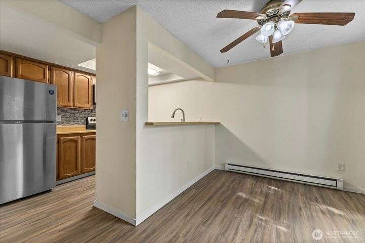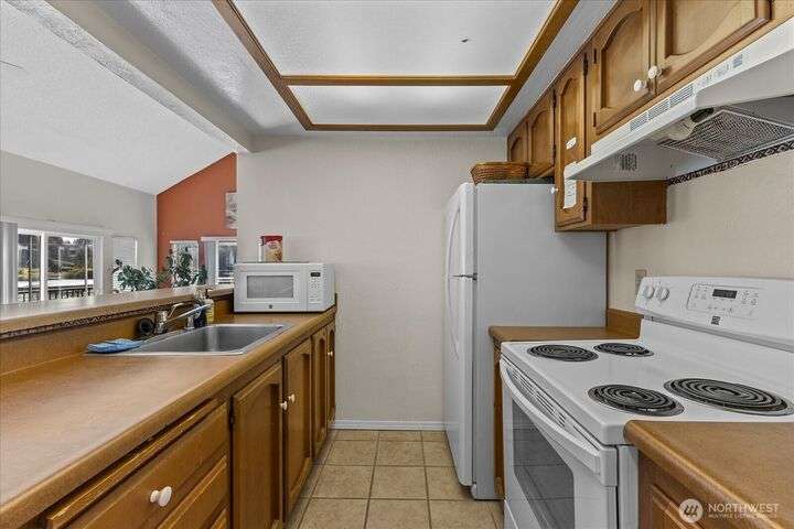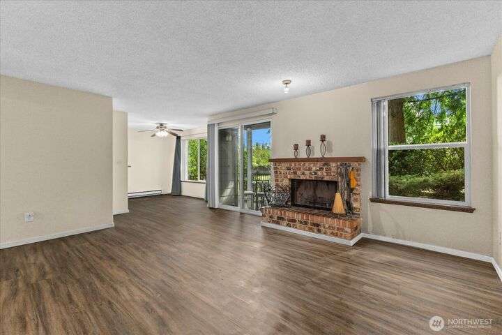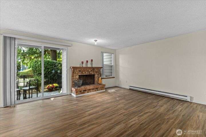 Desirable ground-floor 2 bed/2 bath unit at The Village by the Lake Condominiums. Move-in ready & updated w/ fresh paint, new fridge, flooring & trim! This home features a living room w/ fireplace, dining area & kitchen w/ SS appliances. Spacious fenced in patio area, perfect for outdoor furniture, great for dogs & ease of walking right out to the lawn area & pool. 1 assigned parking space & plenty for guests. This charming community features lake access, swimming pool, athletic court & a clubhouse. Well-maintained complex w/ recently replaced windows & siding! No special assessments on this unit $14K+ all paid. Dues include water, sewer & garbage. close to shopping, I-5, downtown, Boeing, Airport & Forest Park. Welcome Home!