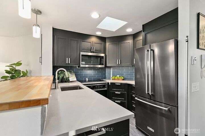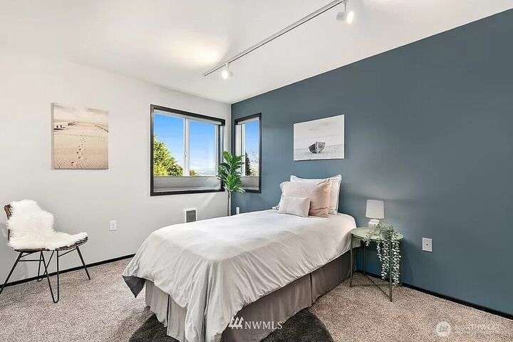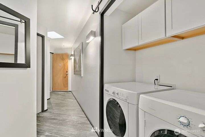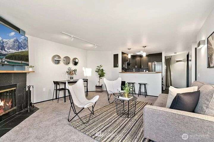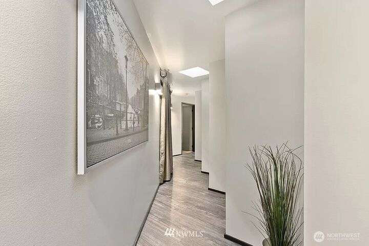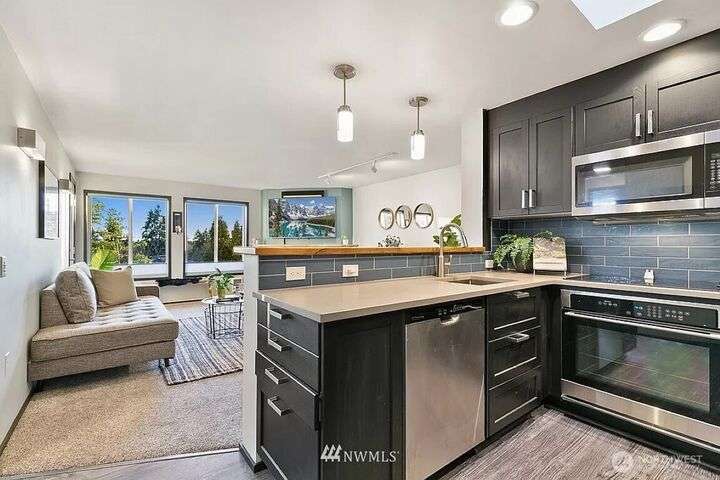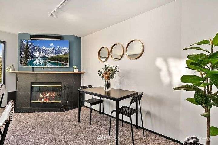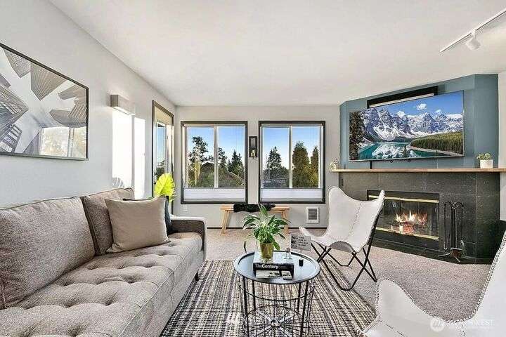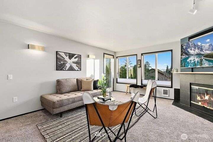 Available now. Furnished top-floor Greenwood gem. You'll love soaking in the sunsets and sunrise in this open-format two-bed, two-bath condo with fireplace. Natural light abounds with multiple skylights throughout. Newer updates including paint, floors, and appliances. Deck overlooking trees and ample storage in-unit plus 2 secure parking spaces. The furnishings are all newer and in excellent condition. Includes portable A/C unit. Access to multiple modes of transit makes life easy. Water, sewer, garbage and 2 parking spaces included in the rental rate. You'll love being close to all Greenwood has to offer, or go just a little further to enjoy Green lake, Ballard, Golden Gardens and more!
