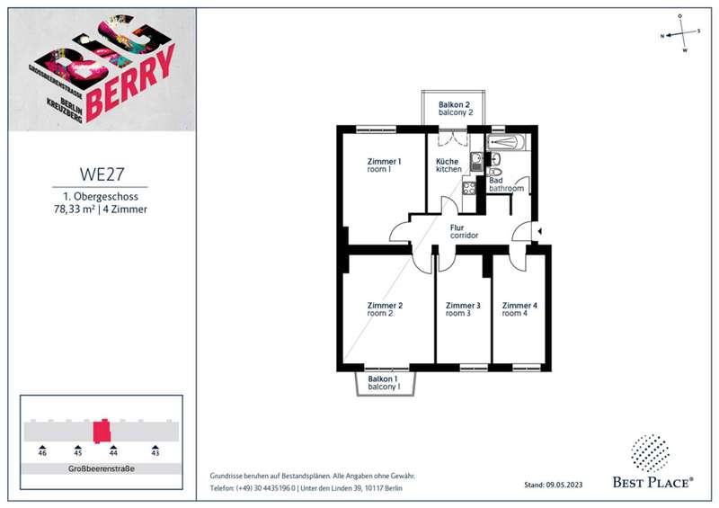 Your investment in the centre of trendy Kreuzberg: with this efficiently designed 4-room flat, you are investing in a place where young people, professionals and families want to live. The flat with approx. 78 sqm is located on the 1st floor of the six-storey residential building. It has two beautiful balconies, one facing the garden courtyard to the east and one on the opposite side facing Großbeerenstraße. The bathtub in the bathroom provides a wellness feeling. Thanks to its practical layout and size, the flat is ideal for families, couples and singles. Our coveted Big Berry investment project offers investors solidly rented flats in one of Berlin's most sought-after neighbourhoods. The six-storey residential building with four storeys was built in the 1950s and a new top floor was added in 2023. It has 76 flats with one to four rooms and approx. 26 to 108 m². A lift was added as part of the loft extension, which also benefits the existing flats. Big Berry also includes an idyllic garden courtyard and 17 car parking spaces.