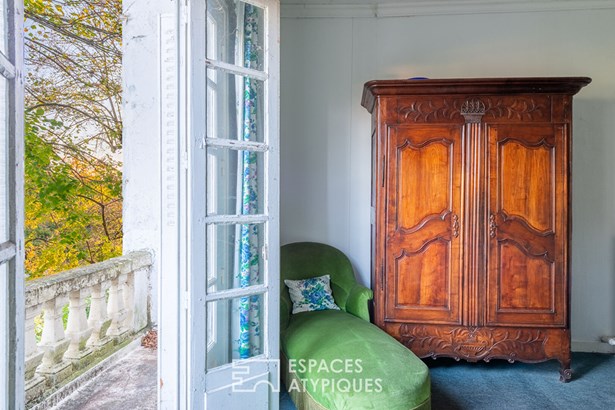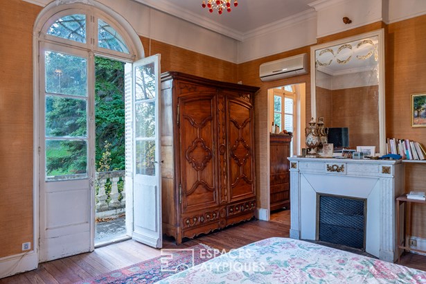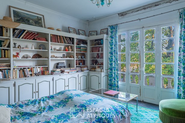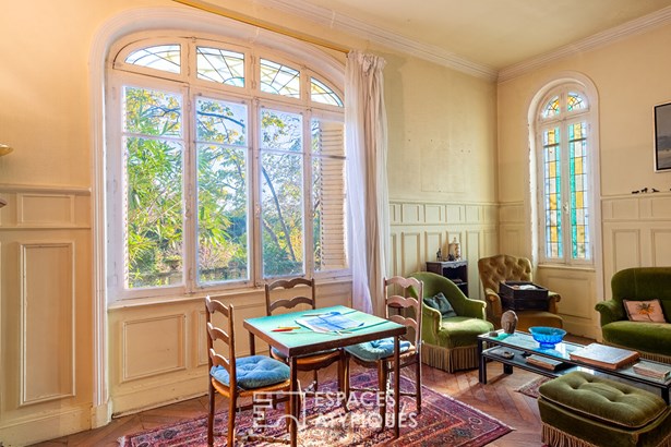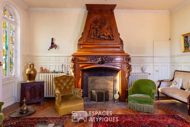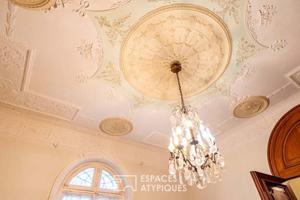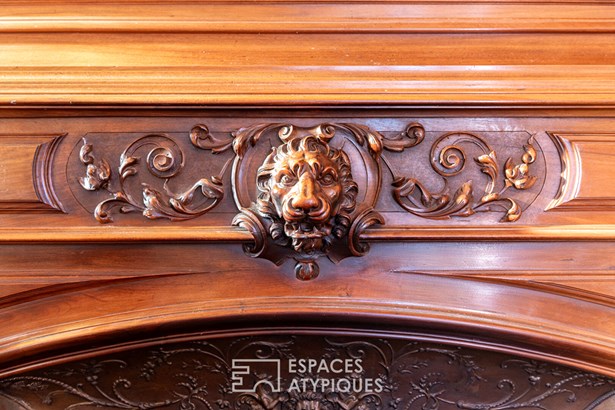 On the ground floor, a dining room adorned with mouldings and an incredible ceiling featuring representations of the Emperor Napoleon's sisters bears witness to the history that inhabits these premises. The grand salon, the centrepiece of the house, is enhanced by a monumental fireplace adorned with sculptures evoking carved hunting scenes. The kitchen with its discreet patio, a shower room, a library area with marble fireplace and other surprises!