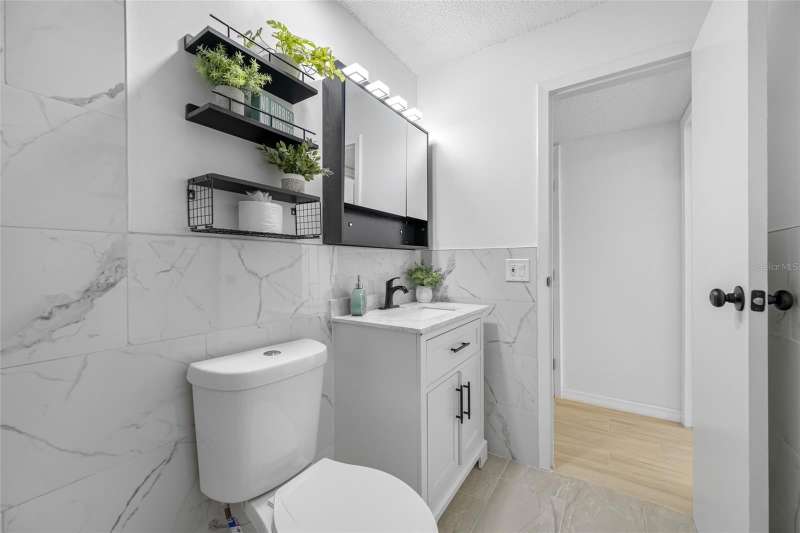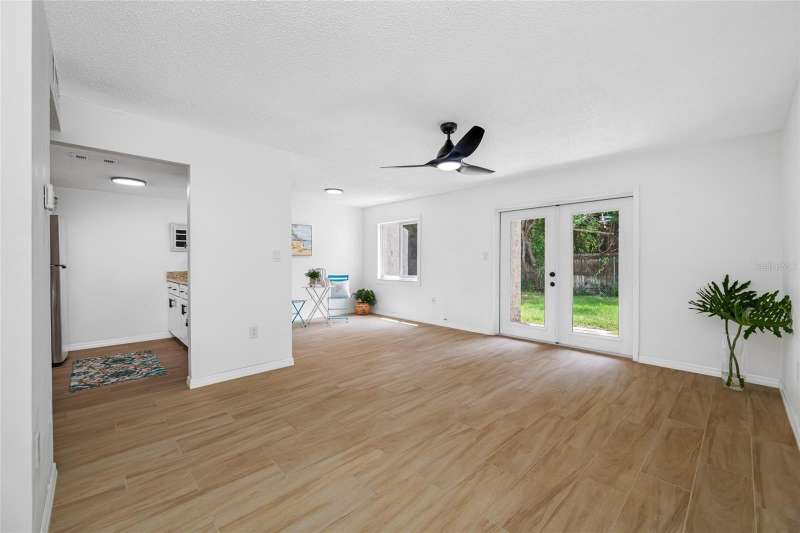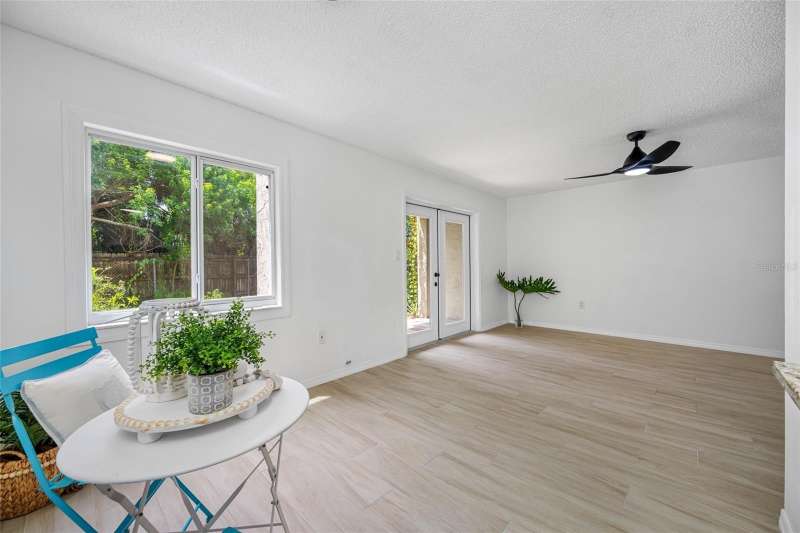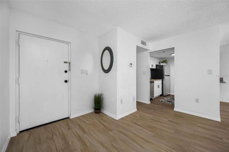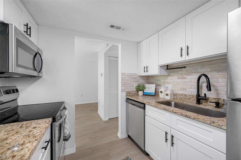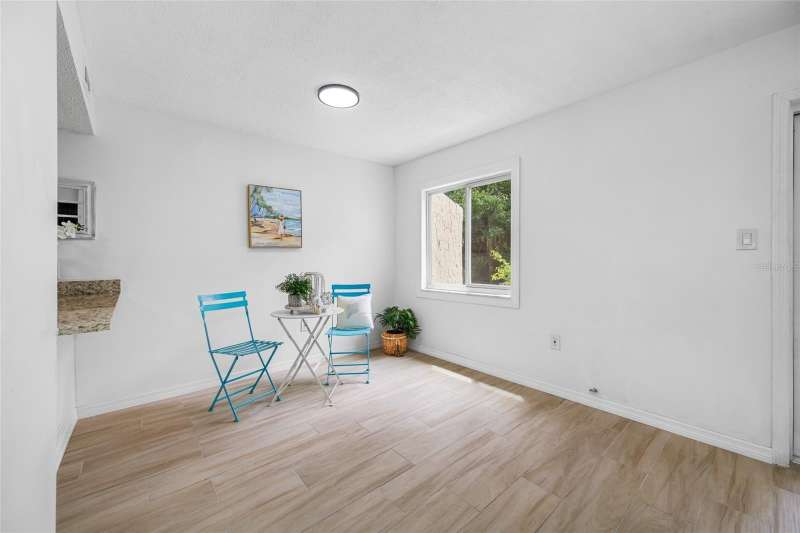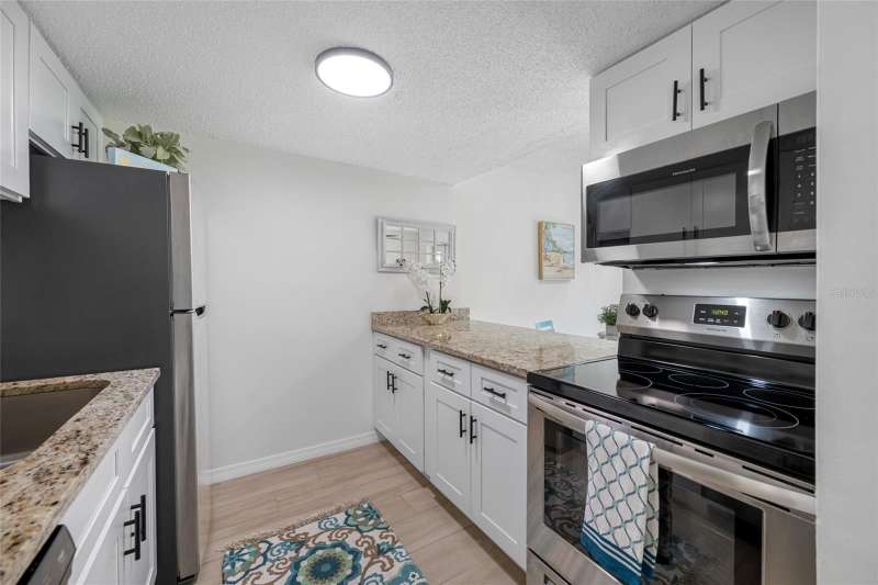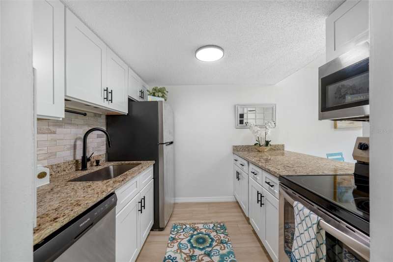 Step into this beautifully updated ground-floor condo, fully renovated and move-in ready. The kitchen shines with new cabinets, granite countertops and stainless-steel appliances. The bathroom features modern finishes including a walk-in shower. Large walk-in storage closet located across from the bathroom. Stylish plank tile flooring runs throughout, complemented by new windows (2023) and a back porch ideal for soaking up the Florida sunshine. Located in the back of the sought-after Woodside Village community, residents enjoy lots of amenities: three heated pools, a clubhouse, car-wash station, BBQ area, lake access, and three convenient laundry facilities. Just minutes from the beach, ten minutes to Clearwater/St. Pete Airport, and close to popular shopping and dining spots. All-ages welcome. Rentals permitted after one year of ownership (30-day minimum). Please note: pets are not allowed. May qualify for up to $10,000 towards down payment assistance, please ask for details.