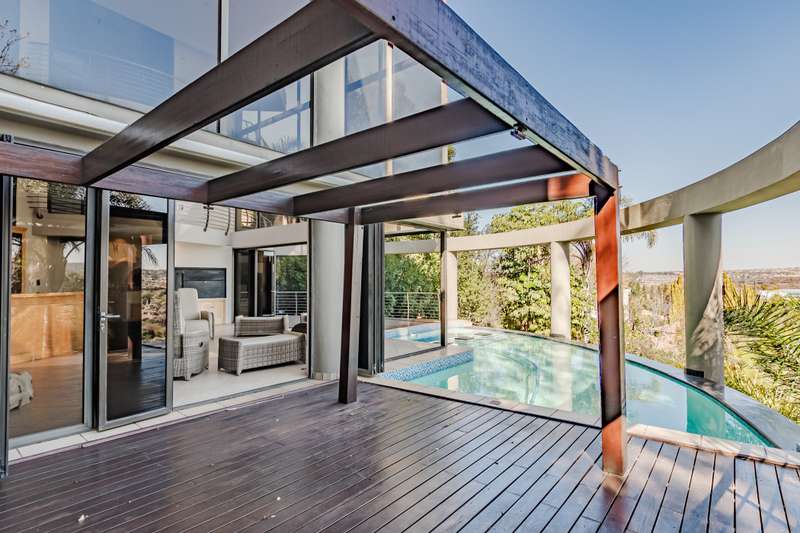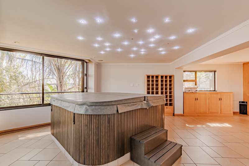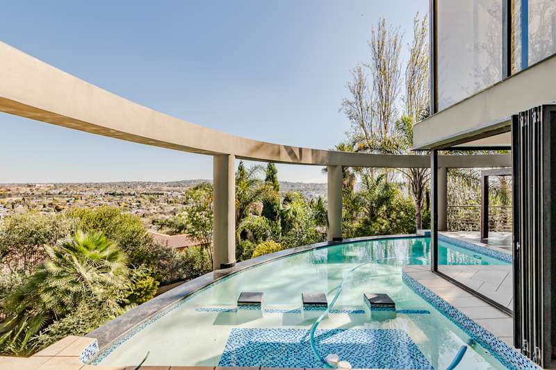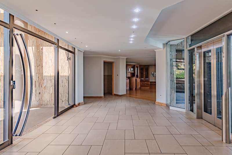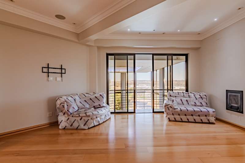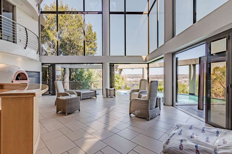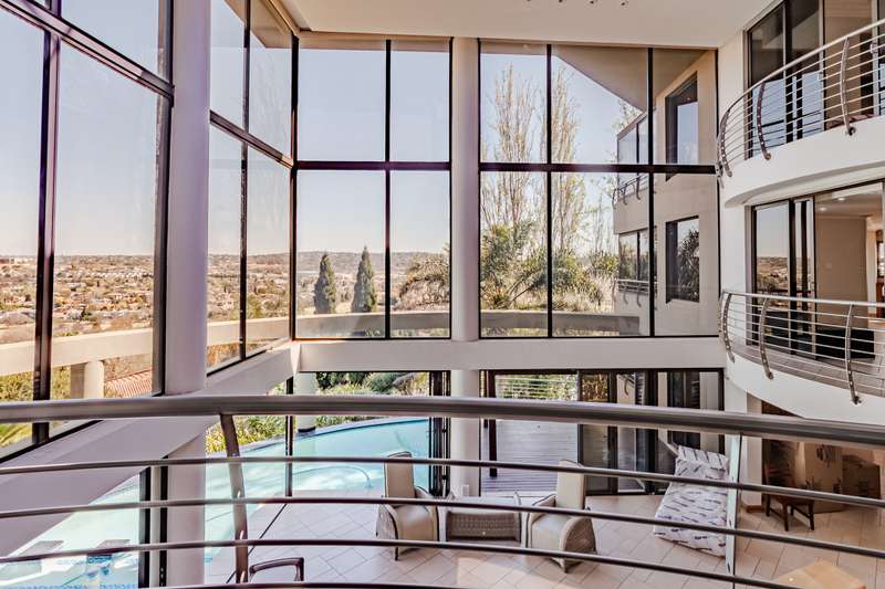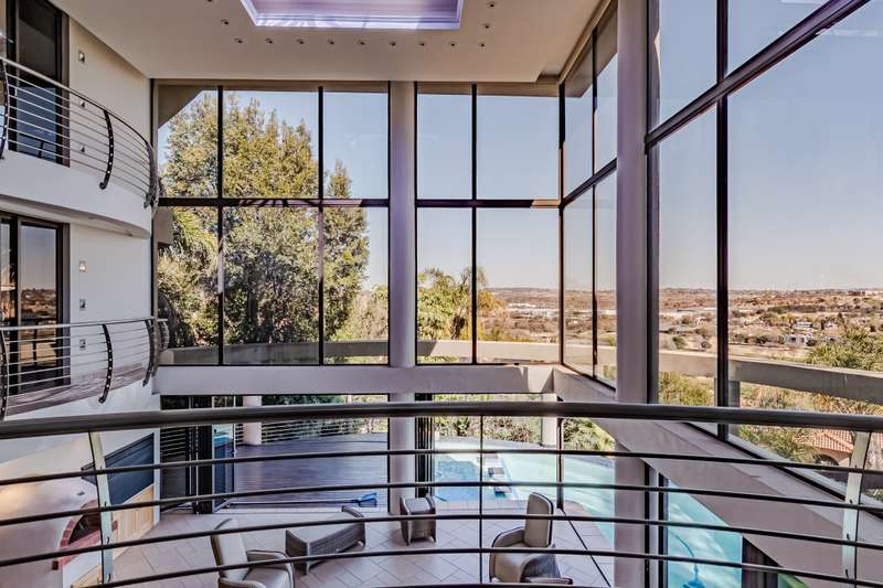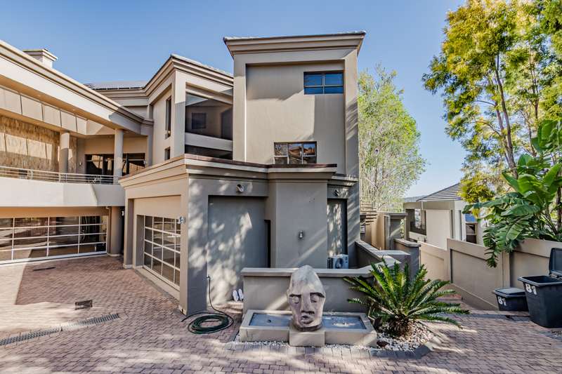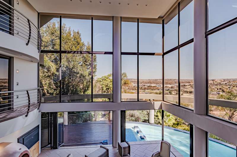 AN EAGLE’S NEST VIEW! LUXURY LIVING FOR A BIG FAMILY This extraordinary luxurious and sophisticated home tick all the boxes! The sophisticated home has panoramic views of the Woodhill golf course and surrounds. This multi-level house has a private wine cellar with an elevator taking you up to all four levels. Level 2 has a front door and direct access from the 3 automated lock up garages (parks 6 cars), gourmet kitchen equipped with Miele appliances and with a separate scullery, Jacuzzi room, triple volume entertainment area with a build in bar, pizza oven, build in braai, stack doors that opens to the sparkling pool with a wooden deck with an eagle’s nest view. On this level is also a guest toilet, large bedroom with en suite bathroom. Level 3 also has a front door, large dining room with a build in fire place, gourmet main kitchen with ample cupboards and fully equipped with Miele appliances, build in coffee machine, microwave, double oven, ice maker, big stove with gas hob plus a separate scullery, on this level is also a large braai room with a build in braai, TV lounge, guest toilet and a large study with build in cupboards. Another bedroom with en suite bathroom. Level 4 has 4 bedrooms. Immaculate main bedroom with a private lounge with a fireplace, kitchenette, walk in cupboards and hotel standard en suite bathroom plus a walk in safe. Bedrooms 2 and 3 share a Jack and Jill full bathroom. Bedroom 4 has an en suite bathroom. Large linen cupboard. This house also offers: 3 staff rooms, 2 of the rooms has en suite bathrooms, plus a separate bathroom. EXTRAS: Surround sound in all the bedrooms and living rooms, air-conditioning units, comprehensive surveillance camera system and to ensure uninterrupted energy and power independence in the house it is fully off the grid supported by a solar power systems, central vacuum system, elevator to enjoy comport and easy living. VIEW NOW!