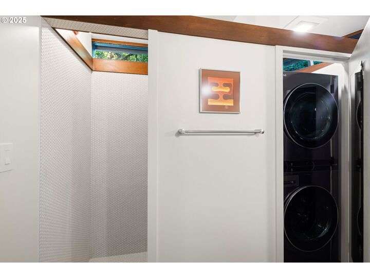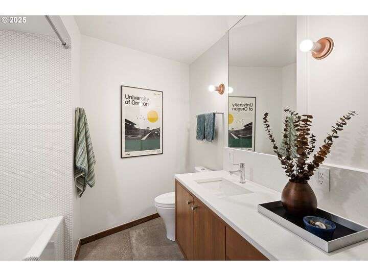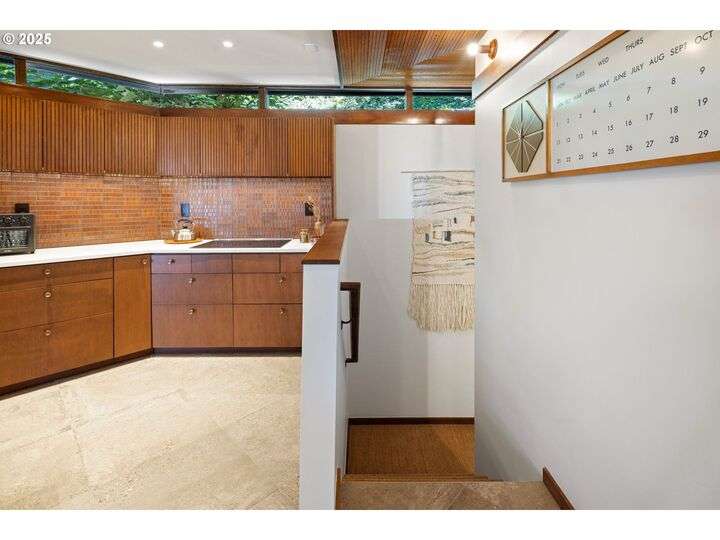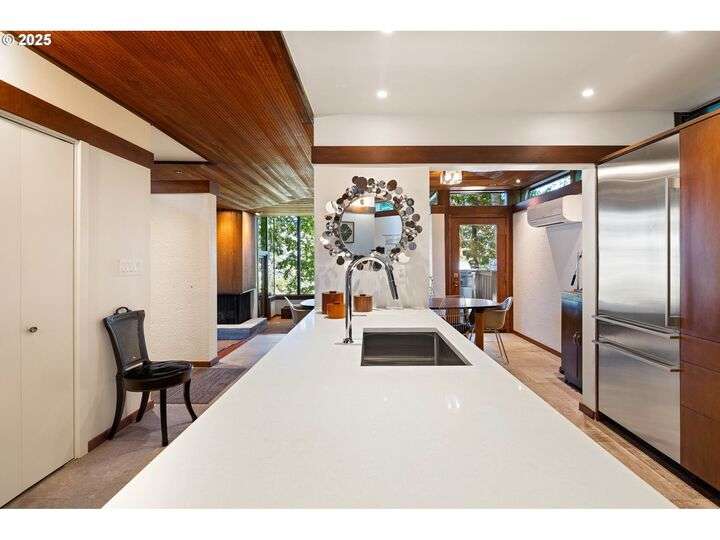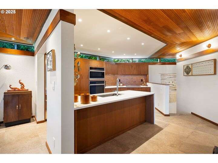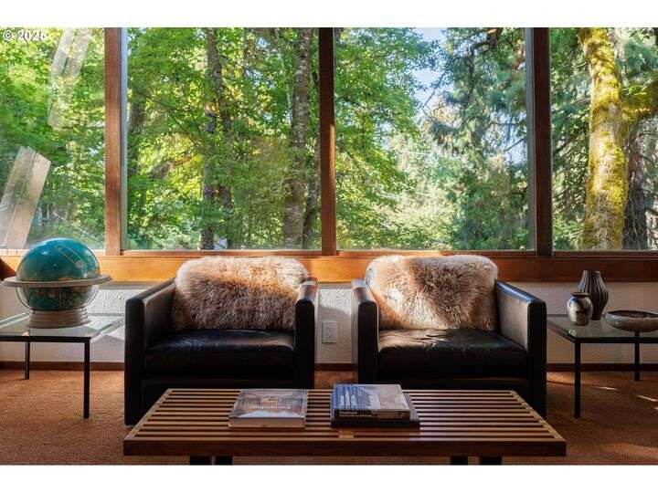 This iconic mid-century home is nestled amongst the trees near the University of Oregon, Hendricks Park and the Ridgeline Trail. The house was designed in 1965 by renowned Eugene architect Otto Poticha, and has been carefully renovated & reimagined to 21st century standards by exacting and creative owners. All the original integrity is intact, including solid cedar ceilings, and floor to ceiling picture windows w/ filtered views of downtown and coast range sunsets. Dramatic treehouse pavilions creatively showcase unique angles and sight lines. This stunning transformation provides a rare opportunity for architecture enthusiasts to buy an uncommon property that has been respectfully and thoroughly updated. Upon entering the home past a large entertaining deck, the main level includes a primary bedroom suite with laundry, kitchen, dining, sunken living room, porch and deck. The lower level has another bedroom/bathroom suite and storage areas. Every feature has been renovated for convenience and livability: new membrane roof, electrical panels, HVAC, water heater, decking, landscaping walls, kitchen, baths, flooring, doors, fixtures, hardware and finishes. This spectacular home awaits its next owners to fall in love with its warmth and magic. (No real estate sign at property.)