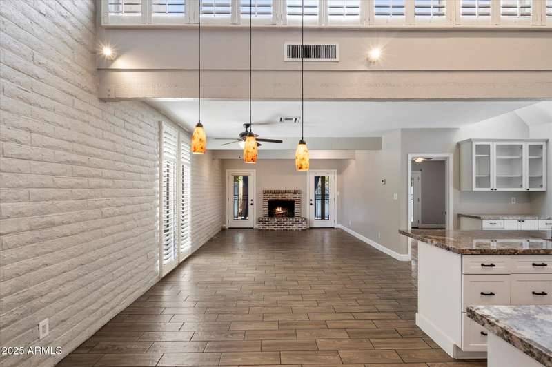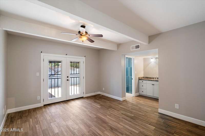 Unwind in the inviting living room with its cozy wood-burning fireplace and dual French doors that open to a private patio oasis. The patio is ideal for relaxing or entertaining, with custom drapes creating a tranquil shaded retreat.
