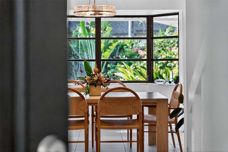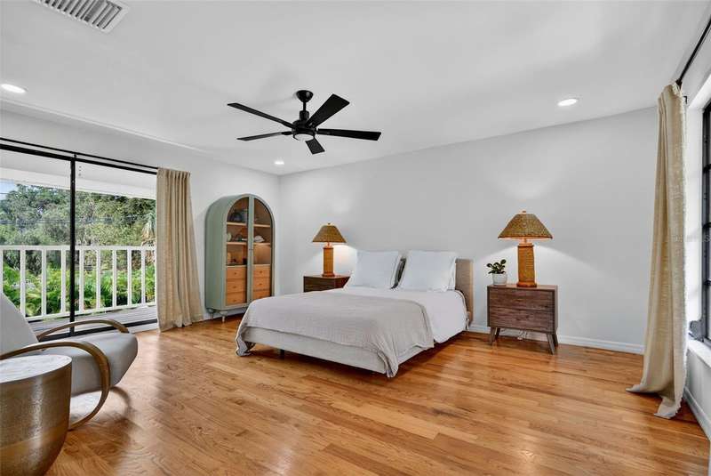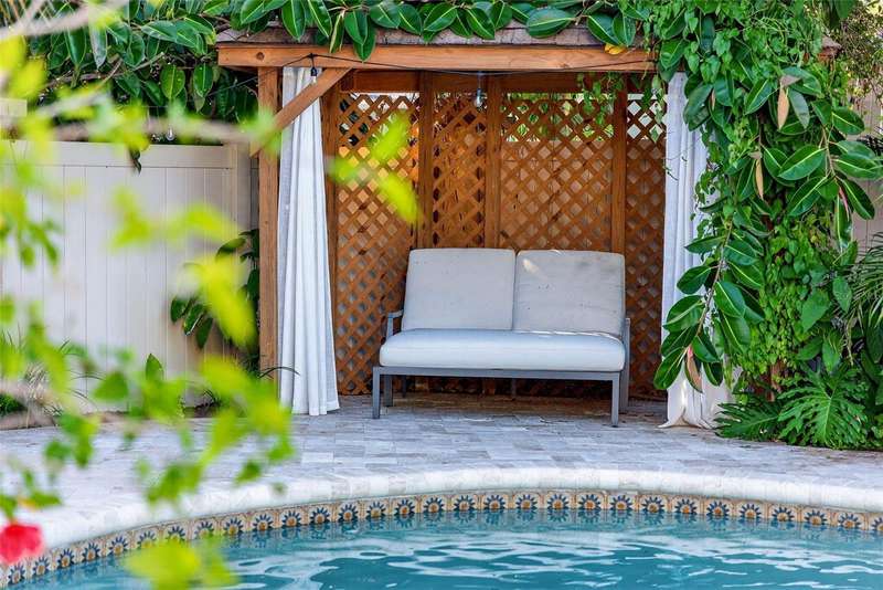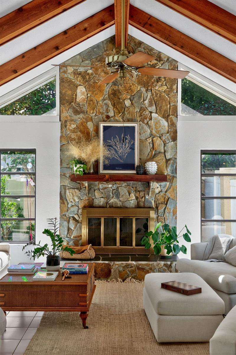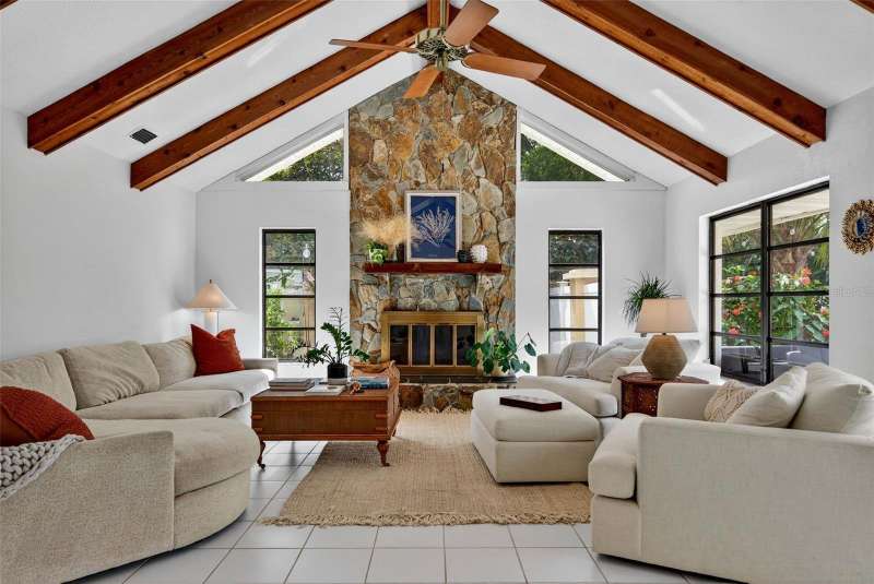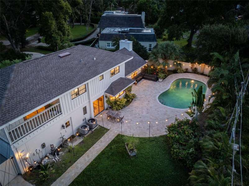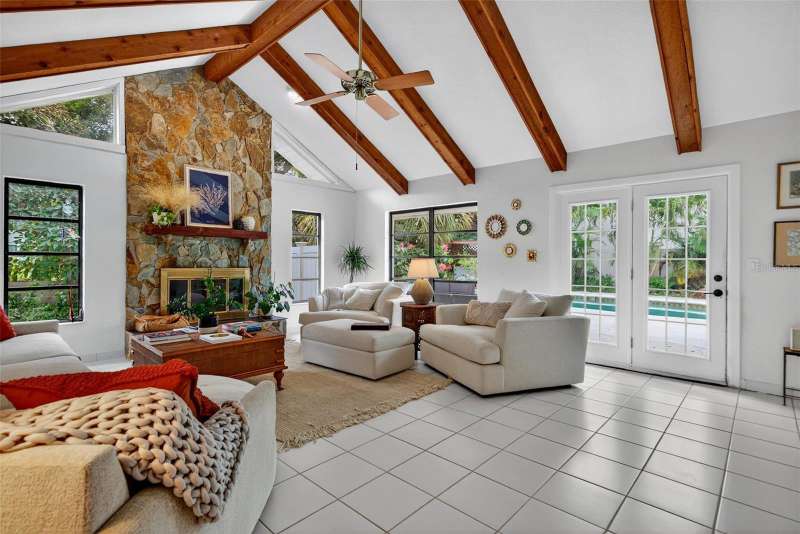 On Serpentine Drive in the Pink Streets, distinct architectural homes sit under mature pines and a lush tree canopy. Down a private drive, this property offers rare privacy just blocks from the waterfront parks. Elevated high enough to avoid flood insurance at this time, with no history of flooding. The double lot spans over a quarter acre with a pool and is within walking distance to parks and the water. Honeybees may be included for the aspiring beekeeper, making this retreat a unique opportunity for a nature lover. Inside, you feel one with nature with the exposed wood beams in the vaulted living room, perfectly framed around a fireplace where natural light pours in throughout the day. The thoughtful layout includes four bedrooms each with it's own walk-in closet, two and a half baths, a downstairs primary suite, and a two-car garage. Outdoors, travertine pavers add to the natural element around the salt-water pool, a tropical oasis, where flora and fauna thrive. The fenced yard offers space where native sunshine mimosa blooms with plenty of room for gardening and entertaining. You'll find plenty of Florida native landscaping for easy maintenance. Recent updates provide peace of mind, including a new roof (2020), updated electrical systems (2023), and HVAC system (2025) with warranty. Within walking distance to two neighborhood parks, moments from a public boat ramp and access to downtown and the beaches. Opportunities to call the Pink Streets home are few and far between. A true gem for it's location, privacy, elevation and tranquility!