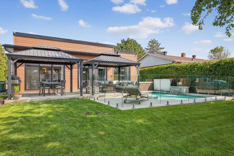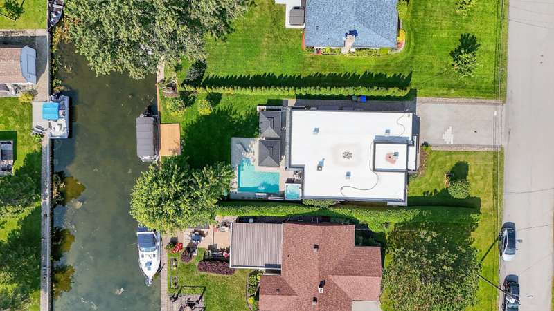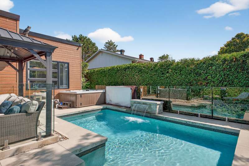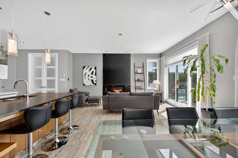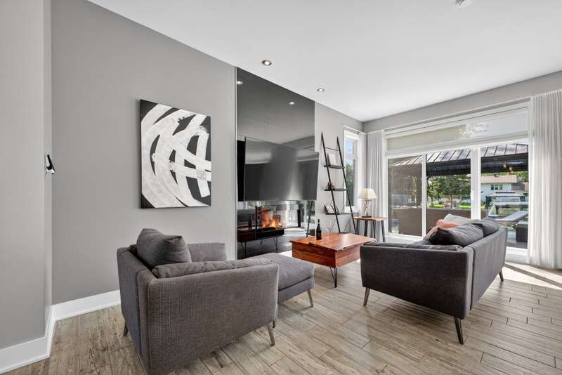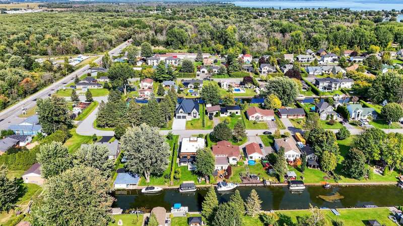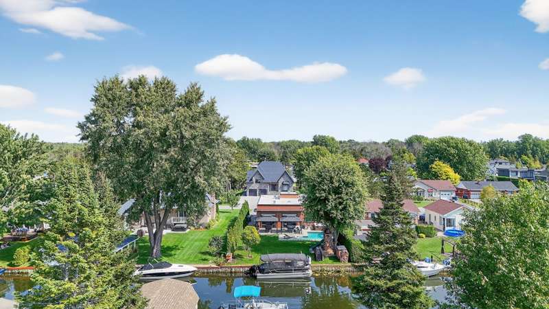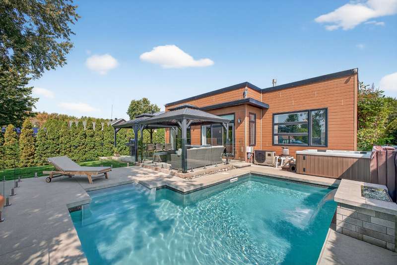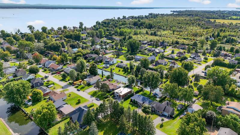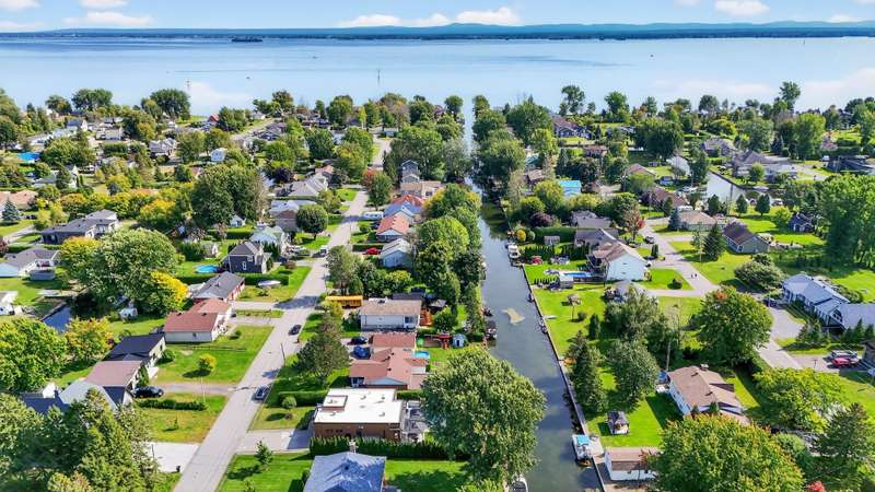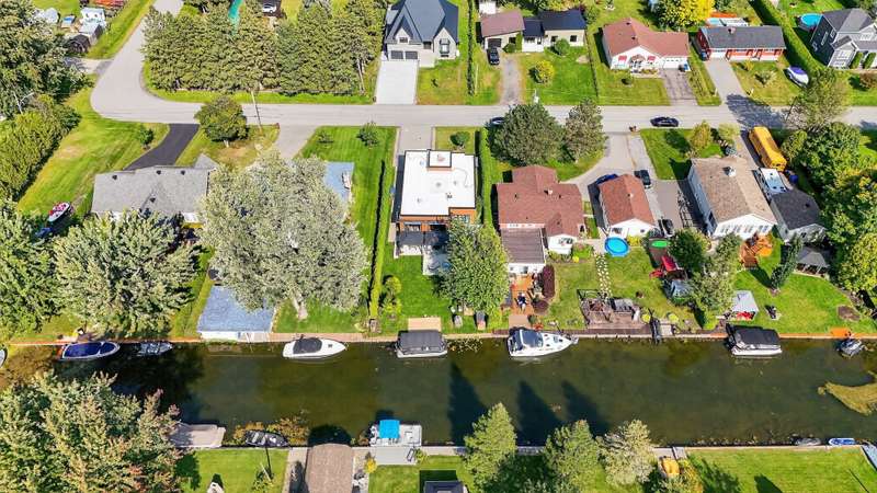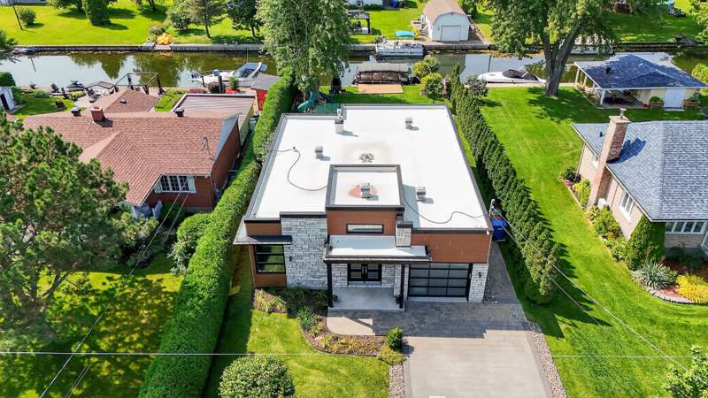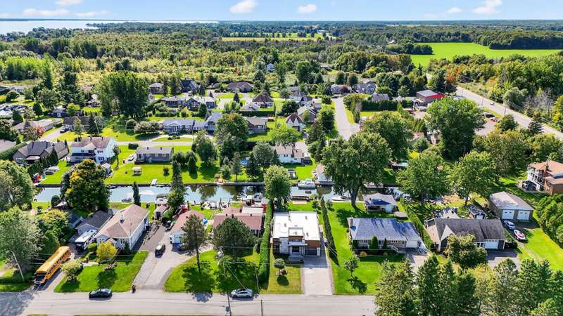 Striking contemporary waterfront residence with canal access to the crystalline waters of Lac Saint-Francois. Built in 2014, this home features high-end fixtures and finishes, 10-foot ceilings, heated floors, and a propane fireplace. The chef's kitchen boasts granite and quartz countertops with custom lacquered cabinetry. Additional highlights include a tiled garage, unistone driveway, and a glass-fenced salt-system inground pool, outdoor spa, spacious patio, waterfront deck, and four sheds for storage. Possibility of dividing the family bathroom to create a second bathroom, offering the option for an ensuite to the primary bedroom.