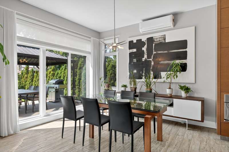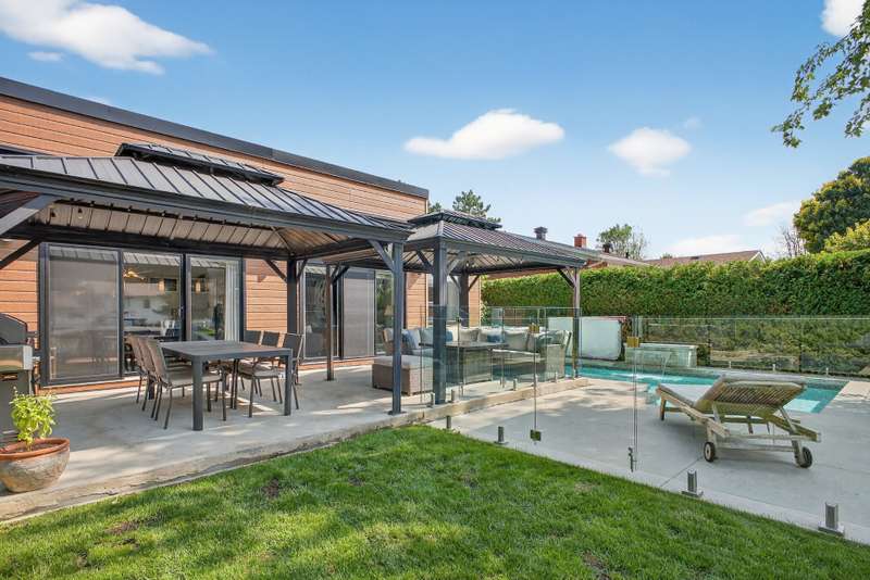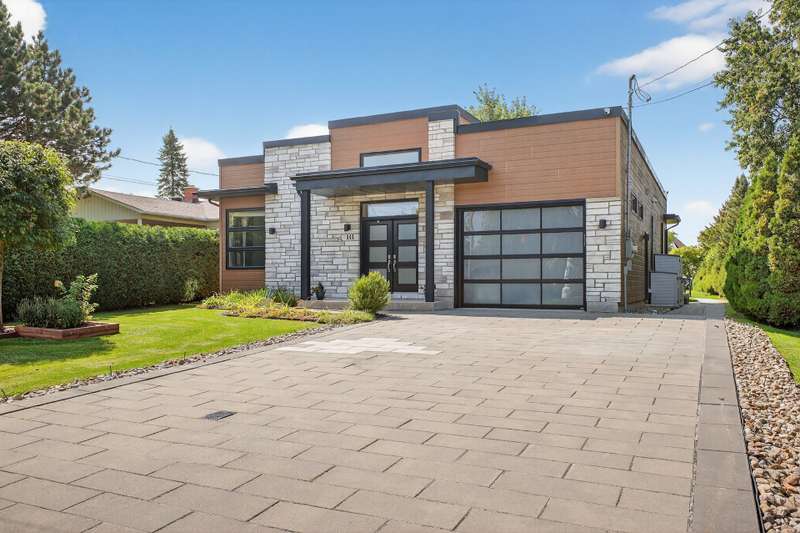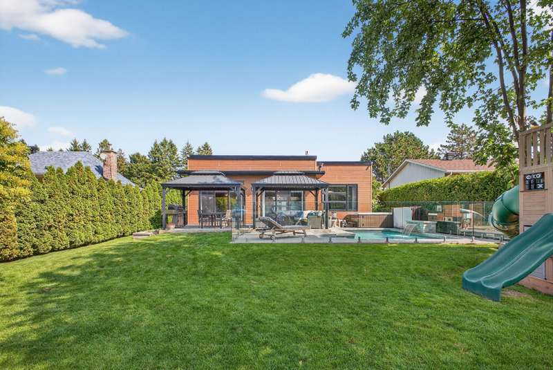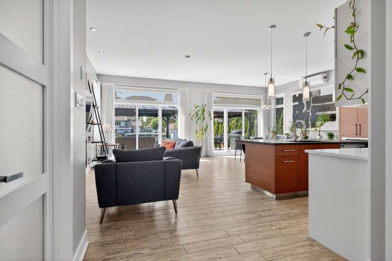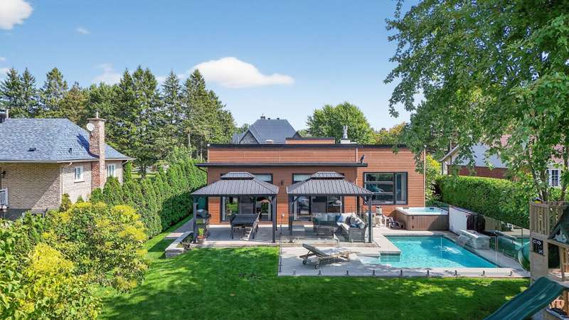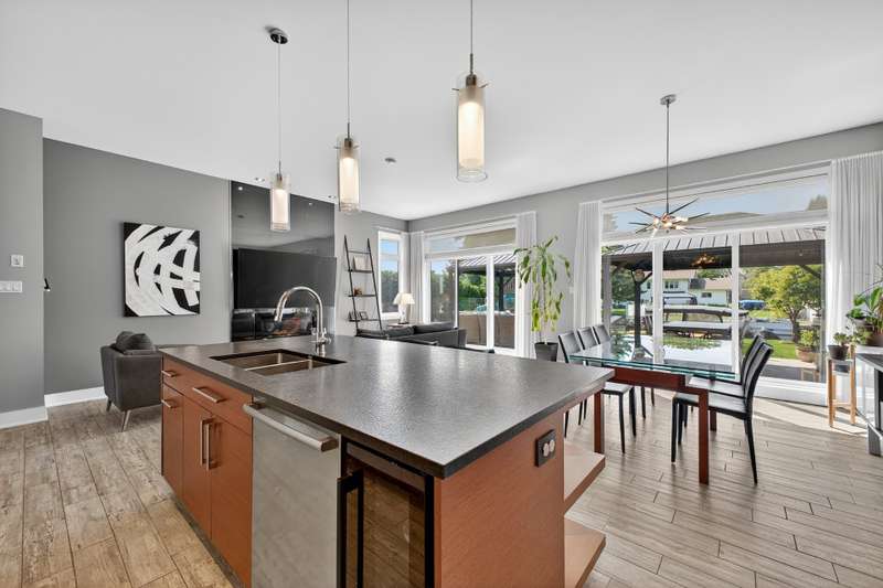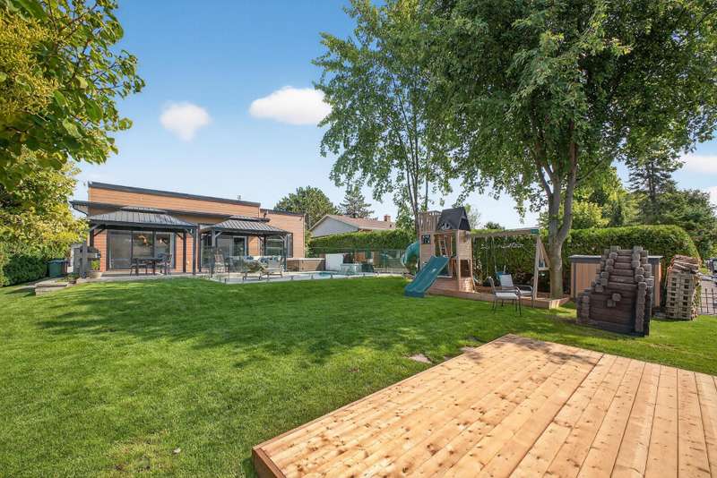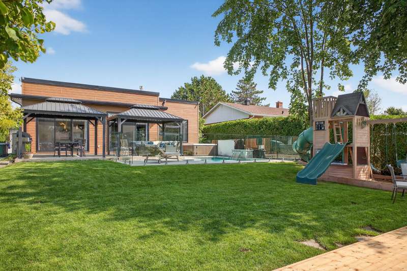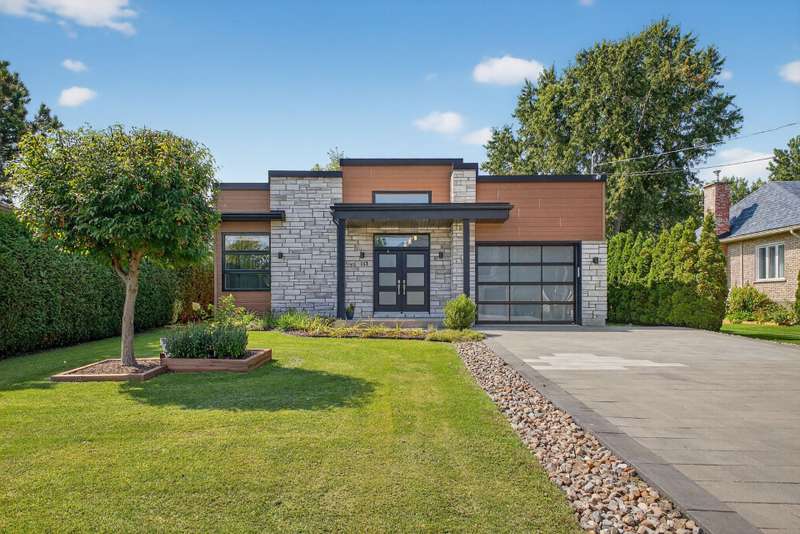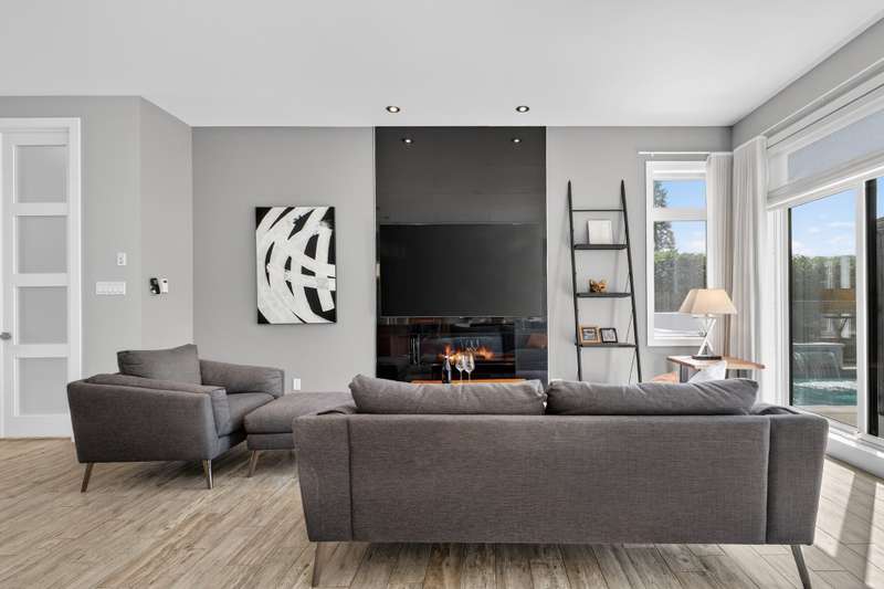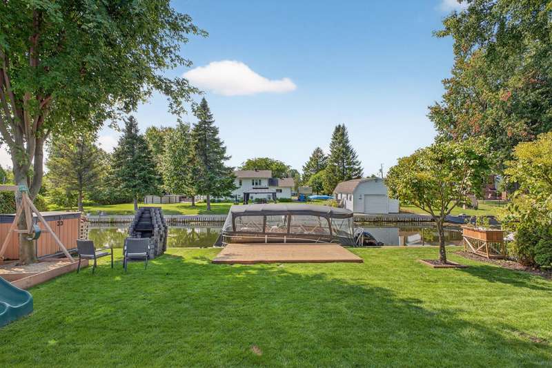 Striking contemporary waterfront residence with canal access to the crystalline waters of Lac Saint-Francois. Built in 2014, this home features high-end fixtures and finishes, 10-foot ceilings, heated floors, and a propane fireplace. The chef's kitchen boasts granite and quartz countertops with custom lacquered cabinetry. Additional highlights include a tiled garage, unistone driveway, and a glass-fenced salt-system inground pool, outdoor spa, spacious patio, waterfront deck, and four sheds for storage. Possibility of dividing the family bathroom to create a second bathroom, offering the option for an ensuite to the primary bedroom.