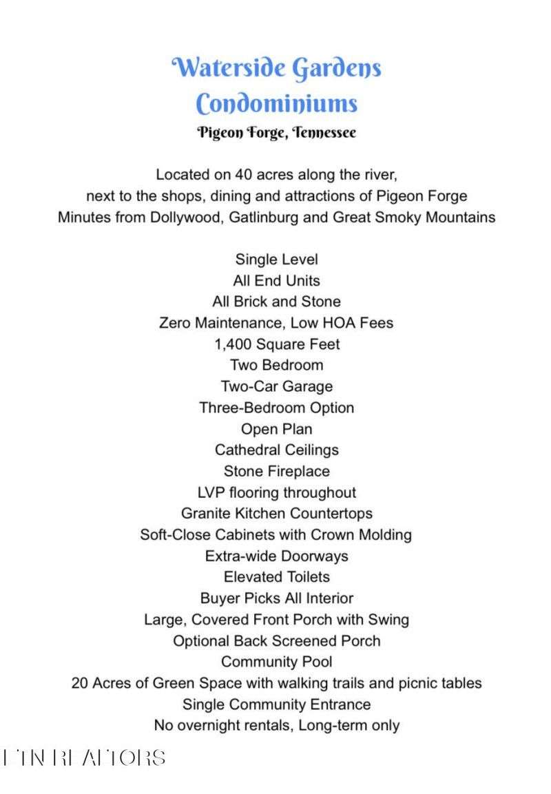 Welcome to Waterside Gardens Condominiums! It is time to begin customizing your brand-new, zero-maintenance home! Phase 4 construction is starting for these beautiful two- and three-bedroom condos located in the heart of Pigeon Forge on 47 serene acres along the Little Pigeon River, and minutes from the wonders Dollywood, Gatlinburg and the Smoky Mountains. This perimeter unit will maximize privacy, allowing you to enjoy easy living from your secluded back patio or covered front porch, while the HOA takes care of exteriors, lawns and landscaping. Featuring your choice of granite kitchen tops, soft-close cabinets, LVP flooring, living room and bedroom ceiling fans, stainless appliances, cathedral ceilings, elevated toilets and wide 36'' doors, this roomy two-bedroom condo sits in a peaceful community that allows no overnight rentals. Waterside Gardens will have a community pool by summer 2026, and 20 acres of green space with a walking trail and picnic tables for residents and their pets to enjoy. Waterside Gardens is being developed and constructed by the same team that built Riverbend Gardens and Creekside Gardens in Sevierville.