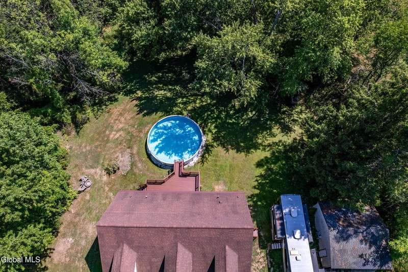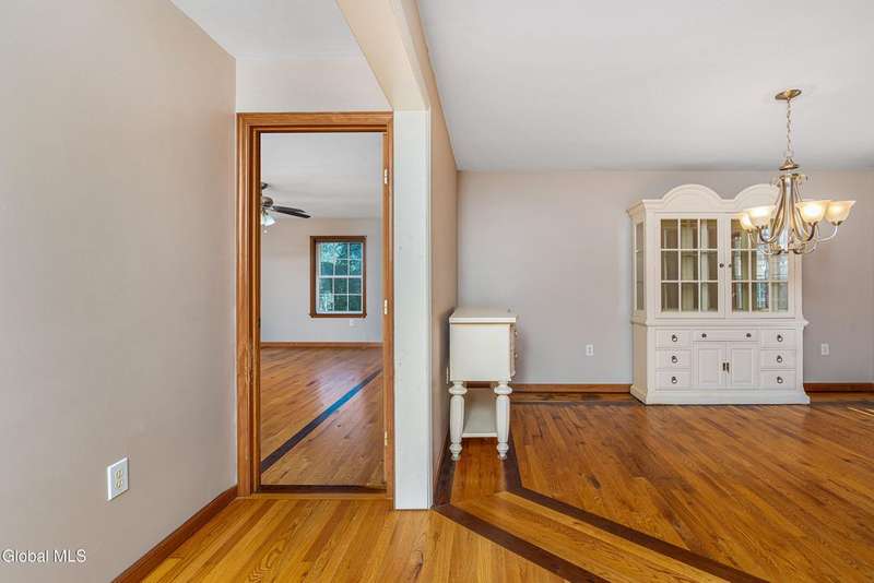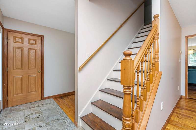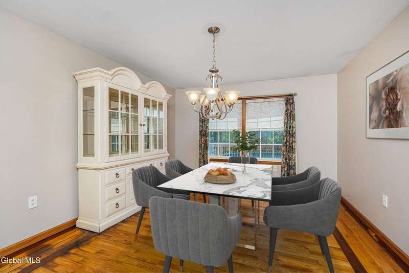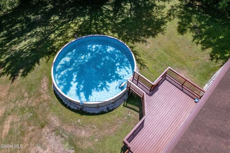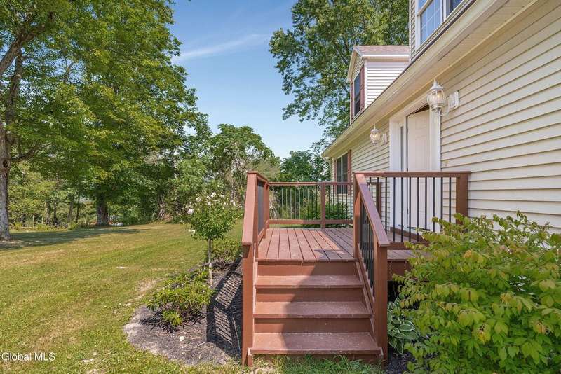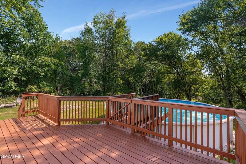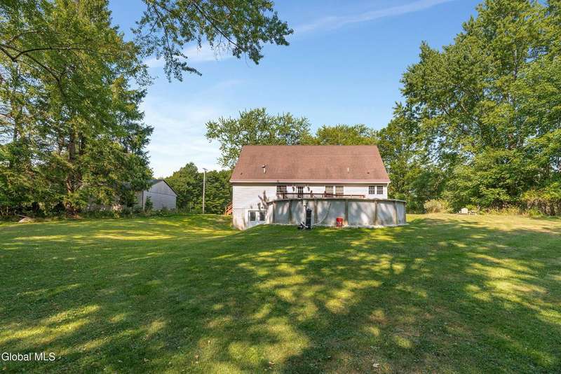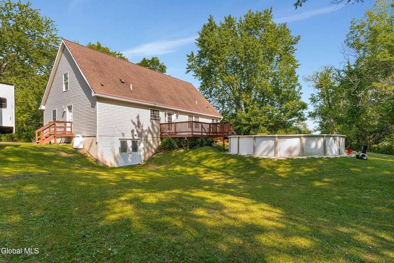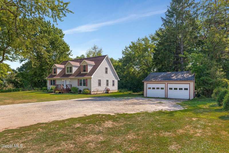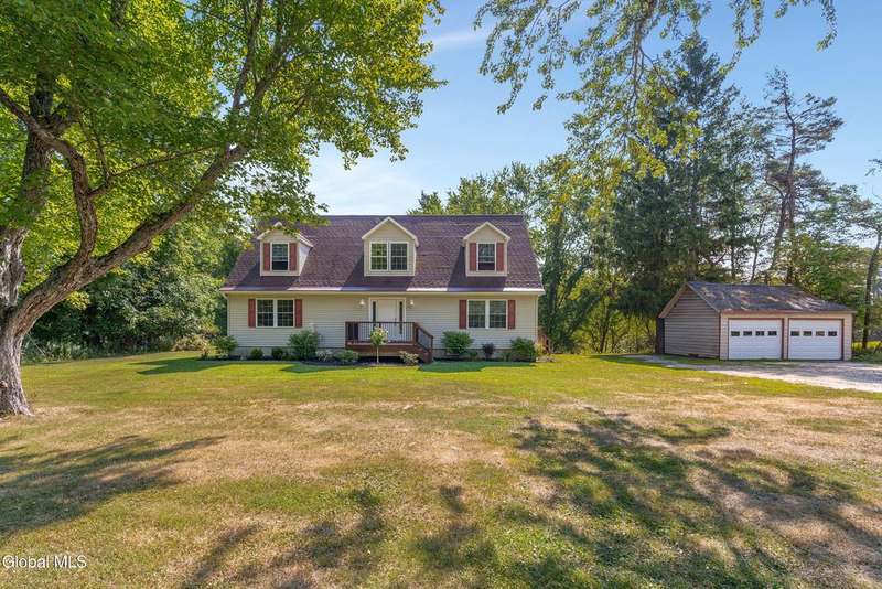 Nestled in the Averill Park School District - this 4-bedroom, 3 full bath Cape Cod offers over 2,300 sq ft of living space on 1.5 private acres. The first floor features hardwood floors, a bright living room, a formal dining room with inlaid wood detail, and a spacious kitchen with stainless steel appliances and deck access. The first-level primary suite includes a soaking tub, separate shower, and ample closet space. Upstairs are generous bedrooms and a full bath. The walkout basement offers excellent potential for finishing into additional living space. Outside, enjoy the above-ground pool, detached 2-car garage, and an expansive yard surrounded by mature trees. This property offers privacy, versatility, and room to grow.
