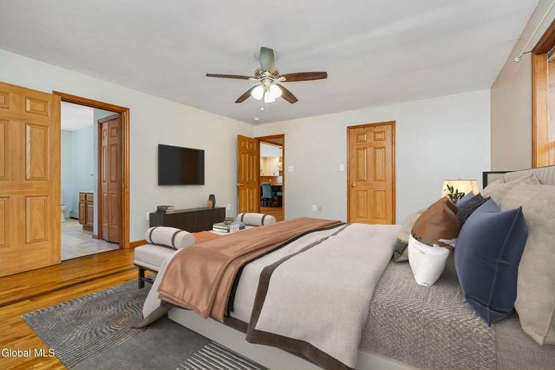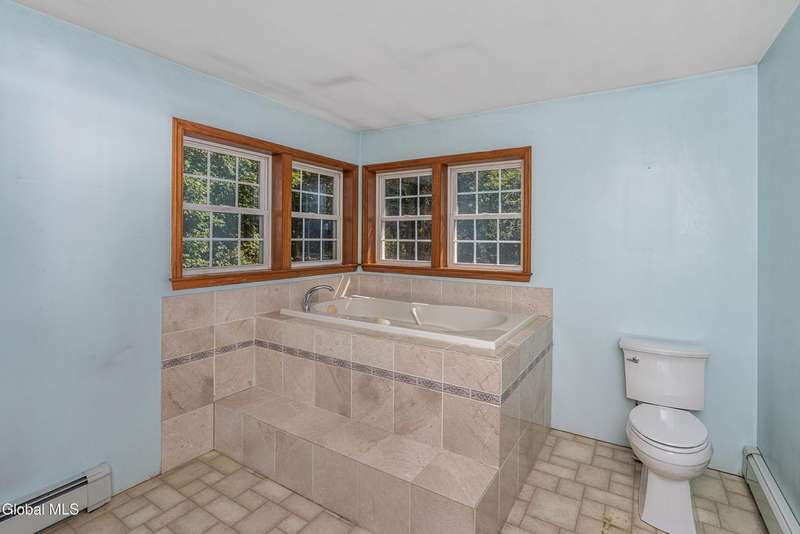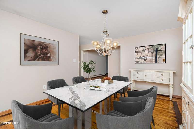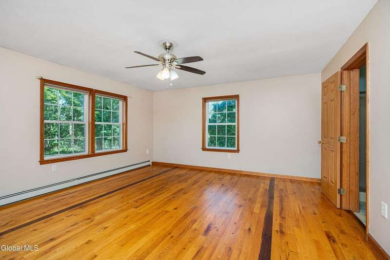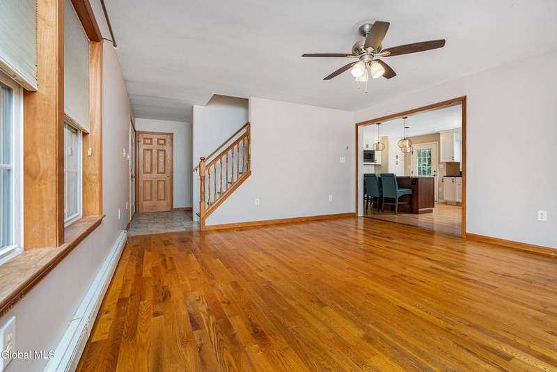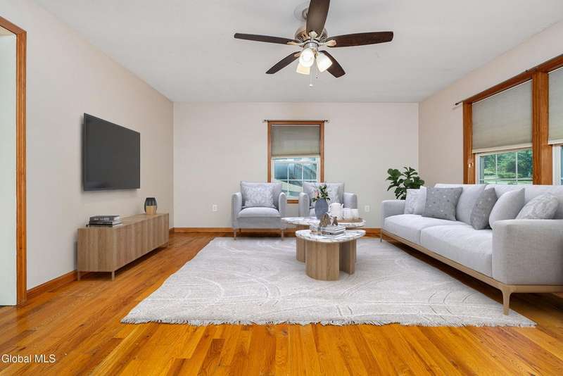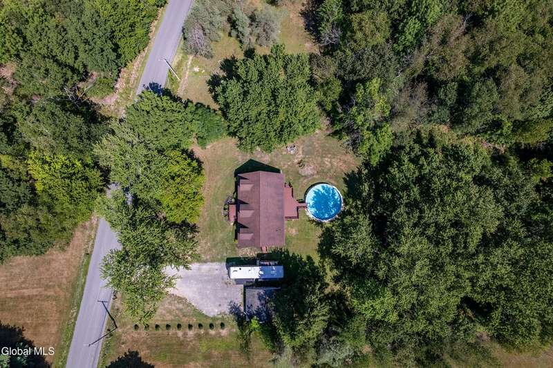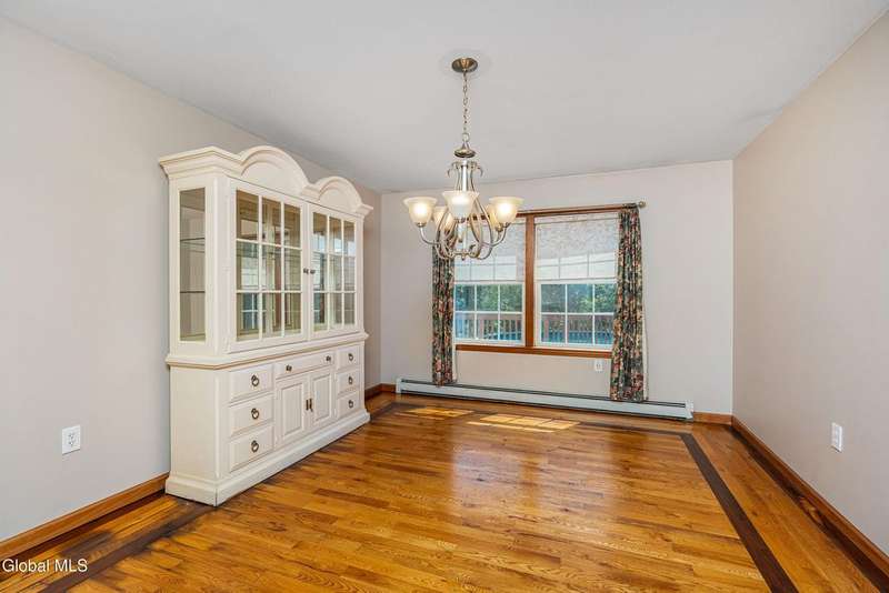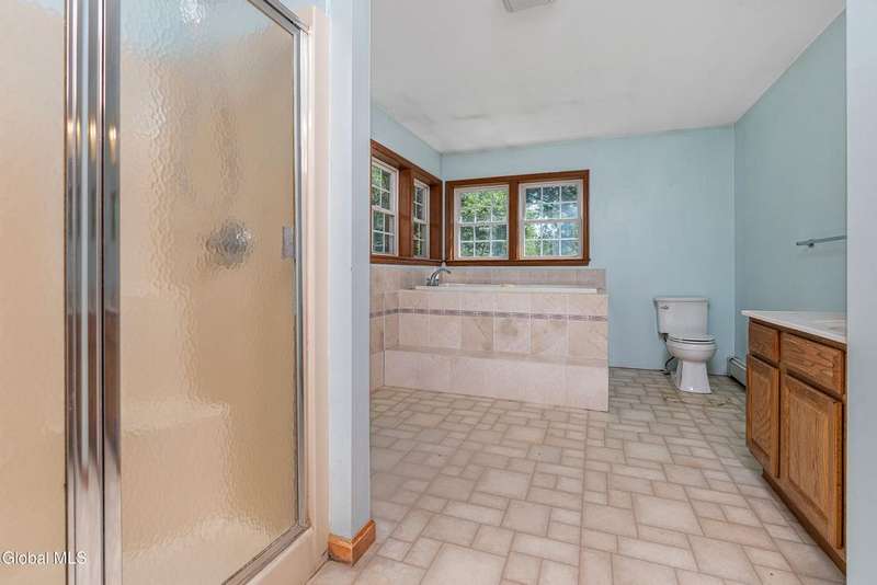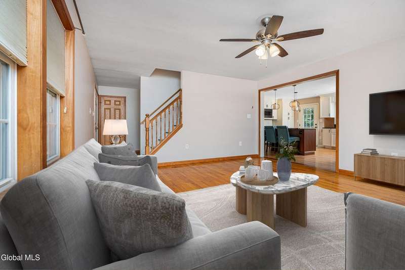 Nestled in the Averill Park School District - this 4-bedroom, 3 full bath Cape Cod offers over 2,300 sq ft of living space on 1.5 private acres. The first floor features hardwood floors, a bright living room, a formal dining room with inlaid wood detail, and a spacious kitchen with stainless steel appliances and deck access. The first-level primary suite includes a soaking tub, separate shower, and ample closet space. Upstairs are generous bedrooms and a full bath. The walkout basement offers excellent potential for finishing into additional living space. Outside, enjoy the above-ground pool, detached 2-car garage, and an expansive yard surrounded by mature trees. This property offers privacy, versatility, and room to grow.