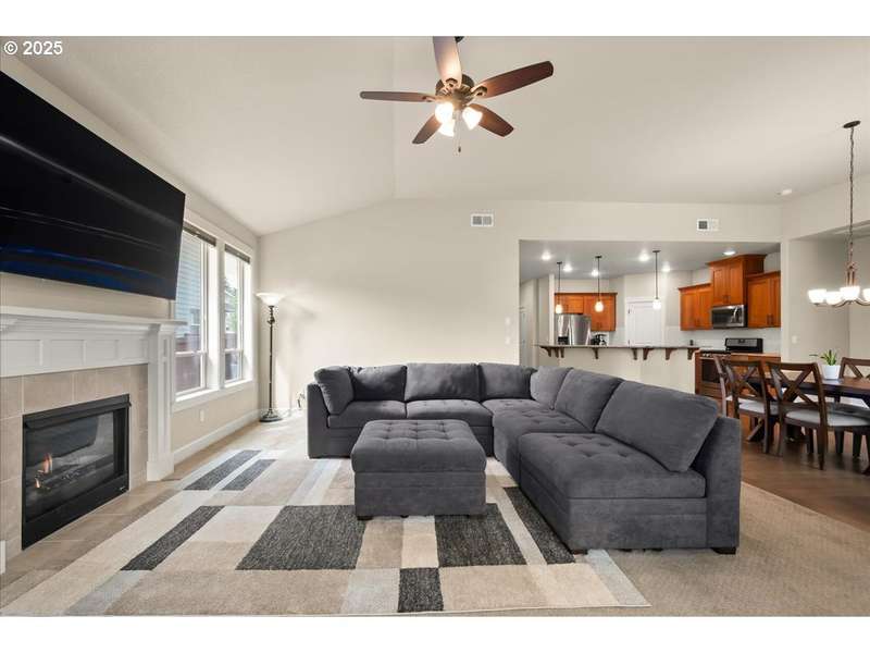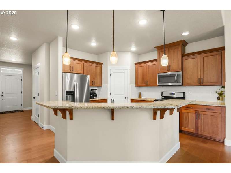 Lovingly maintained by its owners. A one-year home warranty provided to buyers for added peace of mind. This pristine one-level home built in 2016 offers a like-new interior! The bright, open floor plan features soaring ceilings, lots of natural light, and a beautiful kitchen with DeWils cabinetry, soft-close drawers, stainless steel appliances, a gas range, walk-in pantry, and granite countertops. Perfect for daily living and entertaining.The spacious primary suite also has vaulted ceilings, a large walk-in closet, dual vanities, private water closet, soaking tub, and walk-in shower. Enjoy easy outdoor living with low-maintenance landscaping, a dual-zone sprinkler system, and a stamped concrete patio ideal for gatherings. Additional highlights include 220V backyard electrical for a future hot tub and a 50-amp, 220V garage outlet—perfect for EV charging or shop tools. This home has been meticulously cared for and it shows—schedule your private tour today!