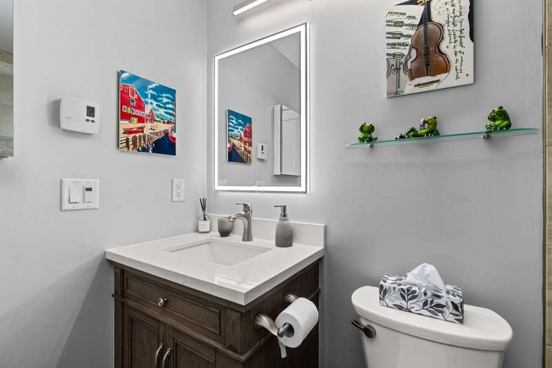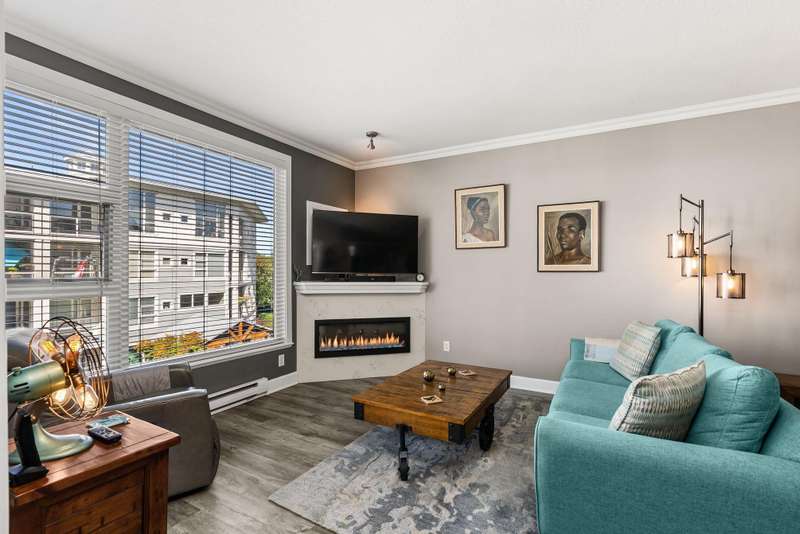 Stunning Coppery Sky Apartment! This gorgeous & spotless 2 bed, 2 bath, den & separate laundry/pantry room has 1,088 sq ft unit w/ updates throughout BONUS 3 PARKING STALLS! Both bathrooms updated: new floors (heated in ensuite w/ heated mirror & towel rack), tub & shower tile, vanities & fixtures. Step into an open kitchen w/ quartz waterfall counter & matching backsplash, S/S appliances incl French door fridge & gas stove & under cabinet lighting and enjoy engineered flooring throughout w/ carpet in the bedrooms. Updated light fixtures throughout, wide open dining/living space with custom fireplace & quartz surround awaits with an expansive covered balcony with views to the river. Steps to the boardwalk & sunsets, minutes to Steveston Village, & dyke trails beyond. Open Sat, 2 to 4p.