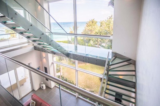 The residence's second floor is home to four en-suite bedrooms, including a master suite that is a sanctuary of relaxation with vaulted ceilings and expansive windows framing the ocean views. A sprawling balcony with glass railings runs the entire length of the ocean-facing side, offering an uninterrupted vista.