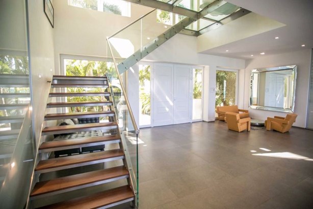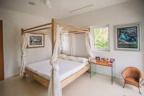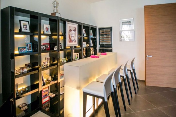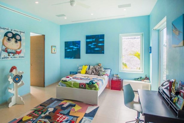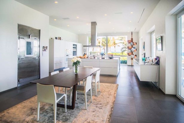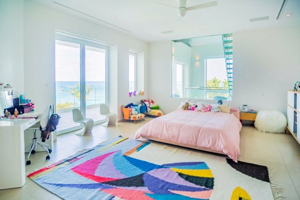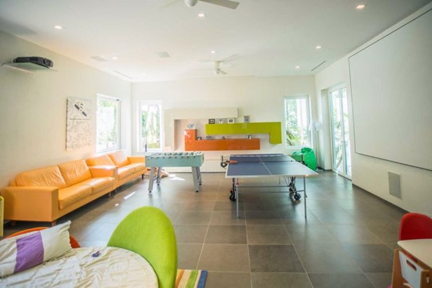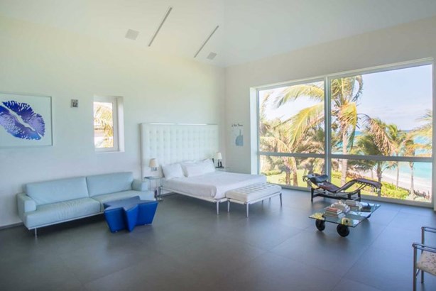 Upon entering the main level, residents and guests are welcomed into a grand Great Room, seamlessly extending onto a pool terrace with panoramic views of the beach and azure ocean beyond. This level also includes a cozy family room with an adjacent bar, a children's play area complete with a large home theatre, and a cutting-edge European kitchen. This culinary haven is equipped with stainless steel countertops, premium appliances, and a striking floor-to-ceiling window.