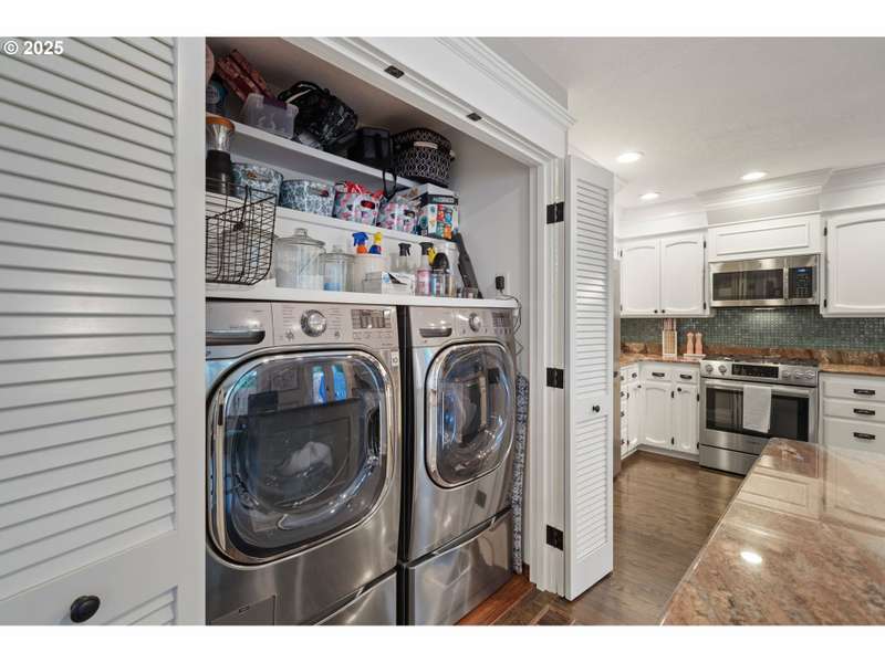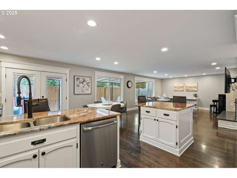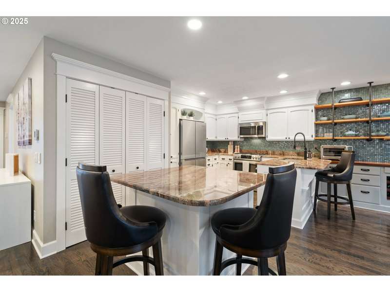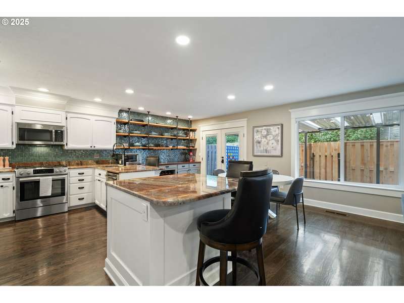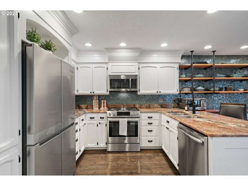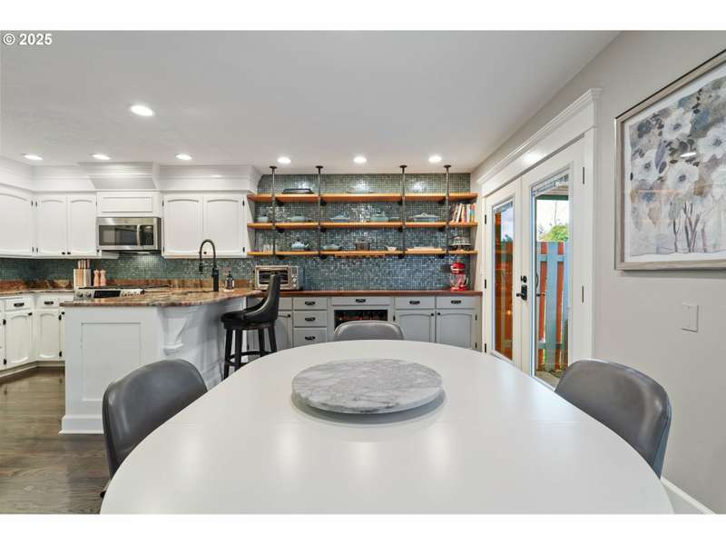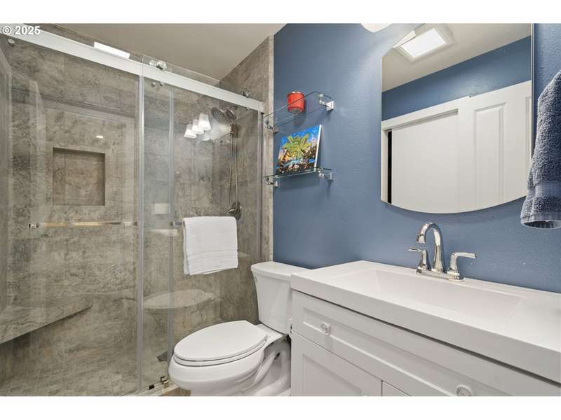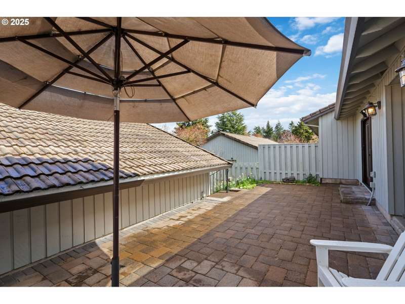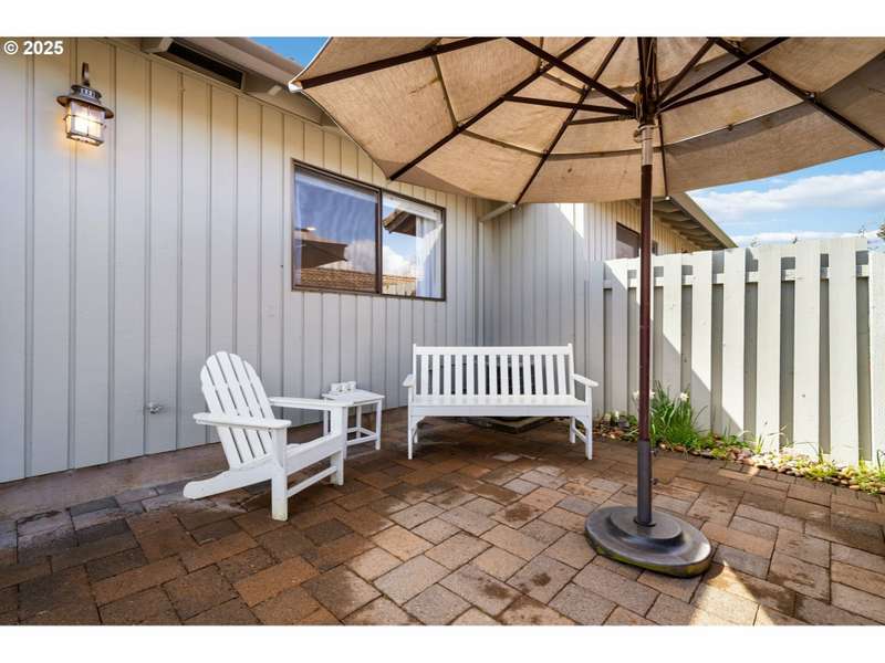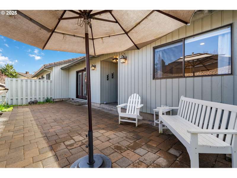 Beautifully updated SINGLE LEVEL condo in the heart of West Linn. Past the HUGE detached, 2-car garage, you will find an over 600sqft paver courtyard that is fully fenced to keep your furry companion safe. The one level condo greets you with refinished oak floors throughout. Primary Suite to the left offers a walk-in closet & walk-in shower as well as French doors out to the private courtyard. Fresh paint, custom barn doors, new vanity, recessed medicine cabinet & new fixtures. Across the hall is another nicely sized bedroom w/new paint & remodeled hall bath with new toilet, vanity medicine cabinet, exhaust vent, shower door & fixtures w/a pocket door to the condo mechanicals & extra storage. The main great room is bordered on the far side with large newer windows w/custom window treatments. The space is flooded with light through the windows as well as extensive, custom ceiling lighting. Remodeled kitchen w/beautiful granite slabs & open shelving over a built-in buffet. Stainless steel appliances w/gas cooktop & new refrigerator. Side by side washer/dryer hidden in the bi-fold closet with perfect folding island adjacent. Another set of French doors lead to the large, covered, paver backyard with new privacy fencing & room to play & entertain. The gate to the rear leads to stairs and the community pool! New retractable slider screens on the exterior doors & refurbished crawlspace with all new insulation! This one is the total package!