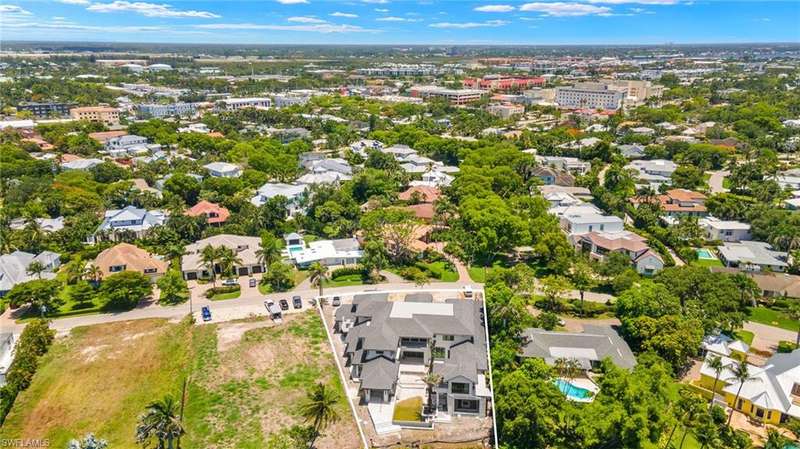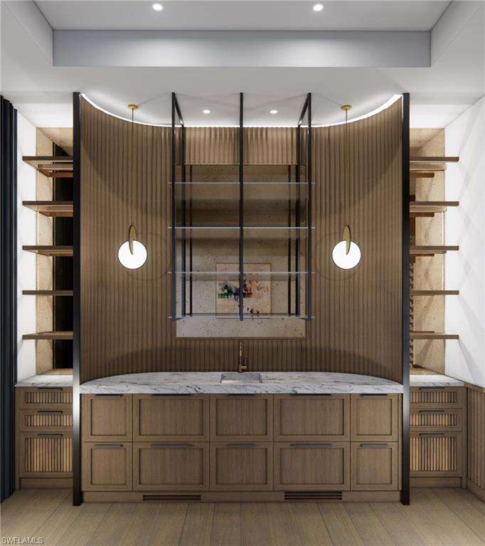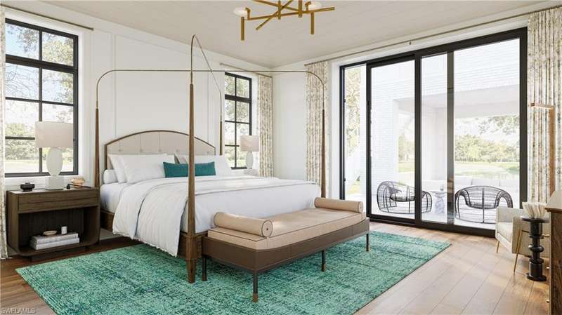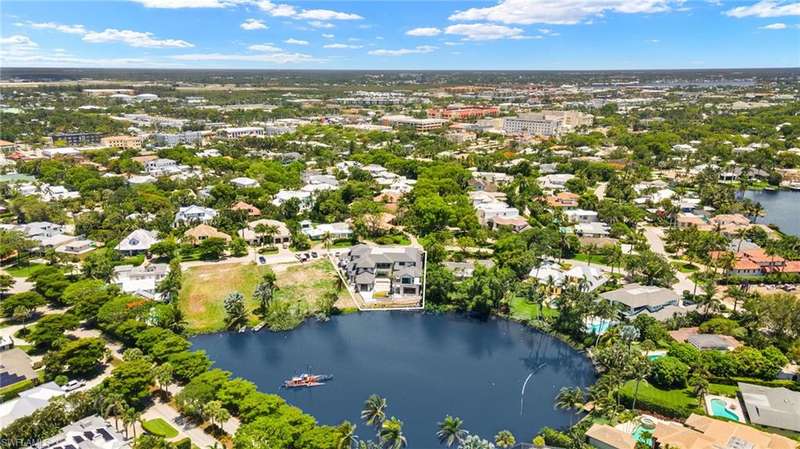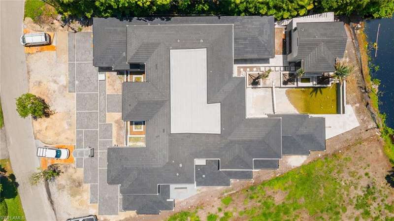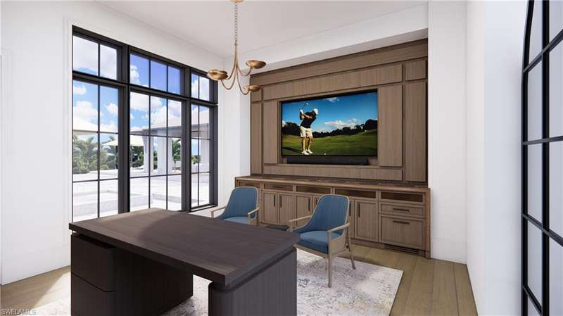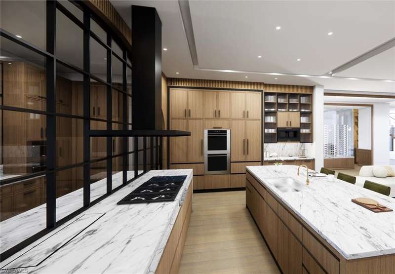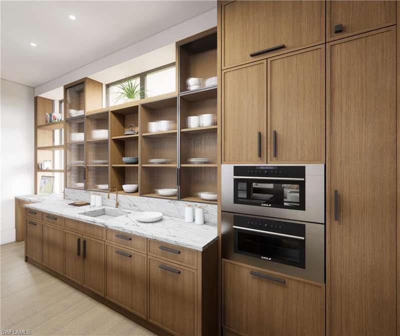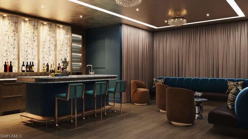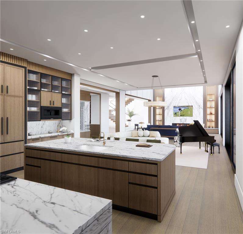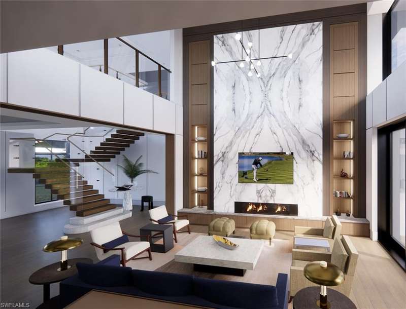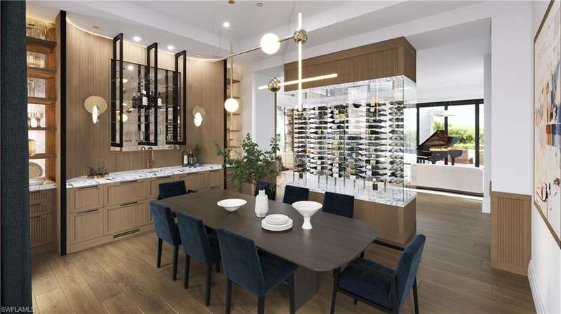 Commanding a rare, western lakefront view in Old Naples, this new construction estate redefines scale, craftsmanship, and architectural clarity. Encompassing over 9,400 square feet of interior living space, the home was conceived as a private resort - where every element supports both the grand and granular aspects of daily living. Twin infinity-edge reflecting pools frame the entrance, opening into a dramatic two-story great room with precision millwork, architectural symmetry, and a sculptural floating staircase. Adjacent, a formal dining room is anchored by a custom, glass-enclosed wine wall integrated into bespoke cabinetry. The kitchen, defined by a curved steel-and-glass partition, includes Wolf/Sub-Zero appliances, dual Miele coffee stations, and a concealed butler s pantry equipped for large-scale entertaining. Subtle finishes and architectural restraint elevate the overall atmosphere. The first-floor primary suite is entirely self-contained, featuring a private study, two over