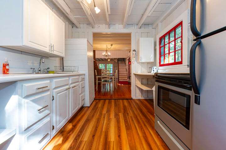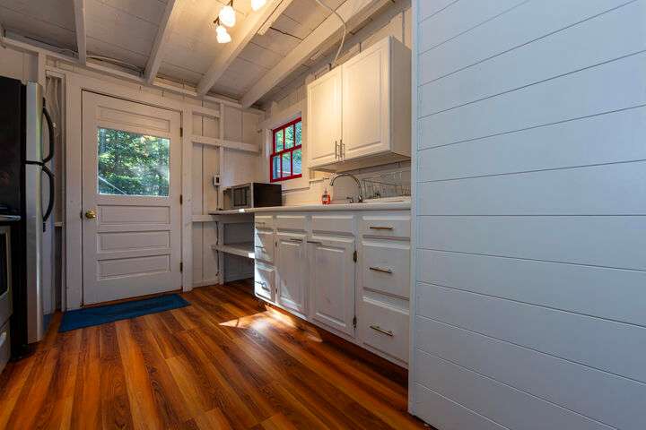 Super charming three season home in Salisbury Cove area of Bar Harbor. Open whitewashed stud walls and reclaimed architectural features create a special hideaway with a unique flair near Acadia National Park. It is just waiting for you to take the design vibe to your level. There is a first floor bedroom in addition to two lofts, one reached by stairs and one by ladder. It is the perfect escape with a beautiful fireplace and outdoor fire pit.
