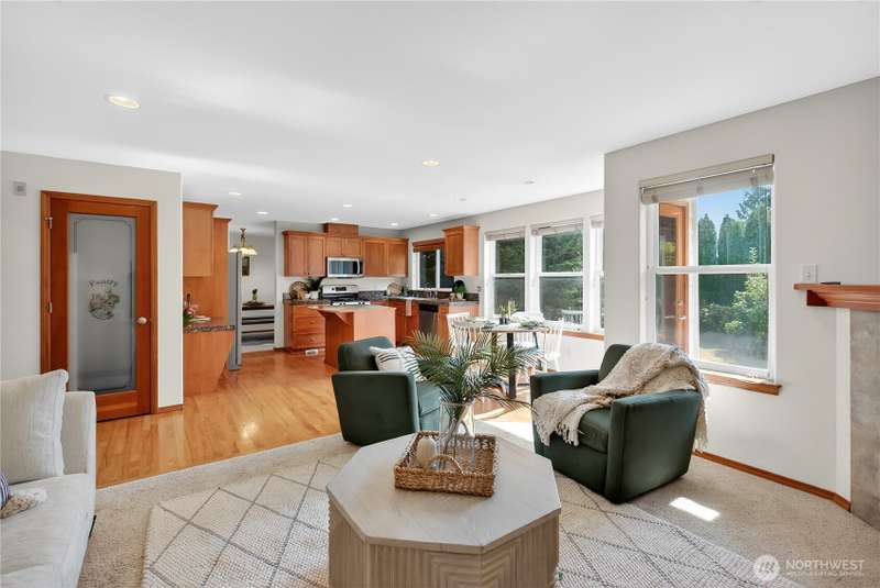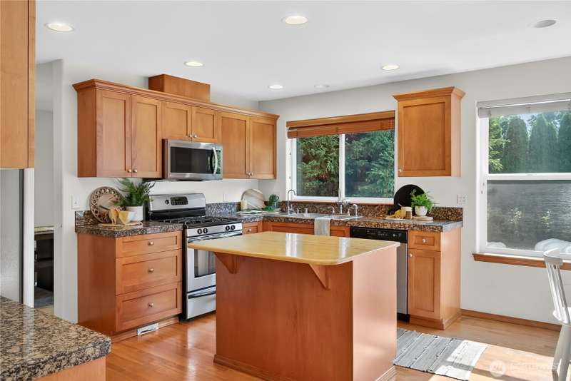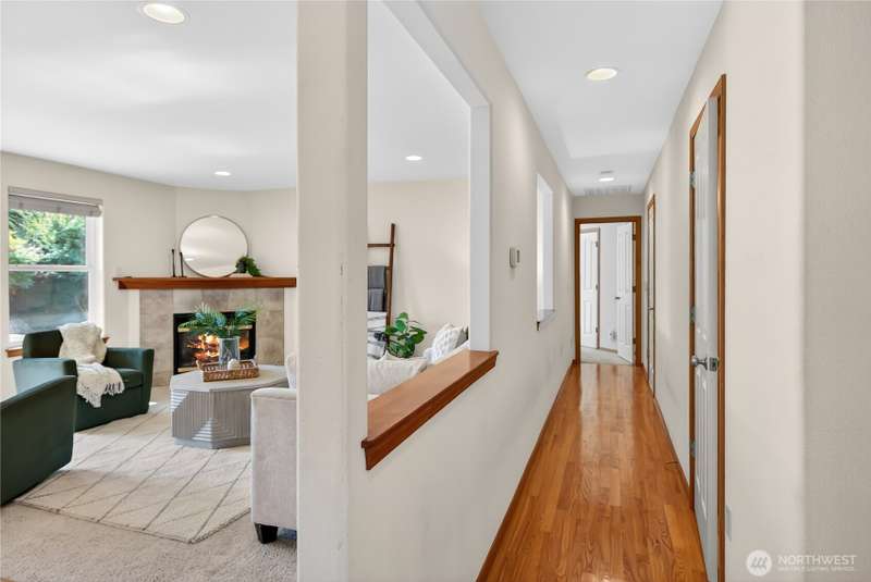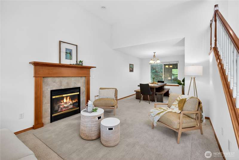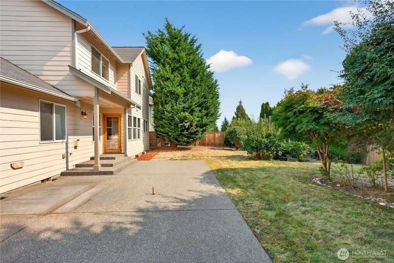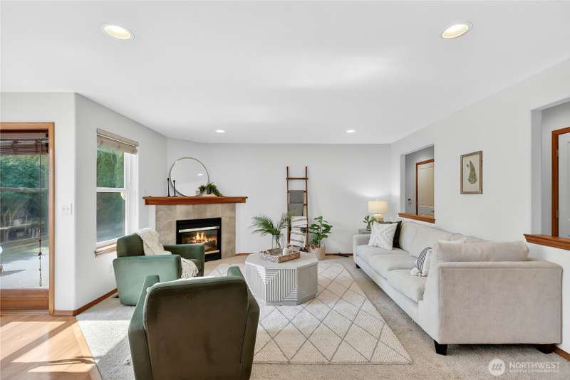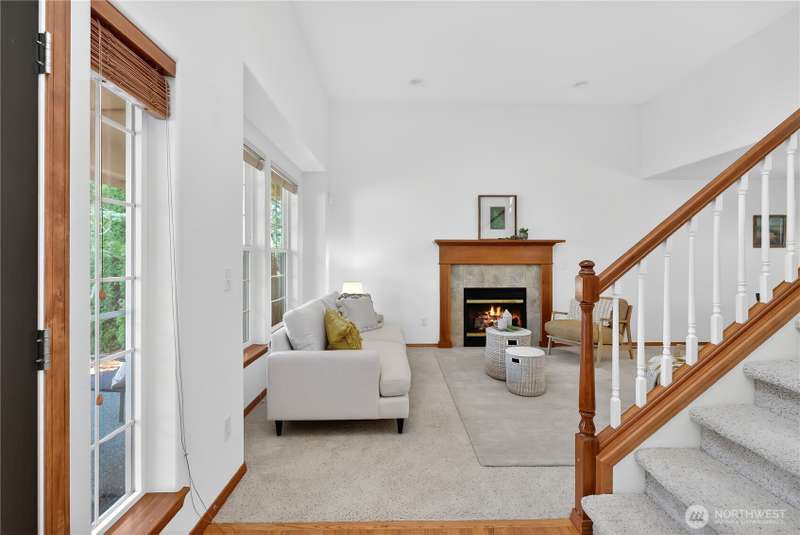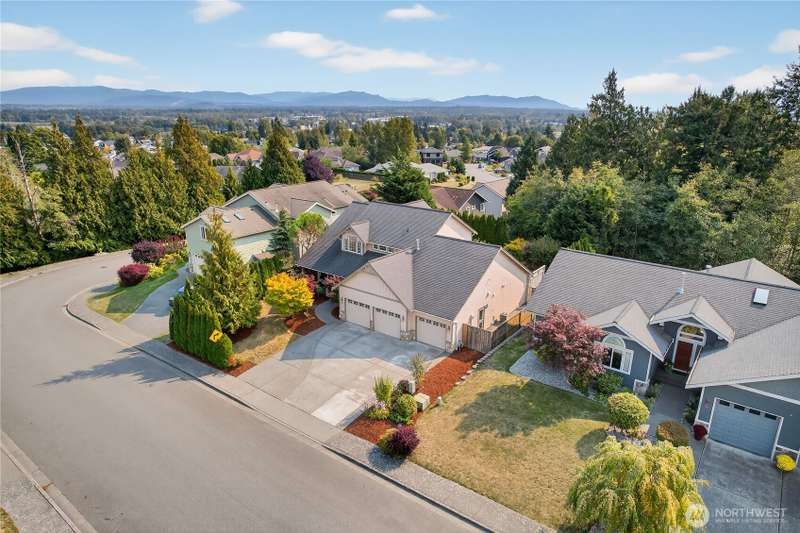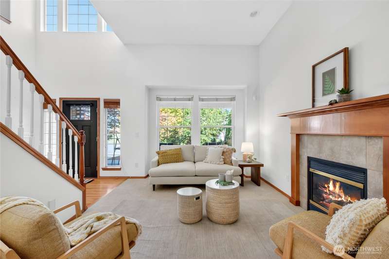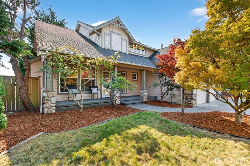 Set on a quiet street, this inviting home welcomes you with its covered front porch and thoughtful layout. The main level greets you with bright spaces, big windows, and tall ceilings to go along with its two living areas, primary suite with vaulted ceilings and walk-in closet, and main-floor laundry. The kitchen features granite counters, maple cabinetry, stainless appliances, and a walk-in pantry. Upstairs offers three bedrooms, a full bath, and an additional bonus living area, ensuring everyone has space to unwind. Step outside to a private, peaceful backyard to find a spacious patio along with garden space and fruit trees. Central air, a 3-car garage, hardwood floors, and two cozy gas fireplaces round out this well-designed home.