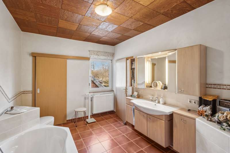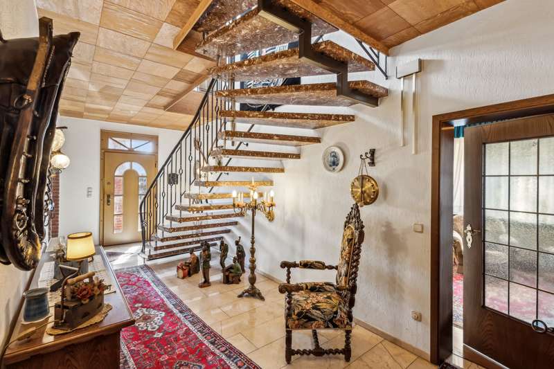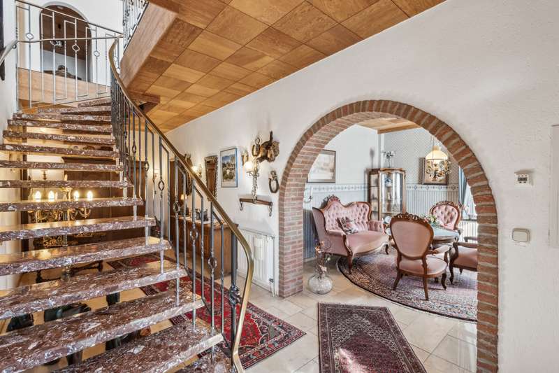 Property description: Today we present to you an exceptional business house that impresses with its high-quality construction and versatile use. This unique real estate ensemble combines luxurious living quality with first-class office space and is ideal for entrepreneurs looking for a prestigious address. Construction quality and fittings: The main building was constructed using a variety of high-quality materials that are both aesthetically pleasing and functional. Elegantly designed marble and parquet floors run through the entire first floor of the building and lend the rooms a sophisticated atmosphere. Special highlights are the tasteful ceilings with real wood paneling and the stylish bathrooms, some of which are fitted with elegant marble elements. The luxurious furnishings include: An impressive marble staircase Three spacious bathrooms A wellness area with sauna and plunge pool A modern wood-burning stove for cozy warmth and comfort Full cellar with an air-conditioned wine cellar It is difficult to describe the extensive furnishings in full, as they encompass so many facets that it would go beyond the scope of this article. This property offers unparalleled comfort and style. Office extension and flexible usage options: In addition to the main house, there is a high-quality converted office annex that once served as a blacksmith's shop. This area is also equipped with excellent materials and includes three further bathrooms. Two kitchenettes offer practical and attractive options for breaks. Thanks to the flexible design options, the office extension is ideal for various usage concepts - be it for start-ups, consultancies, creative offices, guest house, etc. Garages and other infrastructure: The ensemble includes two garages with electric doors, which are directly connected to the office extension, as well as two further spacious garages in a separate building. These not only offer sufficient space for vehicles, but also for storage and other uses. Conclusion: This exclusive business house with office extension is an outstanding overall package that combines versatile usage options and luxurious fittings. Don't miss out on this opportunity - arrange a viewing today and discover the potential of this exceptional property!
