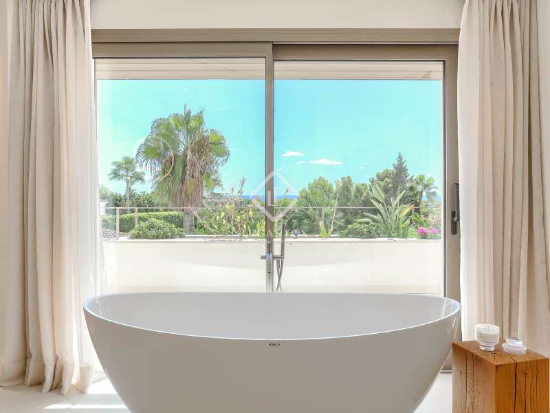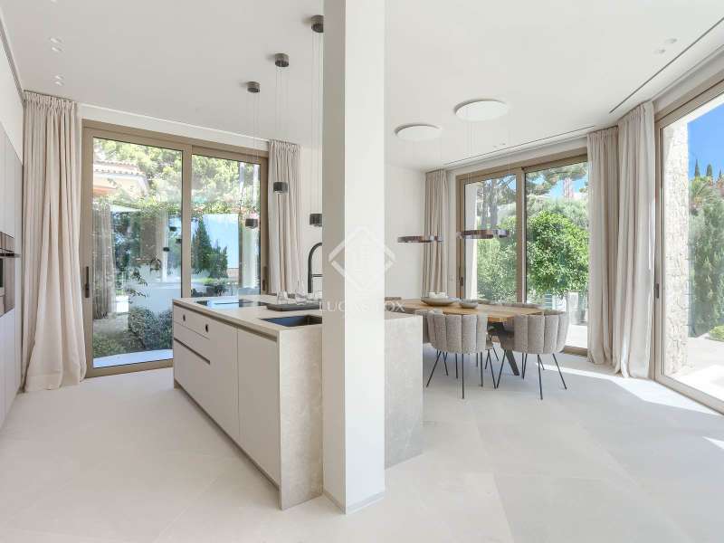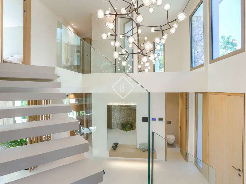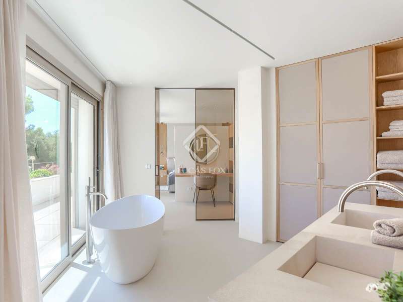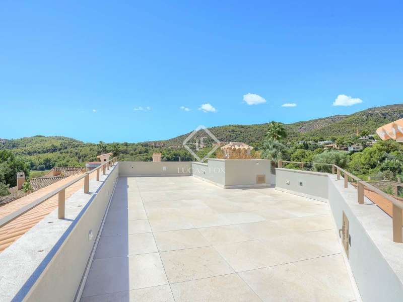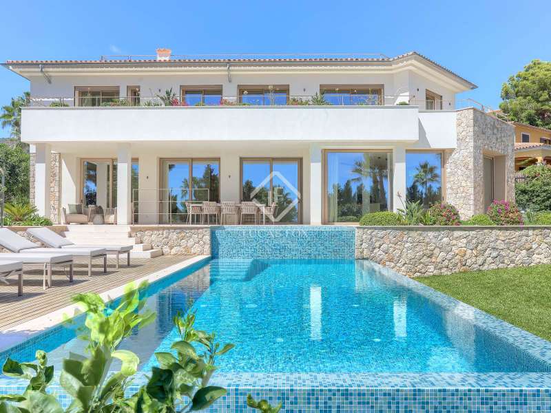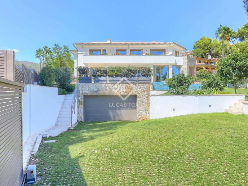 Lucas Fox Mallorca presents this sumptuous new villa located in Bendinat, one of the most sought-after locations on the island. Thanks to its slightly elevated position, the property offers spectacular views of the sea from the rooftop and the surrounding green countryside. The house has been designed to invite light to generously enter each room, thanks to large bay windows overlooking the exterior, enhanced by a landscaped garden designed to preserve perfect privacy. Spread over three levels, all served by an elevator, this villa fully meets the demands of luxury. The first level houses a wellness area with a gym, sauna, and bathroom. Wine lovers will appreciate the dedicated cellar. A garage can accommodate three vehicles, with interior access to all levels. The second floor comprises a spacious living room with a fully equipped modern kitchen, opening onto a first welcoming terrace, ideal for meals with family or friends, before reaching the idyllic pool area surrounded by vegetation. A first master suite completes this level. The top floor houses three bedrooms, each with its own bathroom and dressing room, including a spacious master suite opening onto a terrace with magnificent views. A rooftop terrace offers even more spectacular views for enjoying the sun in peace. Built with high-end materials, this villa offers unique comfort: air conditioning, salt-water infinity pool, wellness area, etc. Its privileged location gives you quick access to the renowned marina of Puerto Portals, famous for its luxury boutiques and prestigious restaurants. This property combines luxury, comfort and modernity for year-round living, thanks to its proximity to international schools, golf courses, hiking trails, tennis and padel clubs, the center of Palma and its airport, all in less than 20 minutes!!