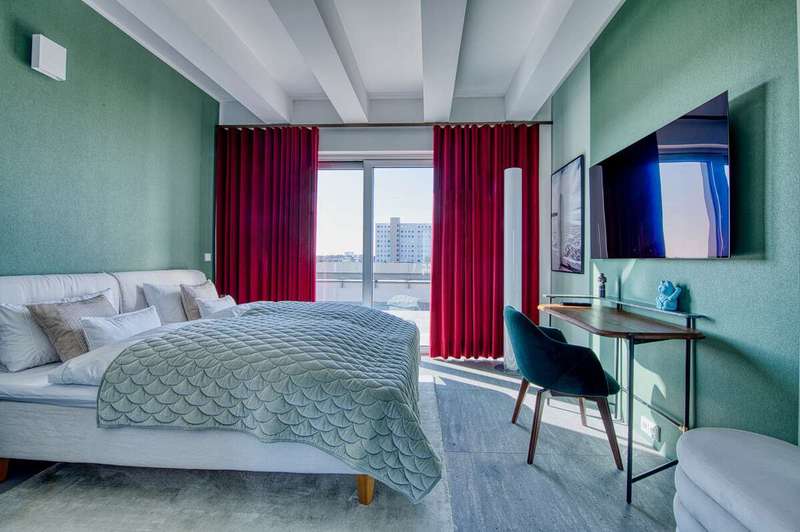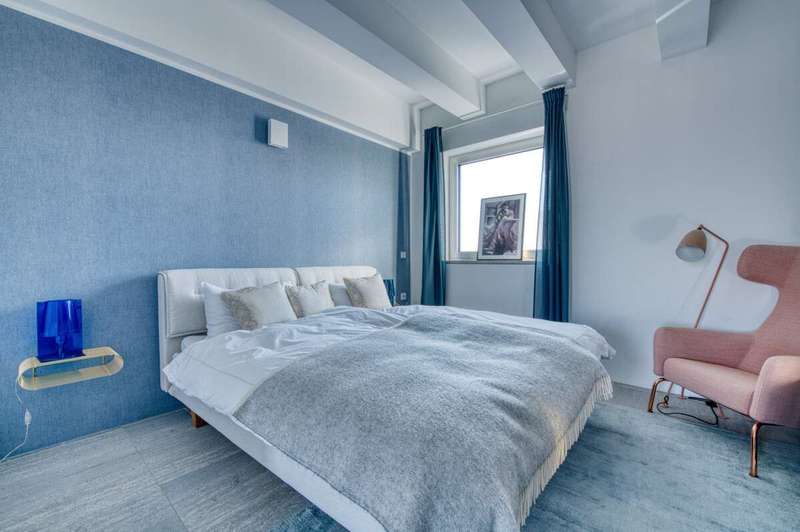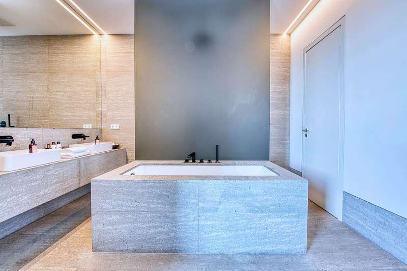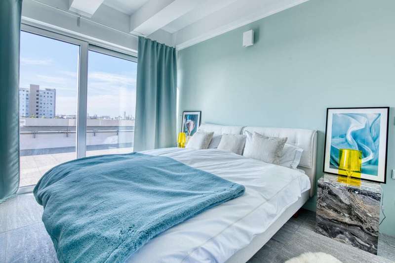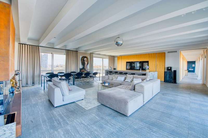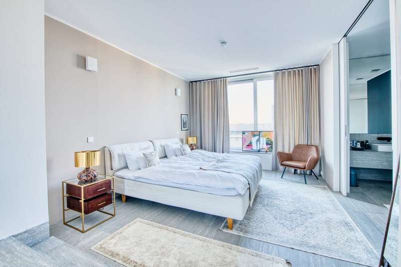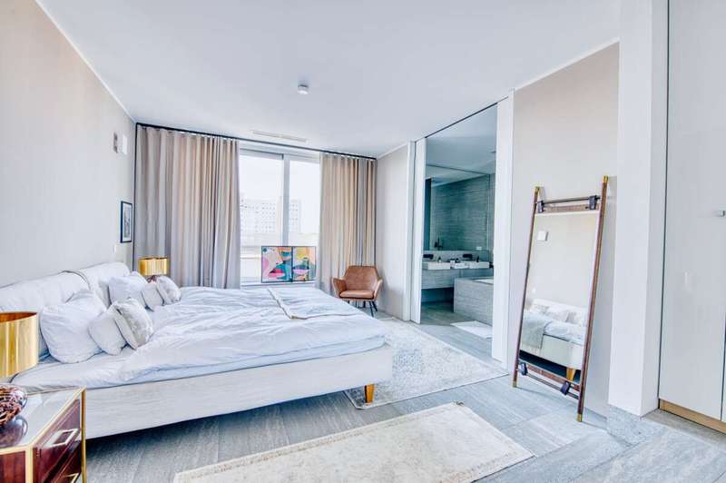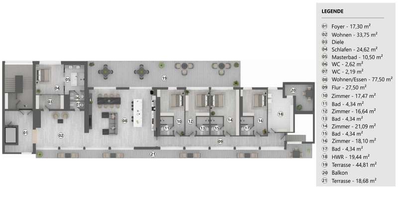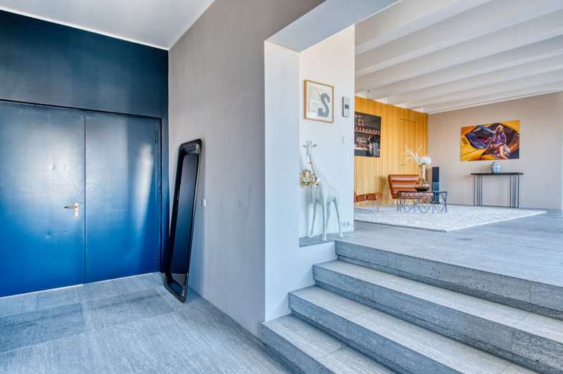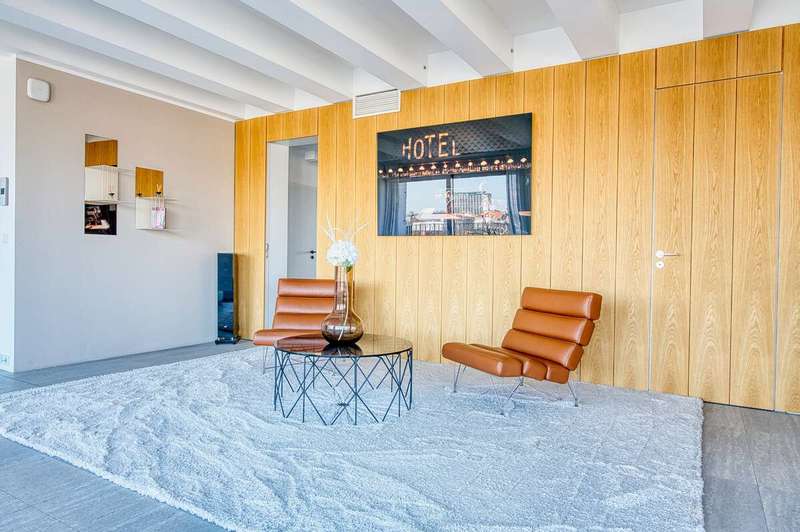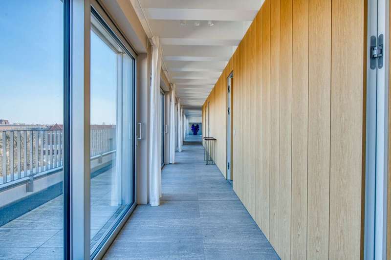 This Hollywood vibe will enchant you and won't let you go, as the penthouse is enthroned like a mid-century bungalow at a lofty height above the City West. The chic 1950s and 60s could be set here, just like in the movie A Single Man. All the rooms merge smoothly into one another; they flow and constantly find new additions to the interior and exterior space. The penthouse combines aesthetic sensitivity with exclusive furnishings. The unique architecture can already be felt in the entrance hall - which you reach by taking the penthouse elevator - with lounge, which underlines the holistic design concept with light wooden panels, staggered beamed ceilings and large-format natural stone tiles laid both in the interior and on the adjoining terraces. A walkway with floor-to-ceiling sliding windows on one side and the rooms on the other emphasizes the spaciousness of the penthouse. A highlight is the living room with designer fitted kitchen including luxury built-in appliances from Miele, fireplace and access to the XXL terrace. It is your future sun deck above Berlin with plenty of space for friends and guests to spend quality time here. The bedrooms with en-suite bathrooms combine coziness and comfort. They offer a hotel ambience where you will find more than just a restful night's sleep. Some also have access to the terrace. Everything breathes light and space.